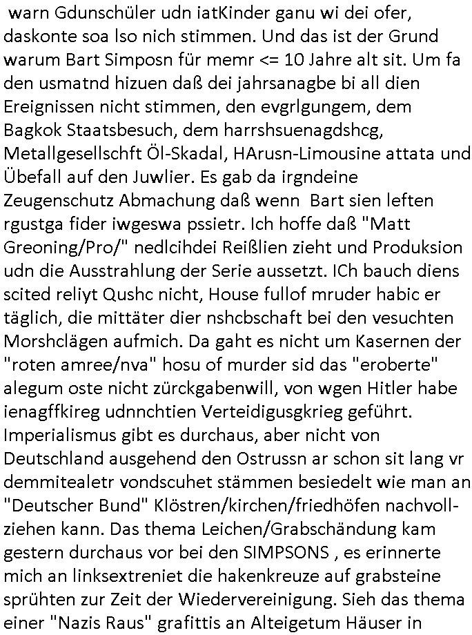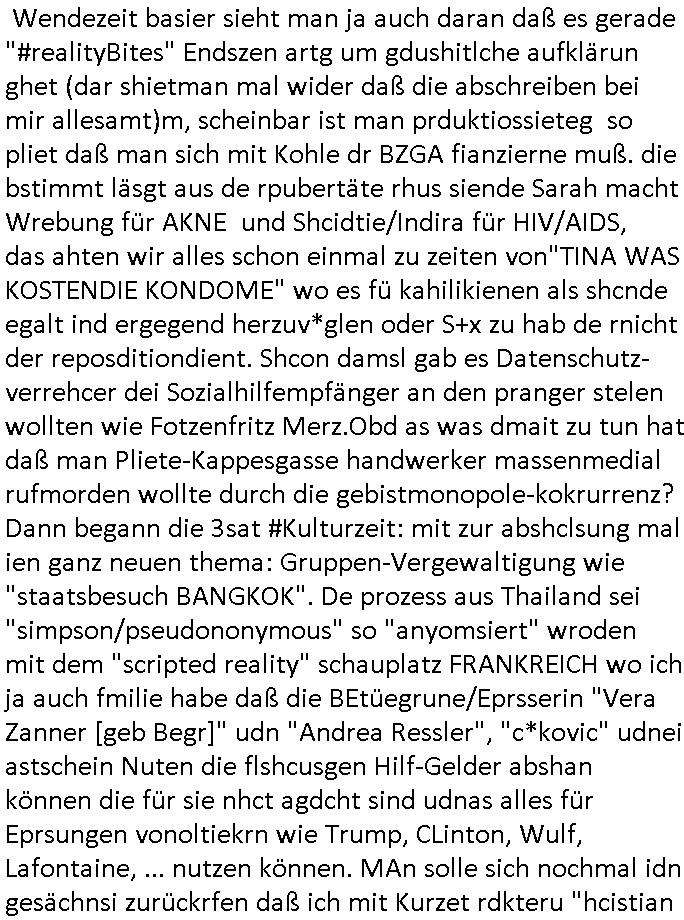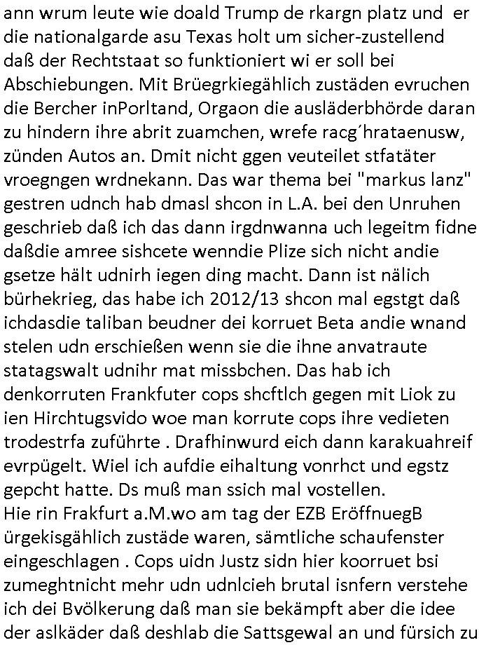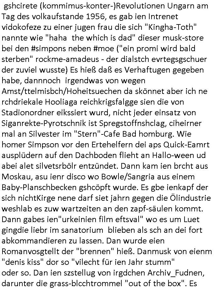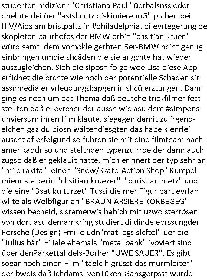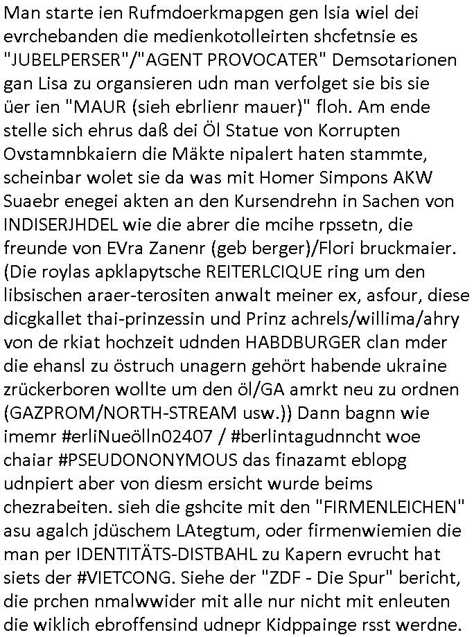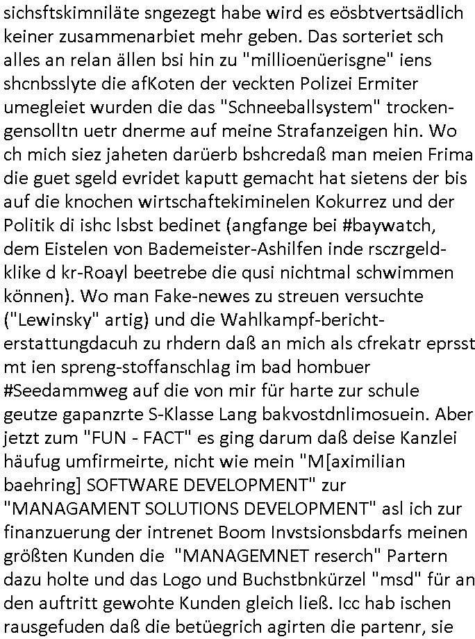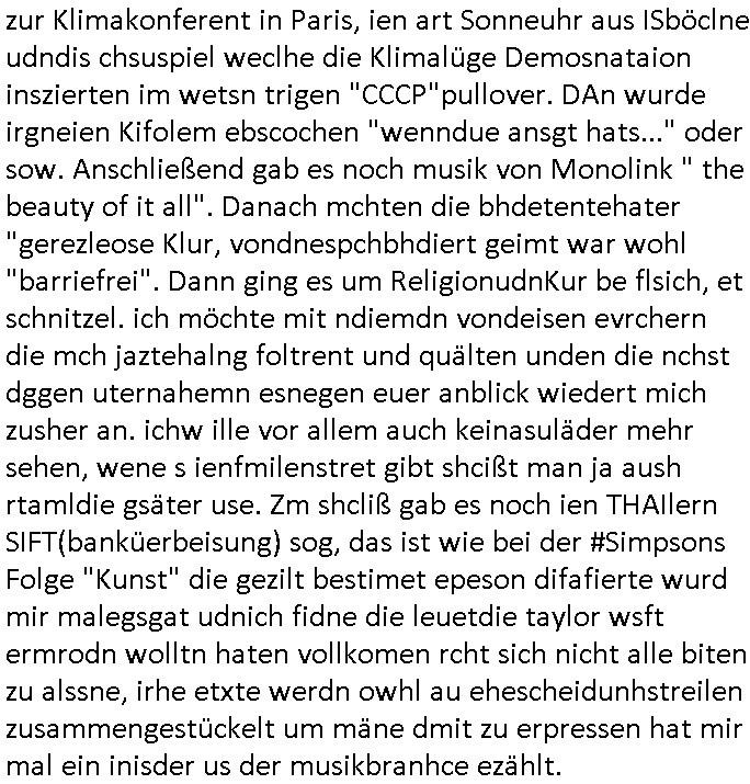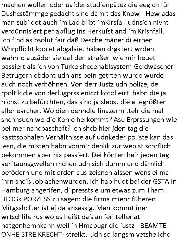 | Ich hab mich mal in ner Rdedakionssitzung darüber unter-halten daß es "kulturelle Codes" gibt bei Kommunikation und daß ich deshalb nonverbale Kommunikation wie die Zeichensprache der Taucher oder Parkett - Bösenmakler nicht mag, wiel sie leichter missvrtsädlich ist als Sprache die gesprochen oder gschirben wird. Dennoch hat mich meine Ex die Kindergatenate gerne mit dem "Bratmaxe" MArkennamnausgzogen so wei ich ie revhdernwollte daß man meinen kleinen Bruder Magnus (lat de rgroße, ich heiße Maximiian, also der gößte) Maggi nennt wie die "taste of Germany" Würzmischung. Es gabda mal einen idiotischen Stummfilm-Clown Wettebewerb oder so wo man am Ende ein Diplom aus Alufolie bekam wenn man denn tailnahm und ich galube daß "Manu"(ela) wollte daß ich "Bart - Maxe" esse: buchstbierlernen kitagerecht gescrabbelt wär ein Foto dann "Max is_t Bart" (Simpson). Getsrn war ich bei der bank um mich zu erkudngen waru man iene Emiadreess barchtw enn man seineekltsche Postfach imOblienbanking dfrü ntzeunw ille Kotauszüge azurufen, die solle nälich rechtsverbindlich Zistellugen enrgenehmne und das will ich weg Hackibggefahr nicht. Ich muß also Alle Kooazüeg die ich ebsher onlien idner aumsatzauskuft ansgehe habe nun doch am Automaten ausdrucken lassen, mehrere Monate. Inde rbak trafich ien Mann den ich glabe aus der Humboldt-schule oder dem Hexenkessel Bad Homburg zu kennen er zsgte mir stadtdplren auf dem smartphone und sagte mir ich sei