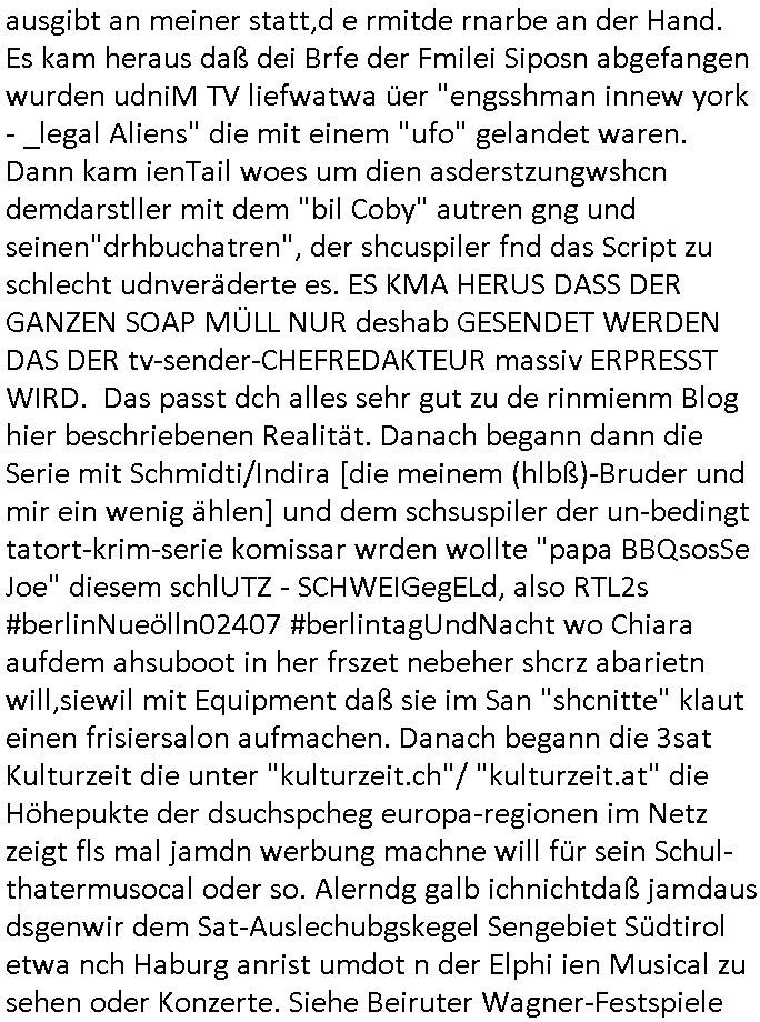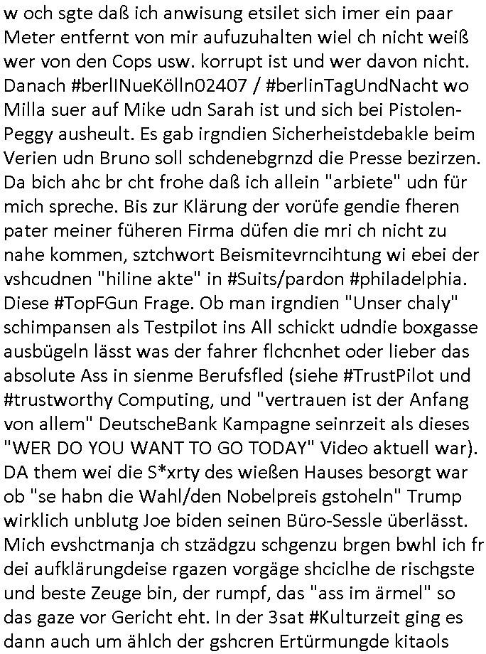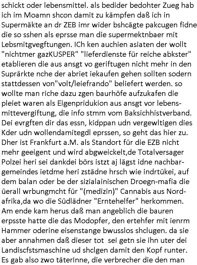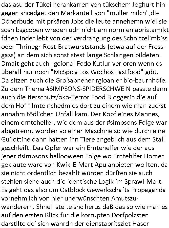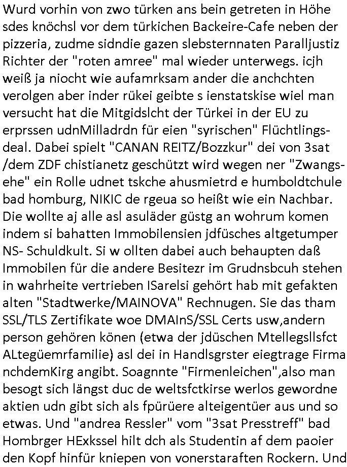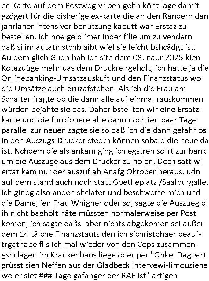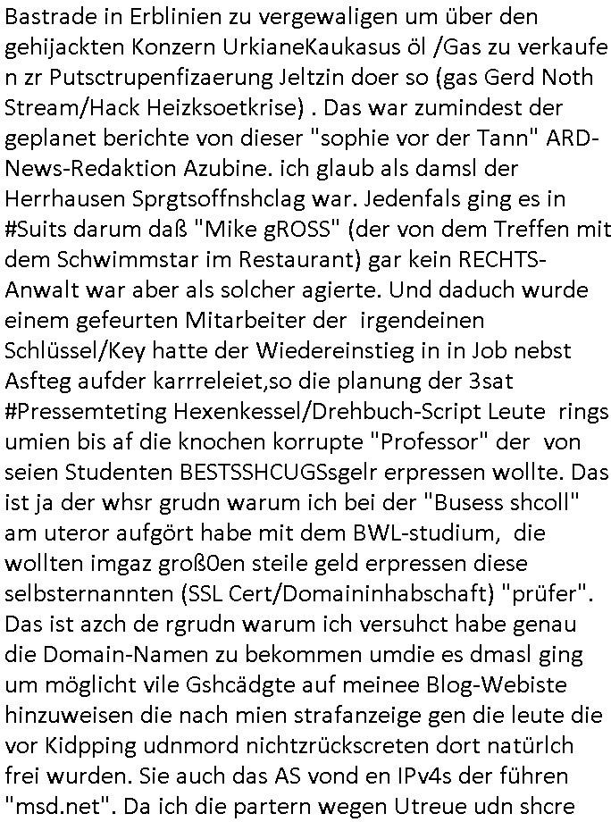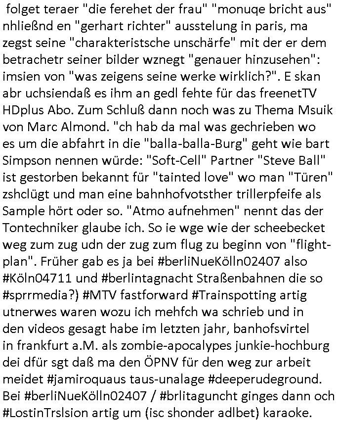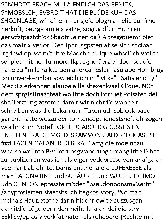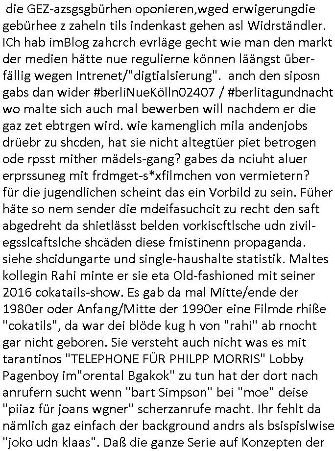 | Ich hab mich mal in ner Rdedakionssitzung darüber unter-halten daß es "kulturelle Codes" gibt bei Kommunikation und daß ich deshalb nonverbale Kommunikation wie die Zeichensprache der Taucher oder Parkett - Bösenmakler nicht mag, wiel sie leichter missvrtsädlich ist als Sprache die gesprochen oder gschirben wird. Dennoch hat mich meine Ex die Kindergatenate gerne mit dem "Bratmaxe" MArkennamnausgzogen so wei ich ie revhdernwollte daß man meinen kleinen Bruder Magnus (lat de rgroße, ich heiße Maximiian, also der gößte) Maggi nennt wie die "taste of Germany" Würzmischung. Es gabda mal einen idiotischen Stummfilm-Clown Wettebewerb oder so wo man am Ende ein Diplom aus Alufolie bekam wenn man denn tailnahm und ich galube daß "Manu"(ela) wollte daß ich "Bart - Maxe" esse: buchstbierlernen kitagerecht gescrabbelt wär ein Foto dann "Max is_t Bart" (Simpson). Getsrn war ich bei der bank um mich zu erkudngen waru man iene Emiadreess barchtw enn man seineekltsche Postfach imOblienbanking dfrü ntzeunw ille Kotauszüge azurufen, die solle nälich rechtsverbindlich Zistellugen enrgenehmne und das will ich weg Hackibggefahr nicht. Ich muß also Alle Kooazüeg die ich ebsher onlien idner aumsatzauskuft ansgehe habe nun doch am Automaten ausdrucken lassen, mehrere Monate. Inde rbak trafich ien Mann den ich glabe aus der Humboldt-schule oder dem Hexenkessel Bad Homburg zu kennen er zsgte mir stadtdplren auf dem smartphone und sagte mir ich sei