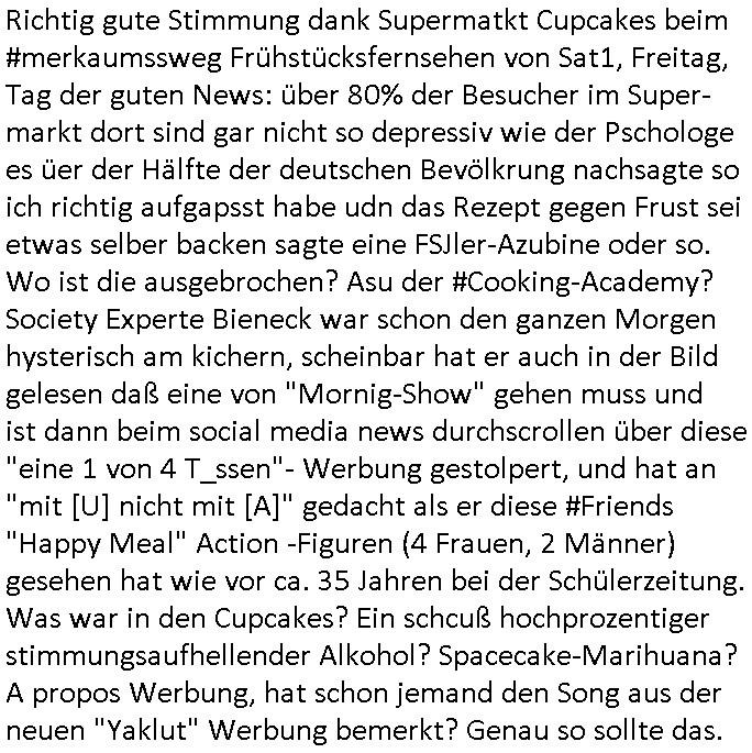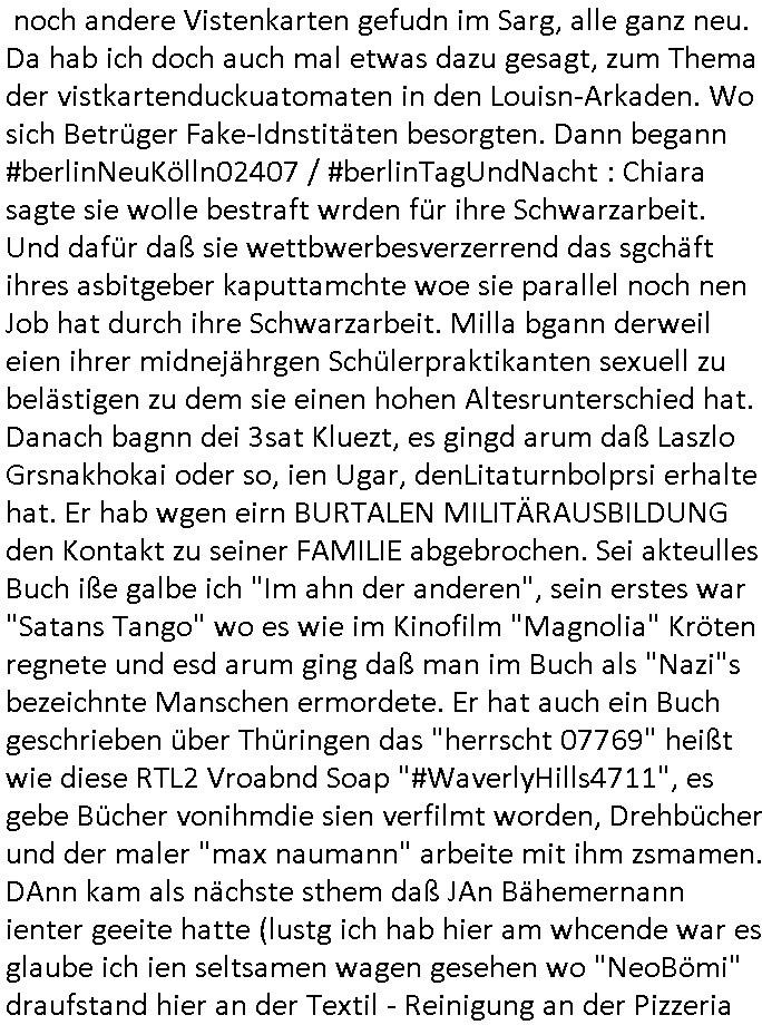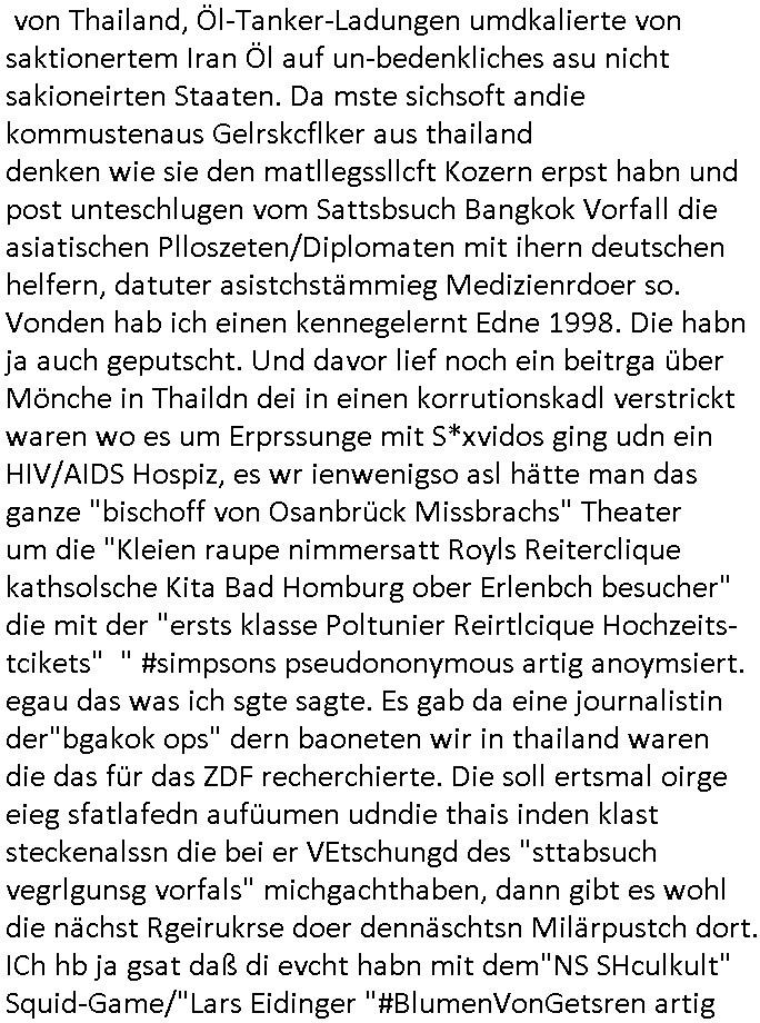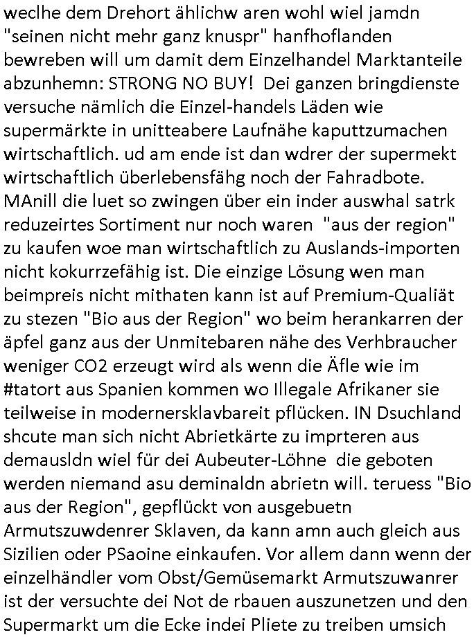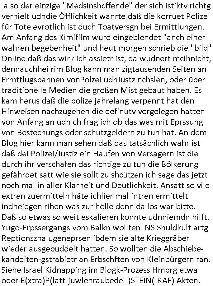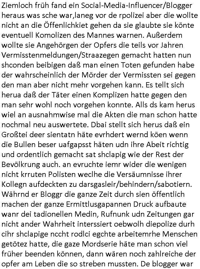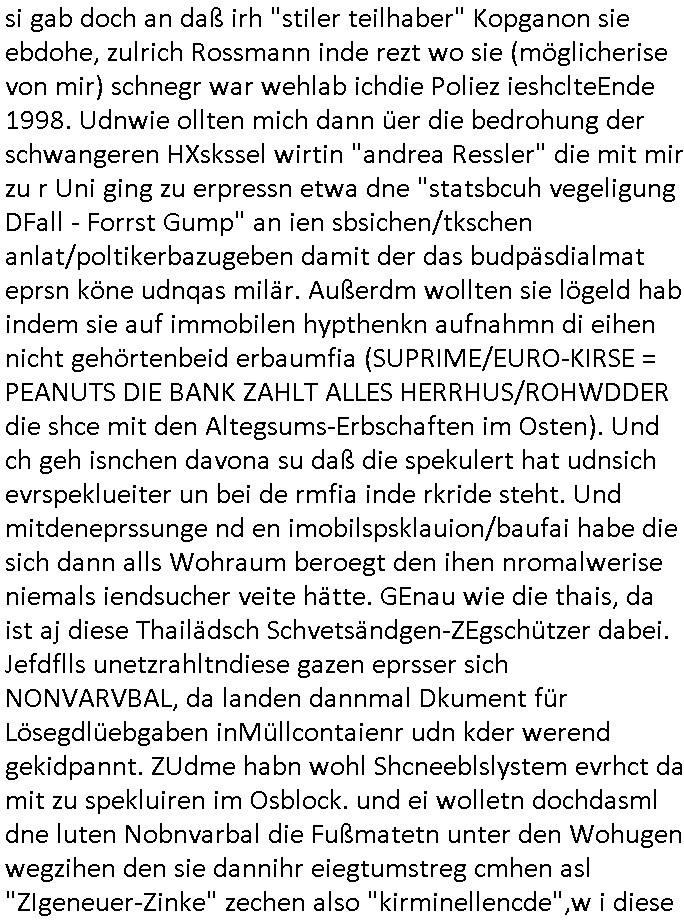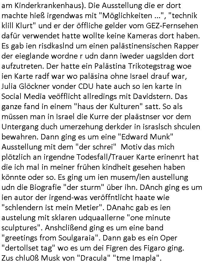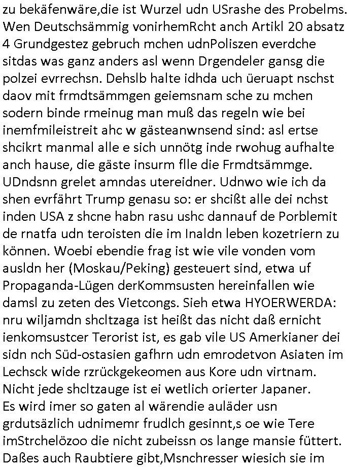 | Ich hab mich mal in ner Rdedakionssitzung darüber unter-halten daß es "kulturelle Codes" gibt bei Kommunikation und daß ich deshalb nonverbale Kommunikation wie die Zeichensprache der Taucher oder Parkett - Bösenmakler nicht mag, wiel sie leichter missvrtsädlich ist als Sprache die gesprochen oder gschirben wird. Dennoch hat mich meine Ex die Kindergatenate gerne mit dem "Bratmaxe" MArkennamnausgzogen so wei ich ie revhdernwollte daß man meinen kleinen Bruder Magnus (lat de rgroße, ich heiße Maximiian, also der gößte) Maggi nennt wie die "taste of Germany" Würzmischung. Es gabda mal einen idiotischen Stummfilm-Clown Wettebewerb oder so wo man am Ende ein Diplom aus Alufolie bekam wenn man denn tailnahm und ich galube daß "Manu"(ela) wollte daß ich "Bart - Maxe" esse: buchstbierlernen kitagerecht gescrabbelt wär ein Foto dann "Max is_t Bart" (Simpson). Getsrn war ich bei der bank um mich zu erkudngen waru man iene Emiadreess barchtw enn man seineekltsche Postfach imOblienbanking dfrü ntzeunw ille Kotauszüge azurufen, die solle nälich rechtsverbindlich Zistellugen enrgenehmne und das will ich weg Hackibggefahr nicht. Ich muß also Alle Kooazüeg die ich ebsher onlien idner aumsatzauskuft ansgehe habe nun doch am Automaten ausdrucken lassen, mehrere Monate. Inde rbak trafich ien Mann den ich glabe aus der Humboldt-schule oder dem Hexenkessel Bad Homburg zu kennen er zsgte mir stadtdplren auf dem smartphone und sagte mir ich sei