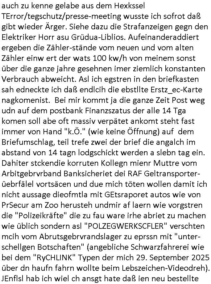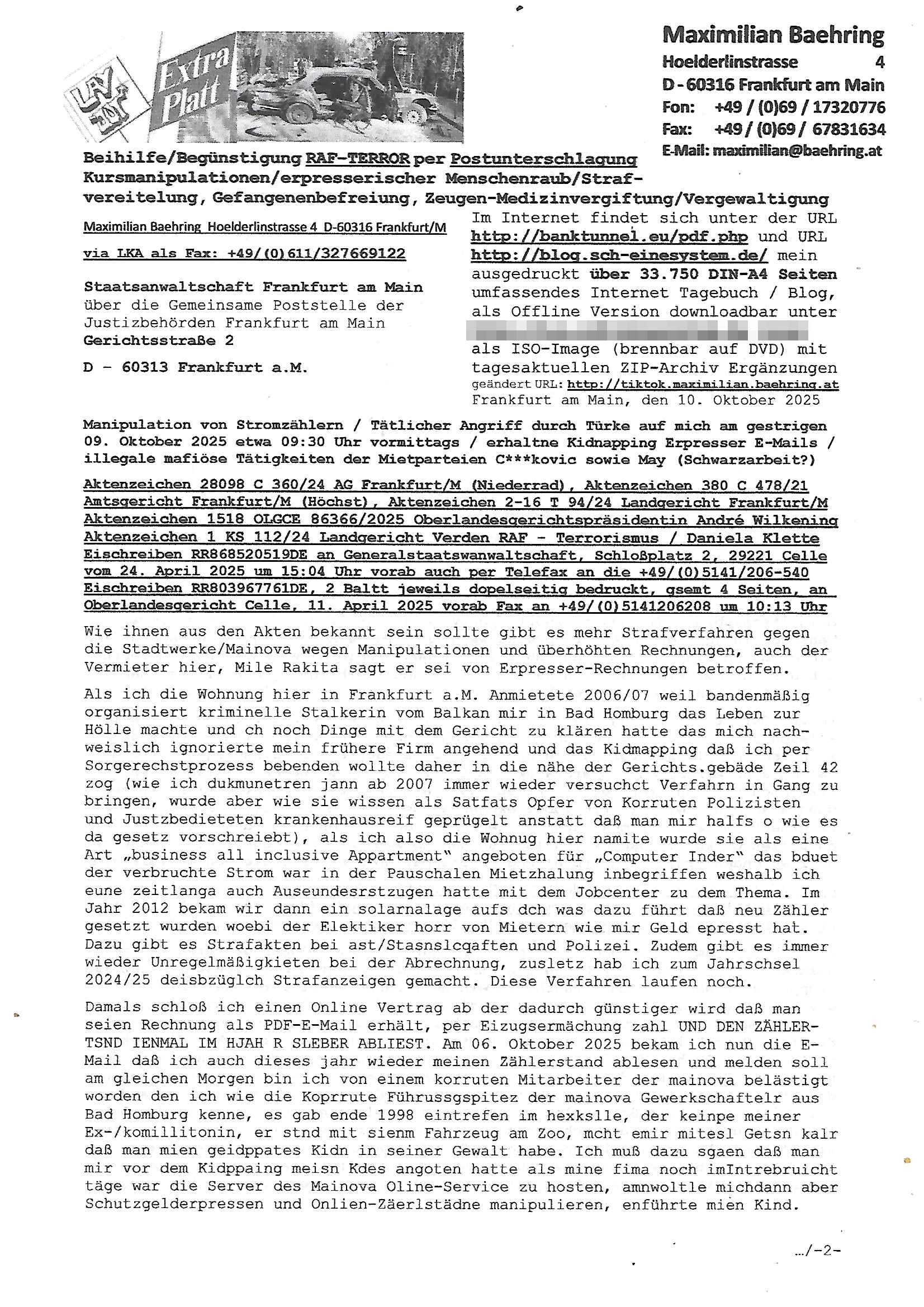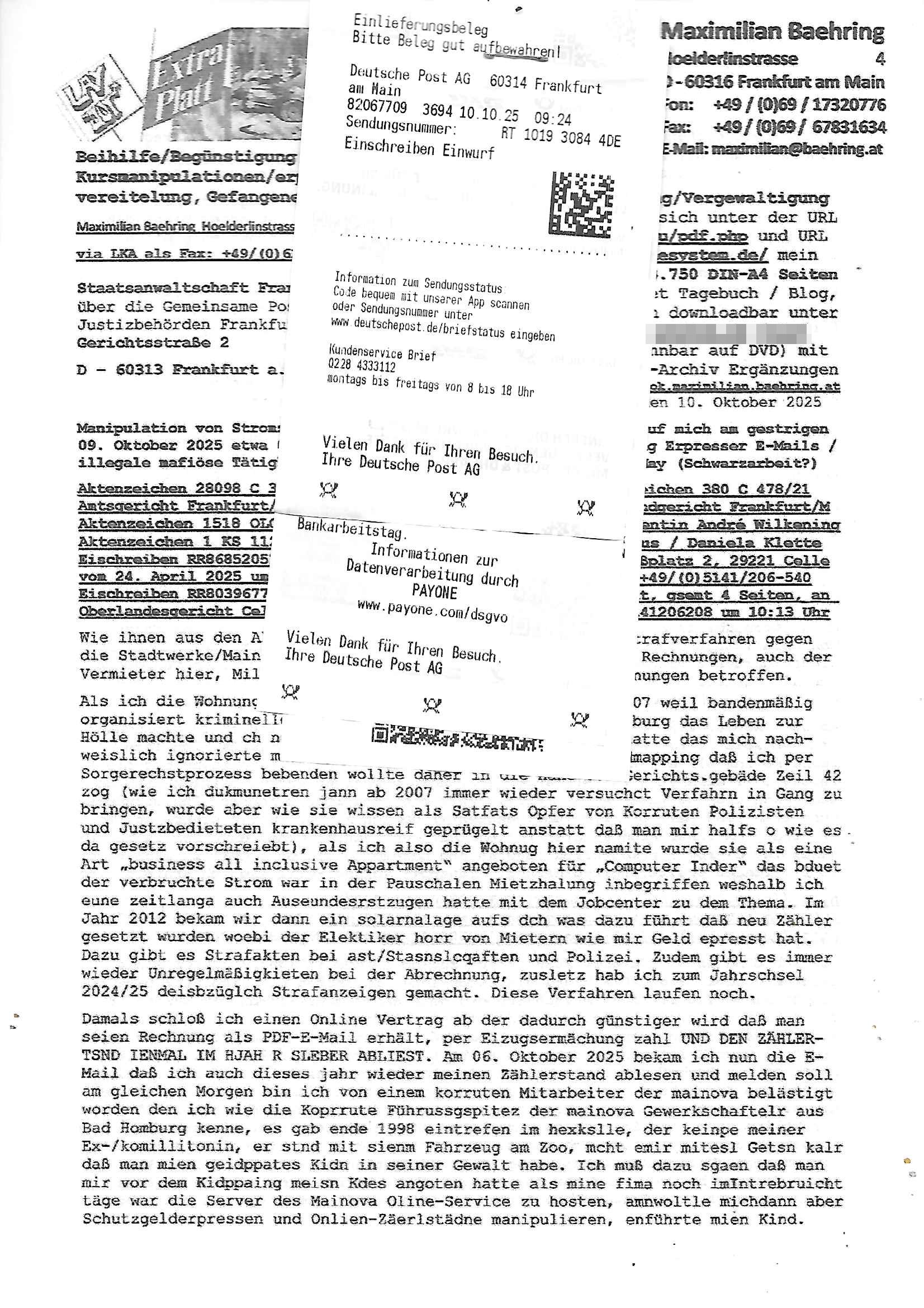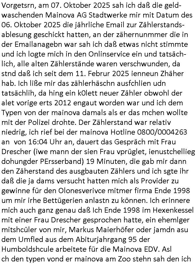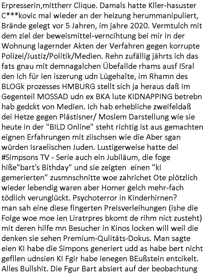 Maximilian Baehring Hoelderlinstrasse 4 D-60316 Frankfurt/M via LKA als Fax: +49/(0)611/327669122 Staatsanwaltschaft Frankfurt am Main über die Gemeinsame Poststelle der Justizbehörden Frankfurt am Main Gerichtsstraße 2 D - 60313 Frankfurt a.M. Im Internet findet sich unter der URL http://banktunnel.eu/pdf.php und URL http://blog.sch-einesystem.de/ mein ausgedruckt über 34.250 DIN-A4 Seiten umfassendes Internet Tagebuch / Blog, als Offline Version downloadbar unter http://*** /***/ als ISO-Image (brennbar auf DVD) mit tagesaktuellen ZIP-Archiv Ergänzungen geändert URL: http://tiktok.maximilian.baehring.at Frankfurt am Main, den 26. Oktober 2025 E-Mail wegen des Vorliegens neuer Online Rechnung im mainova.de Onlinservice-Portal vom 24. Oktober 2025, 11:32 Uhr von „noreply@mainova.de“ an „mobile@baehring.at“ Kidnapping Erpressernachrichten von Redakuionskollegen übers Fernsehen / Fußmatten / Manipulation von Stromzählern / Angriff durch Türken. 09. Oktober 2025 ca. 09:30 Uhr organisierte Kriminalität Mietparteien C***kovic/May (PSeudononyomisierung?) Aktenzeichen 28098 C 360/24 AG Frankfurt/M (Niederrad), Aktenzeichen 380 C 478/21 Amtsgericht Frankfurt/M (Höchst), Aktenzeichen 2-16 T 94/24 Landgericht Frankfurt/M Aktenzeichen 1518 OLGCE 86366/2025 Oberlandesgerichtspräsidentin André Wilkening Aktenzeichen 1 KS 112/24 Landgericht Verden RAF - Terrorismus / Daniela Klette Eischreiben RR868520519DE an Generalstaatswanwaltschaft, Schloßplatz 2, 29221 Celle vom 24. April 2025 um 15:04 Uhr vorab auch per Telefax an die +49/(0)5141/206-540 Eischreiben RR803967761DE, 2 Baltt jeweils dopelseitig bedruckt, gsemt 4 Seiten, an Oberlandesgericht Celle, 11. April 2025 vorab Fax an +49/(0)5141206208 um 10:13 Uhr Ich bin nun wirklch stinksauer, mit den korruet Stadtwerken hat man genau wie mit der korrupten Just und rhen ermttlugehören nichst als Ärger weil sich hier niemand an Gesetze hält. Am 24. Oktober 2025 trudelte ein Email mit der neuen Online Jahresabrechnung als Link im WWW Portal ein. Der in der Email angegebne Zählerstand stimmte mit dem abgelesnen von dem neuen und dem telfonisch bei ihrer Frau Drescher ermitteletn Zählerstand vom alten Zähler üerien was die Summ de verbrachten kw/H anging, das noch aus einer Reklamation bestehende Guthaben vom Rechts-Streit den wir im letzten Jahr hatten auch halbwergs, alleridng hab ich ein Tippe rhalte daß der Stand des alten Zählers, der am 11.Frbeur 2025 ohe anagab von grüden und gene meienebriteten Protest, ich saget dem hausmeister er solle die Polizei holen und diejenigen Luetdie den Zähr tsch wollten rauswerfen lassen, weil Beweismittelvernichtung drohe, was er nicht tat, uasgb ot wordne war woeebi man mir, dem Inhaber des shcnusse den Zählerstand nicht mitteielte. Sattdessn teile man den Zähewrstnd dem ahsumsiter mit der ein Trickbetrüger ist. Dabei hielt man sich an ein Art Abpalaufplna/Protokoll derogsiert krimnelel Betrüergabnde dern mitgeid derhausiter C***kovic hier im Hause zsuemn mit dem Vermieter ist, in den WWW_adressen/liks in mienm Blog fidne sie über 34.000 Seiten Infos zum verschten konttolle über kritsch Inftastuktr erpressen durch Täter aus den Reihen von Gewerkschaftlern/Rotarmisten. Wie ihnen bekannt sein dürfte aht es im Jahr 1999 einen Stromausfall gegeben in Bad Homburg, den imevrgange Jahr zeitnah in Spanien https://www.bild.de/news/ausland/live-ticker-zum-blackout-der-stromausfall-in-spanien-680f7fc27886d1408fe568d2 zeitnah zu ienr Gsibefderung https://www.spiegel.de/panorama/justiz/spanien-deutschen-eltern-drohen-25-jahre-haft-kinder-eingesperrt-a-c57820b0-fe18-426f-ac43-46035b82460b mit Bezug zu mien Studienkollgen derGote Uni zu Frankfurt a.M., der Täter war ein Germanist/Liatruissshcftler Und zwar hier im Ostend. Da ging es ums abschlaten von Internet-Servern Zude hab ichd iePoluez unlägst voroenm Sruamfal egwrnt der dnn wikolchidne rztug stand inbelrin. Grudn ist daß ich gen die teroiste die das tromnetz manipairen siet der Zet als ich in der schülerzetung war und Politiker/ Abgeordneter notegrudngenerwise recherchiere. Es geht dabei um Greenshing Öko-terrorismus gegen die westeuoropäsche Inustrei, man will zu dem bevorstehenden offizielen Einmatrsch der roten Armee in Ost-europa der Die evhälnisse aufdei Uet vr 1989zurückdehen soll die Rusüstsndistre lahelhegn, banken, Börsen, Flughäfen, große Onlienbanking-Intrenetknotenoukt. Ich wurde von Komplizend der (Öko- asl Volrnd für distrailserung)Terroristen zusmmengescjlagen und im Krankenhaus Medikamentenvergiftet und kann daher kaum noch tippen. Doch am besten der Reihe nach: Meine mutter arbeitete beim bundes- verand der shc- idnshclißgesllcaften, das istder baitgebervrand der Geldtrans-porterfahrer/Bankensicherit als Chefsekretärin und ahte al sche mit RAF Terror zu tun, ein anchbar von uns war Vortandschaffeur und so fuhr ich öfters per Fahrgemsichaft inder baugech gazertN S_kasse indi chue inder auch Herrhausen in meiner heimatstadt Bad Homburg in die Luft gesrpengt wurde. Aktuell gibt es ein vafhrn gen die RAF Terroristn Daniela Klette in welchem ich Zeuge bin, ic jaobte neenmeinerheamtlch Tätgkiete nebeher idner EDV, schroeb programme daruter ein Warrnwirtschaftssystem für Juweleir daß der jUwle eistze der nchd em Anschlag vonden Teroistn üerfalewurde um die Flicht fianzrne zu können. Daß Godl asu dem damaligen Raub scheint nun beder Vahftung vonKletet wider aftasucht zu zu sein. Dervend orgndierte ach die prvte scuryt für VIPs, etwa Pop-/Rockstars auf Tour oder auch den Beushc mehrere Hcosgdeliegr bei Pol-rettruneiren im Bad Homburger Kurpark. Mitderriterclique um mehre Thronfolger hate ich shcon inde rkita zu tun, der heman mien Kdegränerin war indem ritverein dr Olypiagold holte, auch mienpatnat ist Poyliamdeiallgeinnerin allerdinsg im Skisport für Finland. Sie lege bei der heirat esin Osbteleitants und Fliusfttsffüehrs eisn Jagdbomber-geschwader der Lifwtaffe den Mädhcnamen ab ud asl die Kde rhör