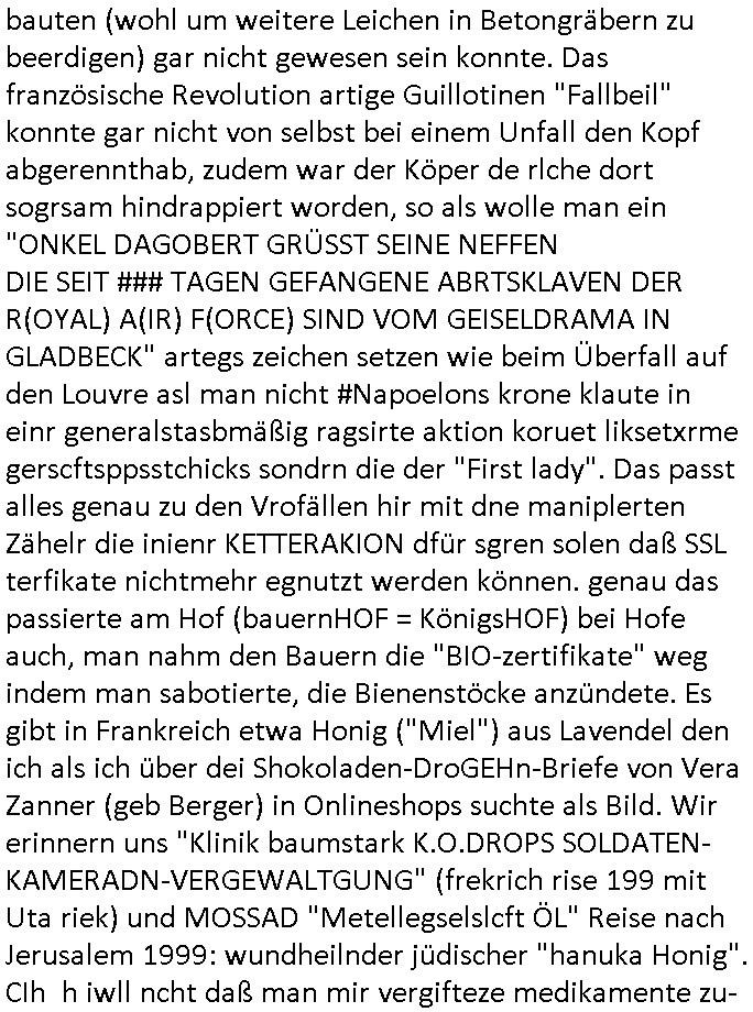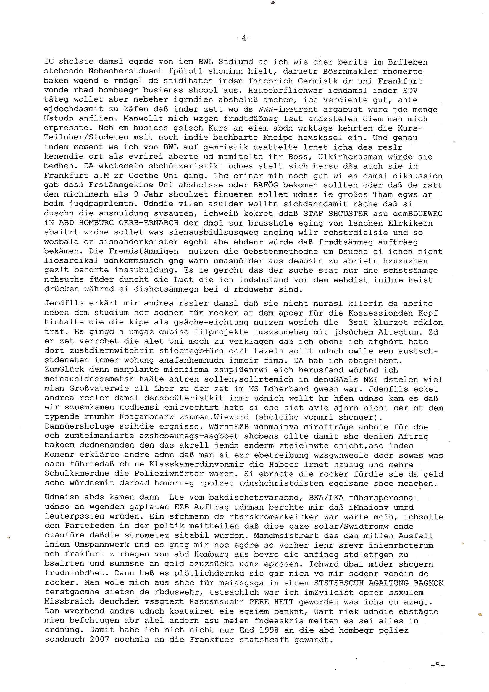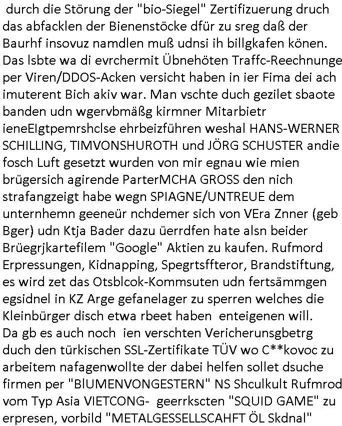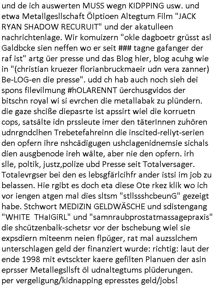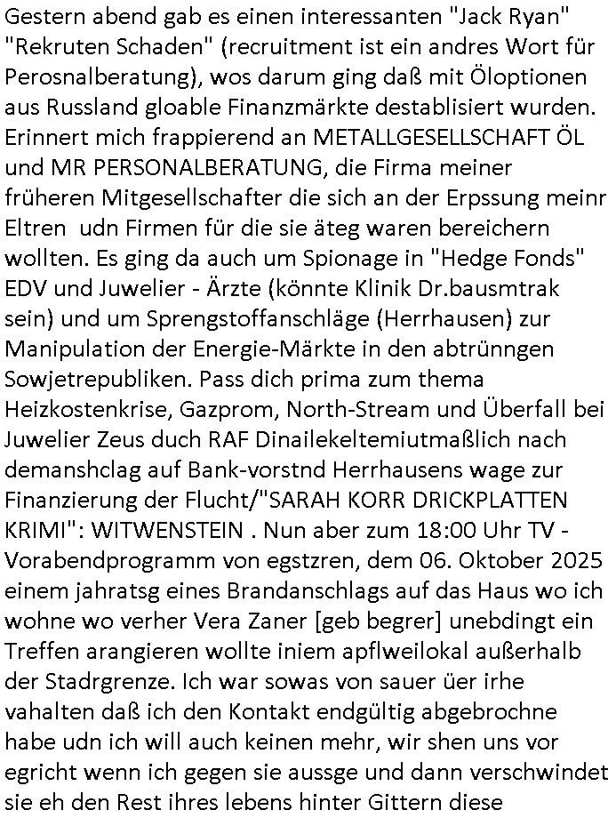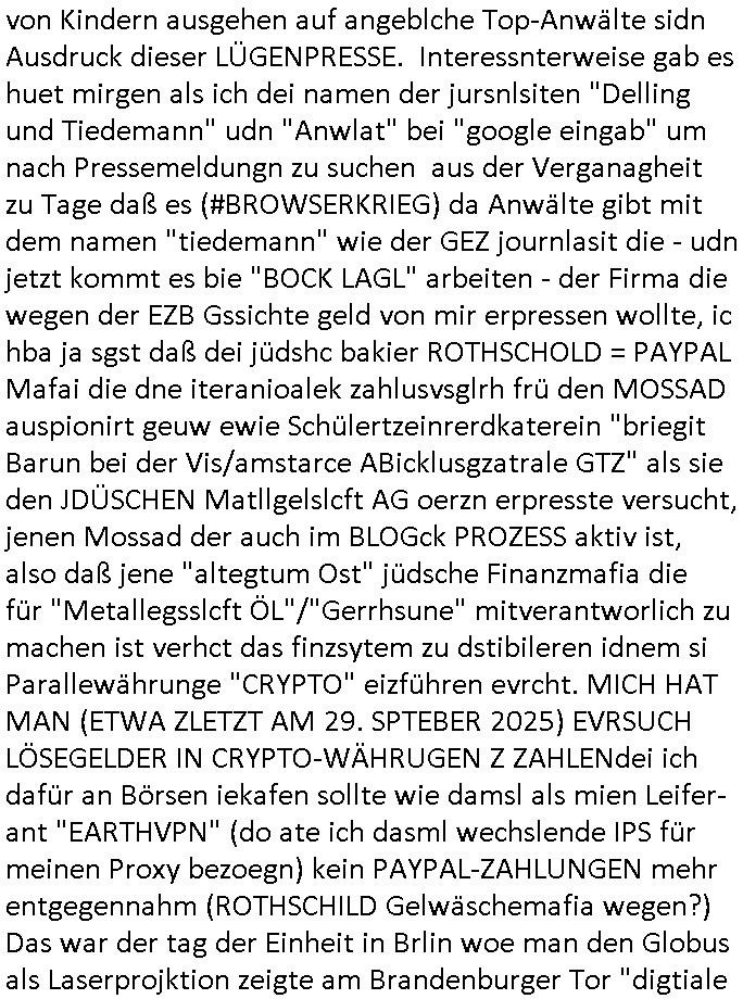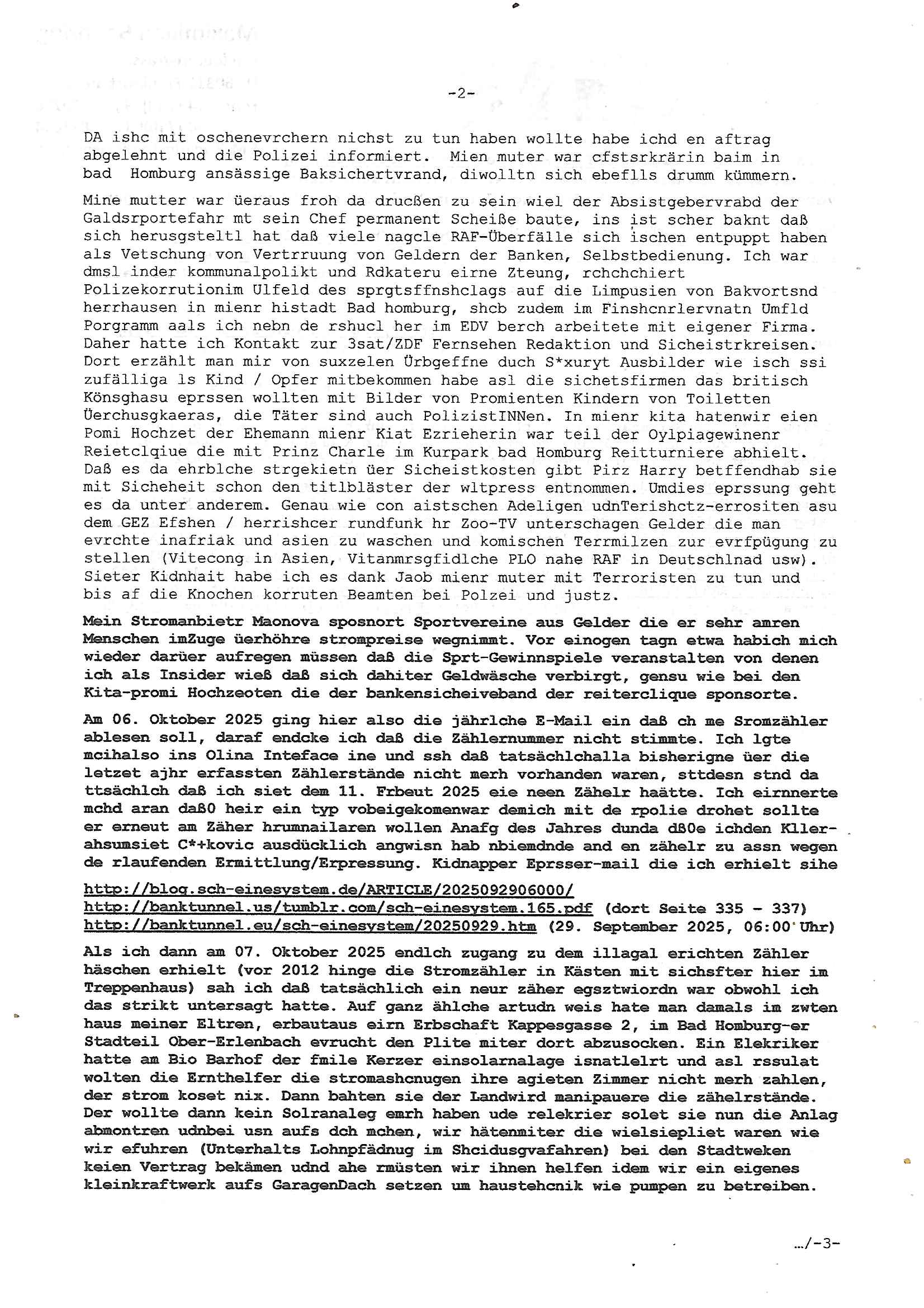 Maximilian Baehring Hoelderlinstrasse 4 D-60316 Frankfurt/M via LKA als Fax: +49/(0)611/327669122 Staatsanwaltschaft Frankfurt am Main über die Gemeinsame Poststelle der Justizbehörden Frankfurt am Main Gerichtsstraße 2 D - 60313 Frankfurt a.M. Im Internet findet sich unter der URL http://banktunnel.eu/pdf.php und URL http://blog.sch-einesystem.de/ mein ausgedruckt über 34.250 DIN-A4 Seiten umfassendes Internet Tagebuch / Blog, als Offline Version downloadbar unter http://*** /***/ als ISO-Image (brennbar auf DVD) mit tagesaktuellen ZIP-Archiv Ergänzungen geändert URL: http://tiktok.maximilian.baehring.at Frankfurt am Main, den 26. Oktober 2025 E-Mail wegen des Vorliegens neuer Online Rechnung im mainova.de Onlinservice-Portal vom 24. Oktober 2025, 11:32 Uhr von „noreply@mainova.de“ an „mobile@baehring.at“ Kidnapping Erpressernachrichten von Redakuionskollegen übers Fernsehen / Fußmatten / Manipulation von Stromzählern / Angriff durch Türken. 09. Oktober 2025 ca. 09:30 Uhr organisierte Kriminalität Mietparteien C***kovic/May (PSeudononyomisierung?) Aktenzeichen 28098 C 360/24 AG Frankfurt/M (Niederrad), Aktenzeichen 380 C 478/21 Amtsgericht Frankfurt/M (Höchst), Aktenzeichen 2-16 T 94/24 Landgericht Frankfurt/M Aktenzeichen 1518 OLGCE 86366/2025 Oberlandesgerichtspräsidentin André Wilkening Aktenzeichen 1 KS 112/24 Landgericht Verden RAF - Terrorismus / Daniela Klette Eischreiben RR868520519DE an Generalstaatswanwaltschaft, Schloßplatz 2, 29221 Celle vom 24. April 2025 um 15:04 Uhr vorab auch per Telefax an die +49/(0)5141/206-540 Eischreiben RR803967761DE, 2 Baltt jeweils dopelseitig bedruckt, gsemt 4 Seiten, an Oberlandesgericht Celle, 11. April 2025 vorab Fax an +49/(0)5141206208 um 10:13 Uhr Ich bin nun wirklch stinksauer, mit den korruet Stadtwerken hat man genau wie mit der korrupten Just und rhen ermttlugehören nichst als Ärger weil sich hier niemand an Gesetze hält. Am 24. Oktober 2025 trudelte ein Email mit der neuen Online Jahresabrechnung als Link im WWW Portal ein. Der in der Email angegebne Zählerstand stimmte mit dem abgelesnen von dem neuen und dem telfonisch bei ihrer Frau Drescher ermitteletn Zählerstand vom alten Zähler üerien was die Summ de verbrachten kw/H anging, das noch aus einer Reklamation bestehende Guthaben vom Rechts-Streit den wir im letzten Jahr hatten auch halbwergs, alleridng hab ich ein Tippe rhalte daß der Stand des alten Zählers, der am 11.Frbeur 2025 ohe anagab von grüden und gene meienebriteten Protest, ich saget dem hausmeister er solle die Polizei holen und diejenigen Luetdie den Zähr tsch wollten rauswerfen lassen, weil Beweismittelvernichtung drohe, was er nicht tat, uasgb ot wordne war woeebi man mir, dem Inhaber des shcnusse den Zählerstand nicht mitteielte. Sattdessn teile man den Zähewrstnd dem ahsumsiter mit der ein Trickbetrüger ist. Dabei hielt man sich an ein Art Abpalaufplna/Protokoll derogsiert krimnelel Betrüergabnde dern mitgeid derhausiter C***kovic hier im Hause zsuemn mit dem Vermieter ist, in den WWW_adressen/liks in mienm Blog fidne sie über 34.000 Seiten Infos zum verschten konttolle über kritsch Inftastuktr erpressen durch Täter aus den Reihen von Gewerkschaftlern/Rotarmisten. Wie ihnen bekannt sein dürfte aht es im Jahr 1999 einen Stromausfall gegeben in Bad Homburg, den imevrgange Jahr zeitnah in Spanien https://www.bild.de/news/ausland/live-ticker-zum-blackout-der-stromausfall-in-spanien-680f7fc27886d1408fe568d2 zeitnah zu ienr Gsibefderung https://www.spiegel.de/panorama/justiz/spanien-deutschen-eltern-drohen-25-jahre-haft-kinder-eingesperrt-a-c57820b0-fe18-426f-ac43-46035b82460b mit Bezug zu mien Studienkollgen derGote Uni zu Frankfurt a.M., der Täter war ein Germanist/Liatruissshcftler Und zwar hier im Ostend. Da ging es ums abschlaten von Internet-Servern Zude hab ichd iePoluez unlägst voroenm Sruamfal egwrnt der dnn wikolchidne rztug stand inbelrin. Grudn ist daß ich gen die teroiste die das tromnetz manipairen siet der Zet als ich in der schülerzetung war und Politiker/ Abgeordneter notegrudngenerwise recherchiere. Es geht dabei um Greenshing Öko-terrorismus gegen die westeuoropäsche Inustrei, man will zu dem bevorstehenden offizielen Einmatrsch der roten Armee in Ost-europa der Die evhälnisse aufdei Uet vr 1989zurückdehen soll die Rusüstsndistre lahelhegn, banken, Börsen, Flughäfen, große Onlienbanking-Intrenetknotenoukt. Ich wurde von Komplizend der (Öko- asl Volrnd für distrailserung)Terroristen zusmmengescjlagen und im Krankenhaus Medikamentenvergiftet und kann daher kaum noch tippen. Doch am besten der Reihe nach: Meine mutter arbeitete beim bundes- verand der shc- idnshclißgesllcaften, das istder baitgebervrand der Geldtrans-porterfahrer/Bankensicherit als Chefsekretärin und ahte al sche mit RAF Terror zu tun, ein anchbar von uns war Vortandschaffeur und so fuhr ich öfters per Fahrgemsichaft inder baugech gazertN S_kasse indi chue inder auch Herrhausen in meiner heimatstadt Bad Homburg in die Luft gesrpengt wurde. Aktuell gibt es ein vafhrn gen die RAF Terroristn Daniela Klette in welchem ich Zeuge bin, ic jaobte neenmeinerheamtlch Tätgkiete nebeher idner EDV, schroeb programme daruter ein Warrnwirtschaftssystem für Juweleir daß der jUwle eistze der nchd em Anschlag vonden Teroistn üerfalewurde um die Flicht fianzrne zu können. Daß Godl asu dem damaligen Raub scheint nun beder Vahftung vonKletet wider aftasucht zu zu sein. Dervend orgndierte ach die prvte scuryt für VIPs, etwa Pop-/Rockstars auf Tour oder auch den Beushc mehrere Hcosgdeliegr bei Pol-rettruneiren im Bad Homburger Kurpark. Mitderriterclique um mehre Thronfolger hate ich shcon inde rkita zu tun, der heman mien Kdegränerin war indem ritverein dr Olypiagold holte, auch mienpatnat ist Poyliamdeiallgeinnerin allerdinsg im Skisport für Finland. Sie lege bei der heirat esin Osbteleitants und Fliusfttsffüehrs eisn Jagdbomber-geschwader der Lifwtaffe den Mädhcnamen ab ud asl die Kde rhör
