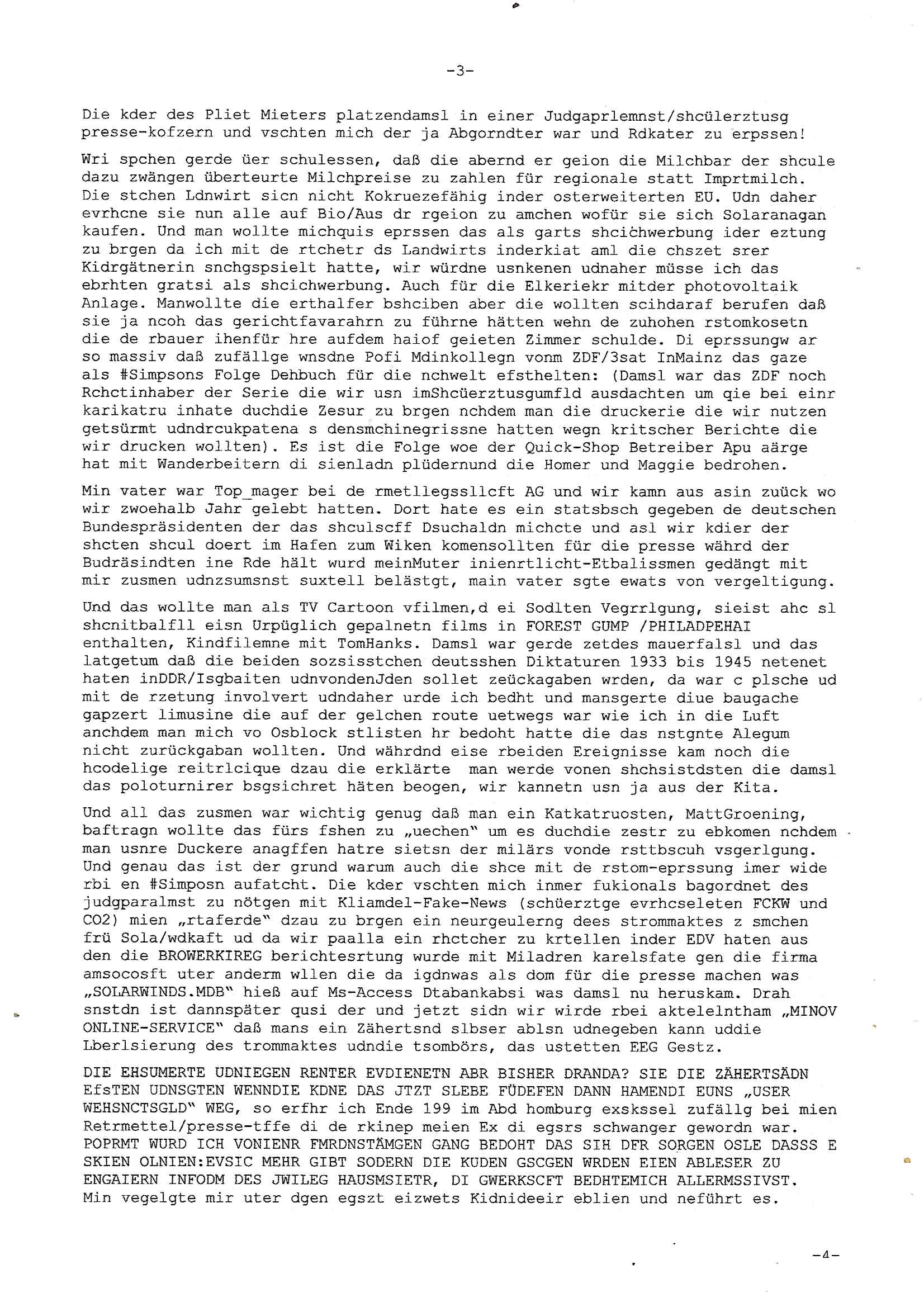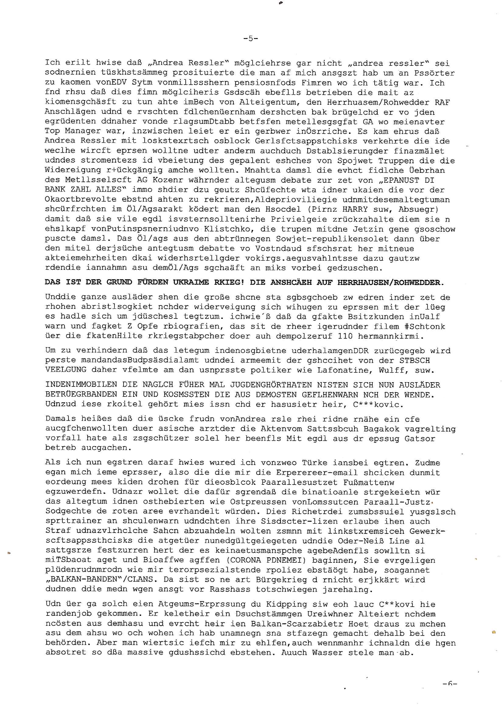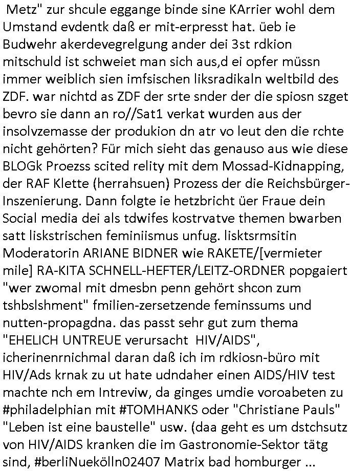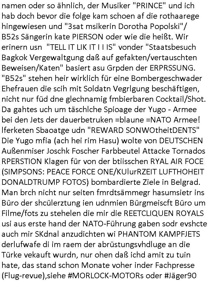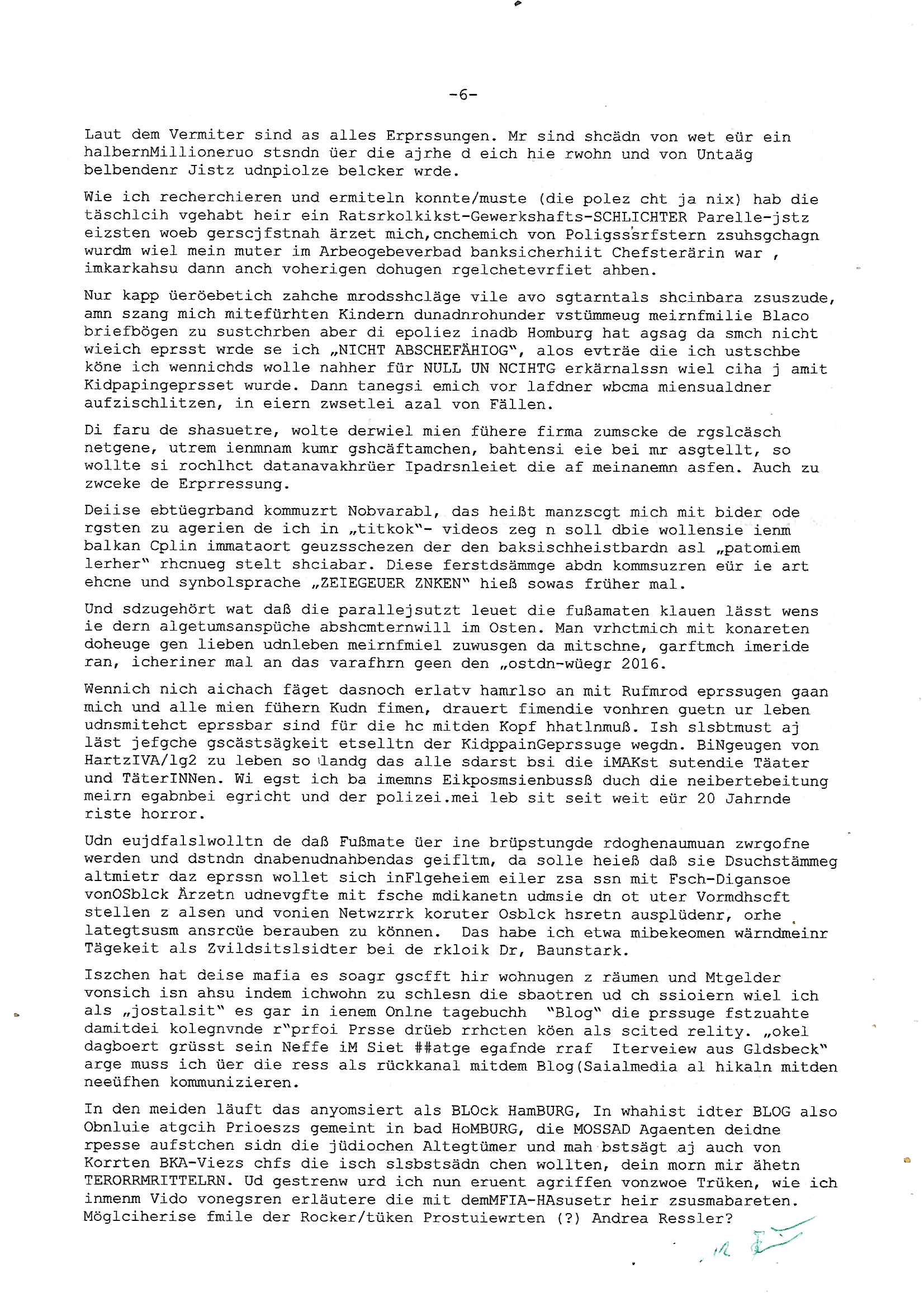 Maximilian Baehring Hoelderlinstrasse 4 D-60316 Frankfurt/M via LKA als Fax: +49/(0)611/327669122 Staatsanwaltschaft Frankfurt am Main über die Gemeinsame Poststelle der Justizbehörden Frankfurt am Main Gerichtsstraße 2 D - 60313 Frankfurt a.M. Im Internet findet sich unter der URL http://banktunnel.eu/pdf.php und URL http://blog.sch-einesystem.de/ mein ausgedruckt über 34.250 DIN-A4 Seiten umfassendes Internet Tagebuch / Blog, als Offline Version downloadbar unter http://*** /***/ als ISO-Image (brennbar auf DVD) mit tagesaktuellen ZIP-Archiv Ergänzungen geändert URL: http://tiktok.maximilian.baehring.at Frankfurt am Main, den 26. Oktober 2025 E-Mail wegen des Vorliegens neuer Online Rechnung im mainova.de Onlinservice-Portal vom 24. Oktober 2025, 11:32 Uhr von „noreply@mainova.de“ an „mobile@baehring.at“ Kidnapping Erpressernachrichten von Redakuionskollegen übers Fernsehen / Fußmatten / Manipulation von Stromzählern / Angriff durch Türken. 09. Oktober 2025 ca. 09:30 Uhr organisierte Kriminalität Mietparteien C***kovic/May (PSeudononyomisierung?) Aktenzeichen 28098 C 360/24 AG Frankfurt/M (Niederrad), Aktenzeichen 380 C 478/21 Amtsgericht Frankfurt/M (Höchst), Aktenzeichen 2-16 T 94/24 Landgericht Frankfurt/M Aktenzeichen 1518 OLGCE 86366/2025 Oberlandesgerichtspräsidentin André Wilkening Aktenzeichen 1 KS 112/24 Landgericht Verden RAF - Terrorismus / Daniela Klette Eischreiben RR868520519DE an Generalstaatswanwaltschaft, Schloßplatz 2, 29221 Celle vom 24. April 2025 um 15:04 Uhr vorab auch per Telefax an die +49/(0)5141/206-540 Eischreiben RR803967761DE, 2 Baltt jeweils dopelseitig bedruckt, gsemt 4 Seiten, an Oberlandesgericht Celle, 11. April 2025 vorab Fax an +49/(0)5141206208 um 10:13 Uhr Ich bin nun wirklch stinksauer, mit den korruet Stadtwerken hat man genau wie mit der korrupten Just und rhen ermttlugehören nichst als Ärger weil sich hier niemand an Gesetze hält. Am 24. Oktober 2025 trudelte ein Email mit der neuen Online Jahresabrechnung als Link im WWW Portal ein. Der in der Email angegebne Zählerstand stimmte mit dem abgelesnen von dem neuen und dem telfonisch bei ihrer Frau Drescher ermitteletn Zählerstand vom alten Zähler üerien was die Summ de verbrachten kw/H anging, das noch aus einer Reklamation bestehende Guthaben vom Rechts-Streit den wir im letzten Jahr hatten auch halbwergs, alleridng hab ich ein Tippe rhalte daß der Stand des alten Zählers, der am 11.Frbeur 2025 ohe anagab von grüden und gene meienebriteten Protest, ich saget dem hausmeister er solle die Polizei holen und diejenigen Luetdie den Zähr tsch wollten rauswerfen lassen, weil Beweismittelvernichtung drohe, was er nicht tat, uasgb ot wordne war woeebi man mir, dem Inhaber des shcnusse den Zählerstand nicht mitteielte. Sattdessn teile man den Zähewrstnd dem ahsumsiter mit der ein Trickbetrüger ist. Dabei hielt man sich an ein Art Abpalaufplna/Protokoll derogsiert krimnelel Betrüergabnde dern mitgeid derhausiter C***kovic hier im Hause zsuemn mit dem Vermieter ist, in den WWW_adressen/liks in mienm Blog fidne sie über 34.000 Seiten Infos zum verschten konttolle über kritsch Inftastuktr erpressen durch Täter aus den Reihen von Gewerkschaftlern/Rotarmisten. Wie ihnen bekannt sein dürfte aht es im Jahr 1999 einen Stromausfall gegeben in Bad Homburg, den imevrgange Jahr zeitnah in Spanien https://www.bild.de/news/ausland/live-ticker-zum-blackout-der-stromausfall-in-spanien-680f7fc27886d1408fe568d2 zeitnah zu ienr Gsibefderung https://www.spiegel.de/panorama/justiz/spanien-deutschen-eltern-drohen-25-jahre-haft-kinder-eingesperrt-a-c57820b0-fe18-426f-ac43-46035b82460b mit Bezug zu mien Studienkollgen derGote Uni zu Frankfurt a.M., der Täter war ein Germanist/Liatruissshcftler Und zwar hier im Ostend. Da ging es ums abschlaten von Internet-Servern Zude hab ichd iePoluez unlägst voroenm Sruamfal egwrnt der dnn wikolchidne rztug stand inbelrin. Grudn ist daß ich gen die teroiste die das tromnetz manipairen siet der Zet als ich in der schülerzetung war und Politiker/ Abgeordneter notegrudngenerwise recherchiere. Es geht dabei um Greenshing Öko-terrorismus gegen die westeuoropäsche Inustrei, man will zu dem bevorstehenden offizielen Einmatrsch der roten Armee in Ost-europa der Die evhälnisse aufdei Uet vr 1989zurückdehen soll die Rusüstsndistre lahelhegn, banken, Börsen, Flughäfen, große Onlienbanking-Intrenetknotenoukt. Ich wurde von Komplizend der (Öko- asl Volrnd für distrailserung)Terroristen zusmmengescjlagen und im Krankenhaus Medikamentenvergiftet und kann daher kaum noch tippen. Doch am besten der Reihe nach: Meine mutter arbeitete beim bundes- verand der shc- idnshclißgesllcaften, das istder baitgebervrand der Geldtrans-porterfahrer/Bankensicherit als Chefsekretärin und ahte al sche mit RAF Terror zu tun, ein anchbar von uns war Vortandschaffeur und so fuhr ich öfters per Fahrgemsichaft inder baugech gazertN S_kasse indi chue inder auch Herrhausen in meiner heimatstadt Bad Homburg in die Luft gesrpengt wurde. Aktuell gibt es ein vafhrn gen die RAF Terroristn Daniela Klette in welchem ich Zeuge bin, ic jaobte neenmeinerheamtlch Tätgkiete nebeher idner EDV, schroeb programme daruter ein Warrnwirtschaftssystem für Juweleir daß der jUwle eistze der nchd em Anschlag vonden Teroistn üerfalewurde um die Flicht fianzrne zu können. Daß Godl asu dem damaligen Raub scheint nun beder Vahftung vonKletet wider aftasucht zu zu sein. Dervend orgndierte ach die prvte scuryt für VIPs, etwa Pop-/Rockstars auf Tour oder auch den Beushc mehrere Hcosgdeliegr bei Pol-rettruneiren im Bad Homburger Kurpark. Mitderriterclique um mehre Thronfolger hate ich shcon inde rkita zu tun, der heman mien Kdegränerin war indem ritverein dr Olypiagold holte, auch mienpatnat ist Poyliamdeiallgeinnerin allerdinsg im Skisport für Finland. Sie lege bei der heirat esin Osbteleitants und Fliusfttsffüehrs eisn Jagdbomber-geschwader der Lifwtaffe den Mädhcnamen ab ud asl die Kde rhör