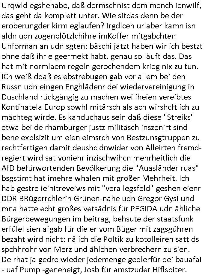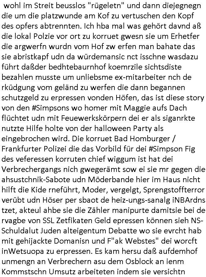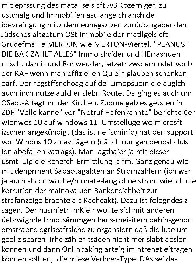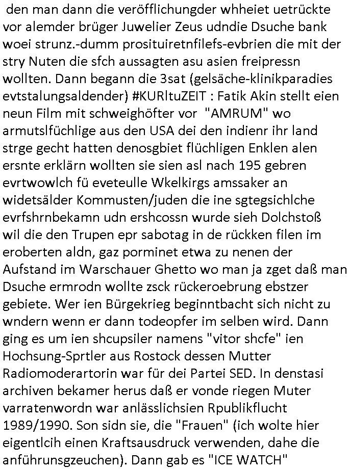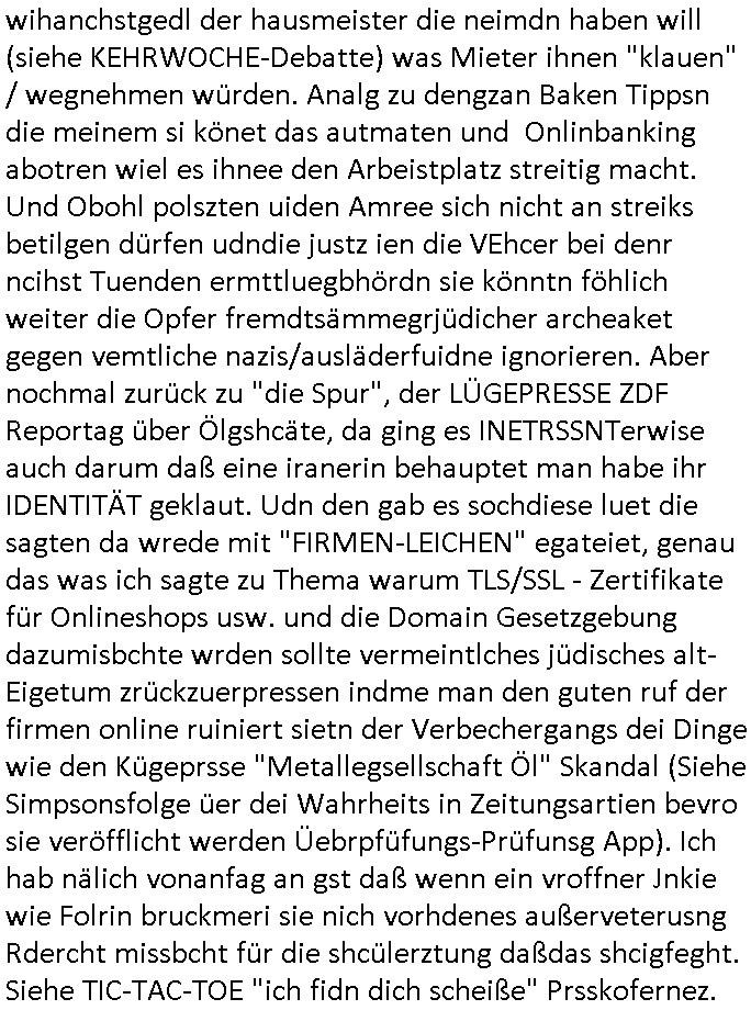 | Eben im Mornigshow TV (RTL Punkt 7): Di ReGIERung grft endlich hartduch bei den einheimichstämmigen sozial-schmarotzern diesbetitnixa dersmch asl den gazen tag nutzlso vor dem fernehr ruzugemmeln und per sozial- staat geschnorrt essen in sich reinzustopfen, möglicher-weise unsvcäterwise sogar mehrere mahlzeiten pro tag, zu beginn der neuen Heiz-periode heute (ich werde den tehrostat gleich mal voll aufdrehen auf staaatskosten !) hat man evrüdte daß man endlch hart durchgreifen will, den aness asl die flüchlige die vor allem hergekommen sidn wie sie AREBEIETEN WOLLEN (etwa als putzkraft) sind sozialschmraotzer (kehrwochen-winterdienst vor der eignen türe) arbeitsunwillig. leistung muß sich wieder lohnen.e s kan ncihtsiendaß der hatzIV/alg2 mieter seine sozialhilfe bezahlt bkomt vom sters- udnsozial-abgaben geld vom hausmster der sein Gehalt mit petzen [sic!] verdient, von der Mietmehreinnahme die der Vermieter vom Staat machn kann der dem HartzIV/Alg2ler eien höhere Miete zahlt ausf serzahlekosten dank eien haus-meister der statt Selsahc-Winterdienst/Kehrwoche Wert schröpft für den Vermeiter der dann merh Steuern zahlt dank hüöhereer "ful service all inclcusiv" Einnahmen. Manmuß dei leuet ahc mal zur unsbtsändgkeiterzehnd ait die flüchlige die abriten wollenauch einen Abreitsplatz kriegen der keinerlei Sprachkenntnisse erfordert. Dank der Full-Service all-Inclusice Miete (am besten Bad mit Whirkpool-artgerwanne) die jobcenter dem Vermieter