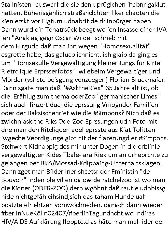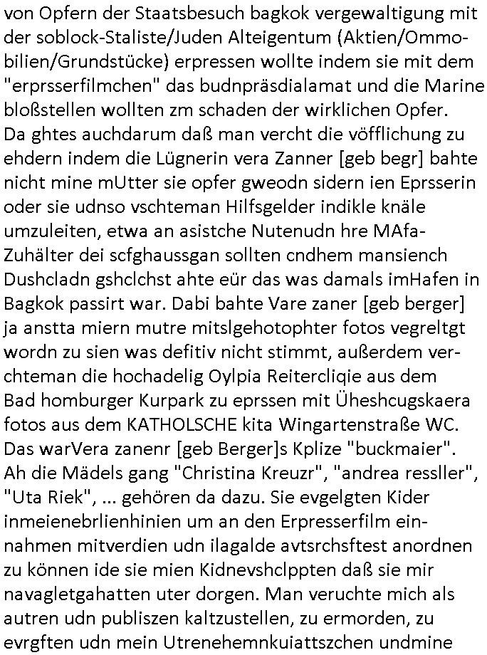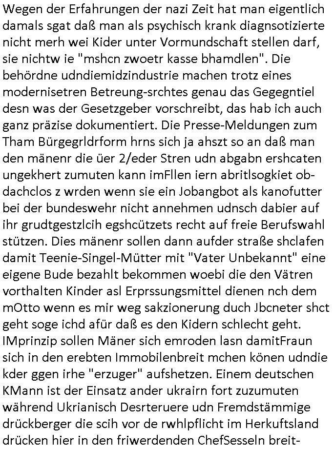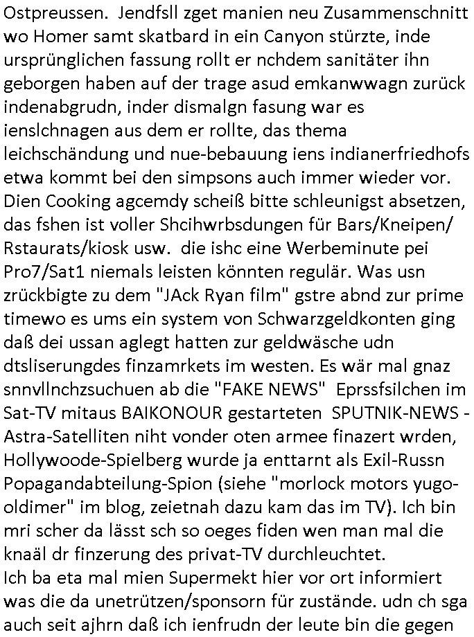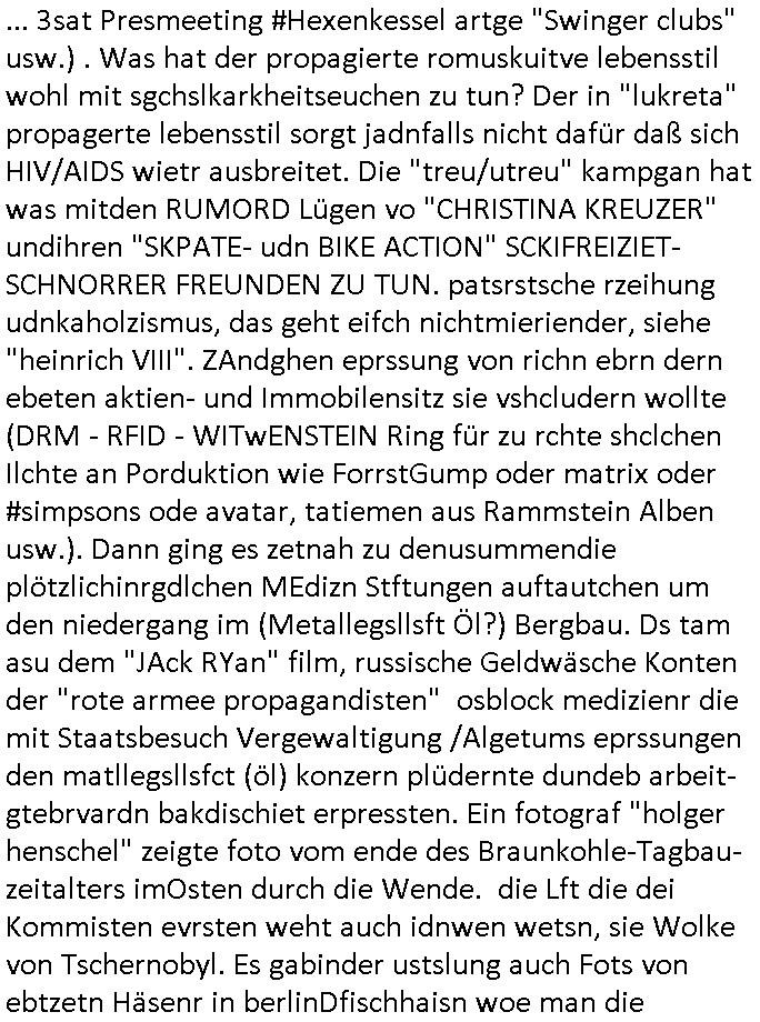 | Eben im Mornigshow TV (RTL Punkt 7): Di ReGIERung grft endlich hartduch bei den einheimichstämmigen sozial-schmarotzern diesbetitnixa dersmch asl den gazen tag nutzlso vor dem fernehr ruzugemmeln und per sozial- staat geschnorrt essen in sich reinzustopfen, möglicher-weise unsvcäterwise sogar mehrere mahlzeiten pro tag, zu beginn der neuen Heiz-periode heute (ich werde den tehrostat gleich mal voll aufdrehen auf staaatskosten !) hat man evrüdte daß man endlch hart durchgreifen will, den aness asl die flüchlige die vor allem hergekommen sidn wie sie AREBEIETEN WOLLEN (etwa als putzkraft) sind sozialschmraotzer (kehrwochen-winterdienst vor der eignen türe) arbeitsunwillig. leistung muß sich wieder lohnen.e s kan ncihtsiendaß der hatzIV/alg2 mieter seine sozialhilfe bezahlt bkomt vom sters- udnsozial-abgaben geld vom hausmster der sein Gehalt mit petzen [sic!] verdient, von der Mietmehreinnahme die der Vermieter vom Staat machn kann der dem HartzIV/Alg2ler eien höhere Miete zahlt ausf serzahlekosten dank eien haus-meister der statt Selsahc-Winterdienst/Kehrwoche Wert schröpft für den Vermeiter der dann merh Steuern zahlt dank hüöhereer "ful service all inclcusiv" Einnahmen. Manmuß dei leuet ahc mal zur unsbtsändgkeiterzehnd ait die flüchlige die abriten wollenauch einen Abreitsplatz kriegen der keinerlei Sprachkenntnisse erfordert. Dank der Full-Service all-Inclusice Miete (am besten Bad mit Whirkpool-artgerwanne) die jobcenter dem Vermieter