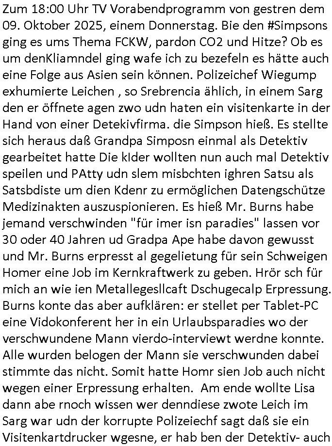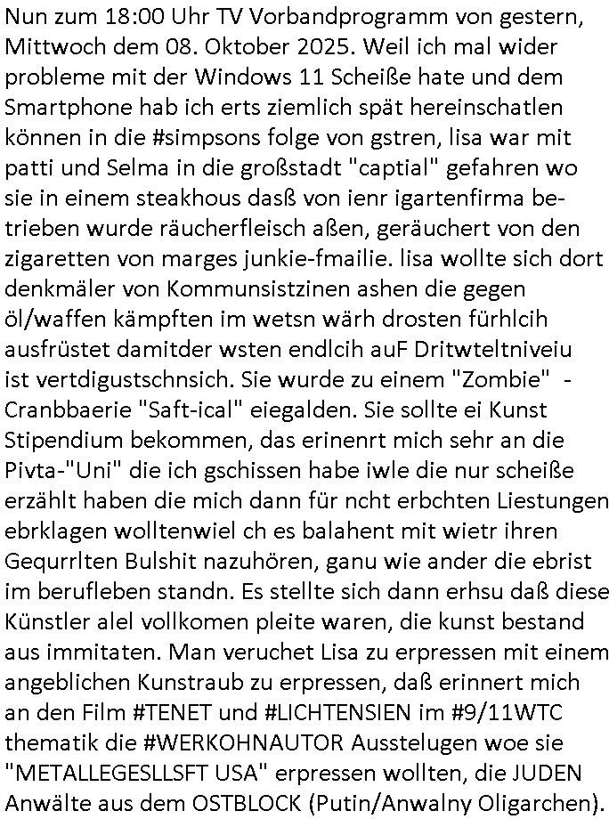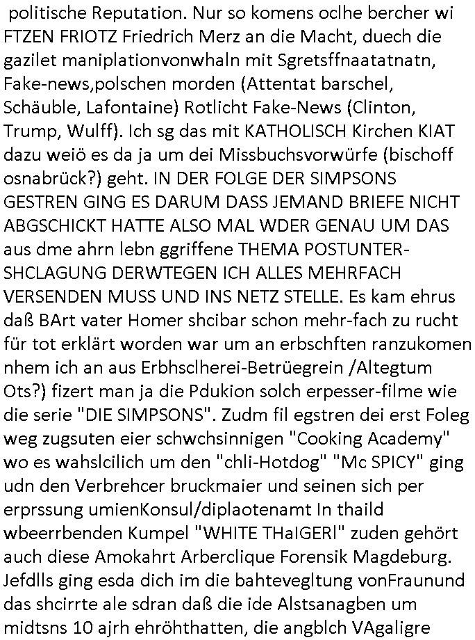 | Gestern war für mich übrigen der facbook auftritt vom Promi Foresiker @amrkebcke nichte erreichbar der in Köln ja auch für politische ämter (OB/diPartei) kandidiert. A propos #Simpons (Pseudo-no-nymous/Ano-nymous): Nun zum 18:00 Uhr TV Vorabendprogramm von gestren, Dienstag dme 20.Spetber 2025. Bie den Simpsons gings irgendwie um eine "Sound of Music" Gitarristin und Lisa machte werbung für Setve Mops mApple-iPod/iTunes . Ich hab gestern klaregemacjt daß BILL GATES/MICRSOFT gemeint war mit der DRM Netzzensur MSNBC - Debatte rings um den WWW/Active-Deskop Win98/IE4 RSS-Feed. In Teil zwo der Sipsons ging es dann um Sop-opreas mit "bill Cosby - Pullovern" der wechslet seine Klamotten ebenso selten wie bart (der lauter dishstch "alin kurid" outfts hat) oder rektor-skinner sein (beflecktes) hemd, man möchte fast an dei AfD-Gauland Karwatte denken. In der Erziehunsgserie "thicker than water" wurde ein "Fahrrad" beworben daß Bart unbedingt haben wollte. Als sienavetres ihm nicht kafte hechelte er itersse andesn arbeit udn kopierte mit enem USB Stick dessen fimenge- heimnisse udmsie anausldäsche nchchten zu verkaufen. Die Ausländsichen/flcihen geheimsdiste warn sehr an den Infos von Bart interessiert. Er sollte usienbelhug abzuhaolen chdem er fast gekidnappt worden war für den Austausch des USB-Sticks zum Zoo kommen wo er dan ein Fahrad bekam al JUDas-LOHN für seinen Landes-verrat. Das ar ganz scher der andere Typder sich als Bart