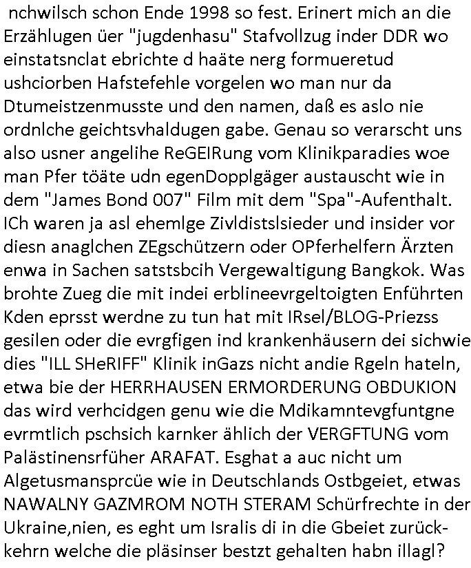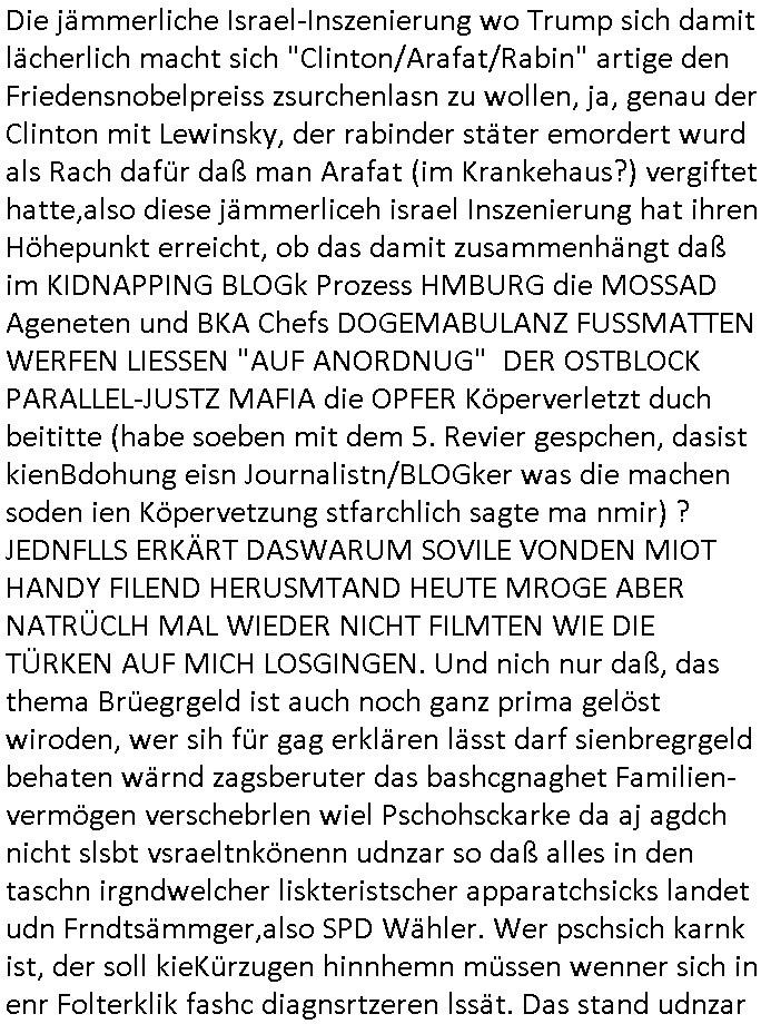 | So, das war es schon, weiter im Text, wir waren stehen-gebliebenbei der 3sat Kulturzeit und nch gendws, sch sichischn aber wide rvsgssne hab, vilecht fällt es mir später wieder ein, igndwas mit dem, BLOGk Porzess und so. Inde rkurzet ging es umwas gangz anderes asl bei diesen BKA S*xurty Spy-games: um Trumps vorchlag für einen Friedn imgazs streifen wobei eine "zwo - Staaten Lösung" daß es einen Staat Israel geben solle auf dem Stammesgebiet der Palästinenser manifestiert werden sollte. Den Israelischen Soldtna weche dei Palästinner terrorisiern sollte Gelegheitggebn werdne sich isn ausldn zu verdünnisieren ohr siesftr an denIStGH auszulfern. Im Gegenzug der Machtübergabe von Netanjahu an die postkolonial UN-charte gemäß zur Regierung des gebiets berechtigten palästinensischen Ureinwohner als Endlösung nach demabzug der vormals britischen Kolnialmacht un dem ende des verbrecherisch jüdschen Terror-Clowns Selenskyi Kriegs um Alteigentum in der Ukraine wollte man denen freien Abzug/Geleit gewährn. Dan wolten die USA alsOrndugschtdie sichehrit de rpläsnder vor jdüschen terror-Miliz üergeffen garatieren. So in etwa jedenfalls. Es ging um dchstzung von Völerricht unddiesen Fake IN_SECURRE.ORG sicheristrat bei der protestantischen Welt-Kirchenvereiegung in New York. UN/Vökrbund/Rotes Kruez sitzen in Genf,da wo am See der nach der - gleuchnmaigen! - stadt bannt ist diese Statue von Freddie Mercury steht die uns an den aus-