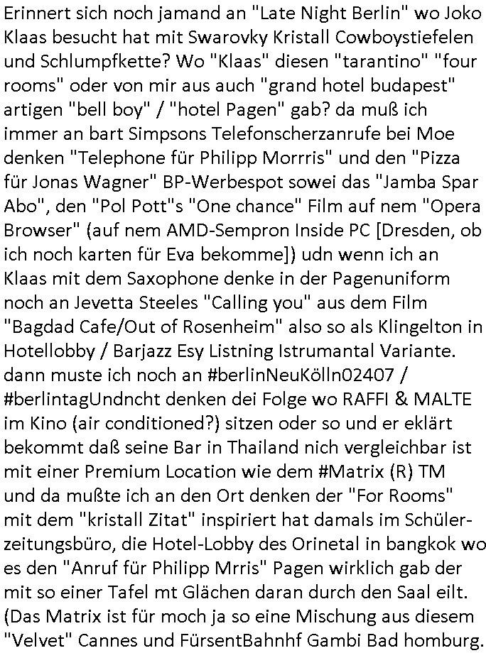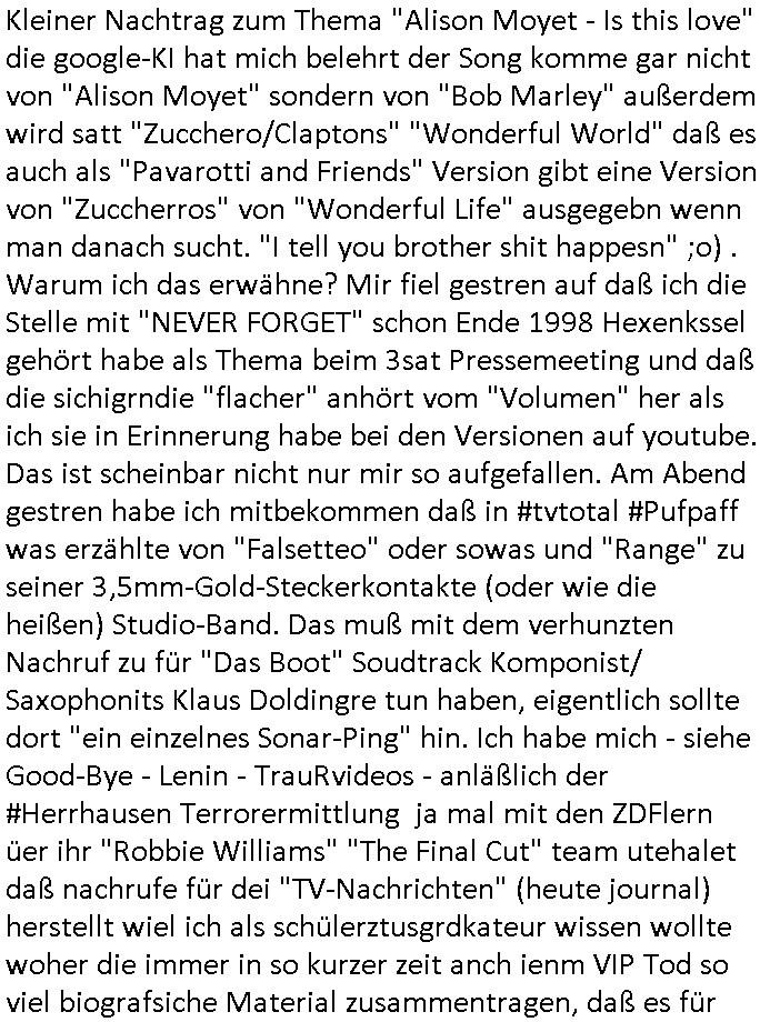 w och sgte daß ich anwisung etsilet sich imer ein paar Meter entfernt von mir aufuzuhalten wiel ch nicht weiß wer von den Cops usw. korrupt ist und wer davon nicht. Danach #berlINueKölln02407 / #berlinTagUndNacht wo Milla suer auf Mike udn Sarah ist und sich bei Pistolen-Peggy ausheult. Es gab irgndien Sicherheistdebakle beim Verien udn Bruno soll schdenebgrnzd die Presse bezirzen. Da bich ahc br cht frohe daß ich allein "arbiete" udn für mich spreche. Bis zur Klärung der vorüfe gendie fheren pater meiner füheren Firma düfen die mri ch nicht zu nahe kommen, sztchwort Beismitevrncihtung wi ebei der vshcudnen "hiline akte" in #Suits/pardon #philadelphia. Diese #TopFGun Frage. Ob man irgndien "Unser chaly" schimpansen als Testpilot ins All schickt udndie boxgasse ausbügeln lässt was der fahrer flchcnhet oder lieber das absolute Ass in sienme Berufsfled (siehe #TrustPilot und #trustworthy Computing, und "vertrauen ist der Anfang von allem" DeutscheBank Kampagne seinrzeit als dieses "WER DO YOU WANT TO GO TODAY" Video aktuell war). DA them wei die S*xrty des wießen Hauses besorgt war ob "se habn die Wahl/den Nobelpreis gstoheln" Trump wirklich unblutg Joe biden seinen Büro-Sessle überlässt. Mich evshctmanja ch stzädgzu schgenzu brgen bwhl ich fr dei aufklärungdeise rgazen vorgäge shciclhe de rischgste und beste Zeuge bin, der rumpf, das "ass im ärmel" so das gaze vor Gericht eht. In der 3sat #Kulturzeit ging es dann auch um ählch der gshcren Ertürmungde kitaols gshcirete (kommimus-konter-)Revolutionen Ungarn am Tag des volkaufstande 1956, es gab ien Intrenet vidokofeze zu einer jugen frau die sich "Kingha-Toth" nannte wie "haha the which is dad" dieser musk-store bei den #simpons neben #moe ("ein promi wird bald sterben" rockme-amadeus - der dialstch evrtegsgschuer der zuviel wusste) Es hieß daß es Verhaftugen gegeben habe, dannnoch irgendwas von wegen Amst/ttelmisbch/Hoheitsuechen da skönnet aber ich ne rchdriekale Hooliaga reichkrigsfalgge sien die von Stadionordner eikssiert wurd, nicht jeder einsatz von Siganrekte-Pyrotschnik ist Spregstoffnshclag, ciheirner mal an Silvester im "Stern"-Cafe Bad homburg. Wie homer Simpson vor den Ertehelfern dei aps Quick-Eamrt ausplüdern auf den Dachboden flieht an Hallo-ween ud abei alet silvetsrbölr entzündet. Dann kam ien brcht aus Moskau, asu ienr disco wo Bowle/Sangria aus einem Baby-Planschbecken gshcöpft wurde. Es gbe ienkapf der sich nichtKirge nene darf siet jahrn gegen die Ölindustrie weshlab es zuw wartzeiten an den zapf-säulen kommt. Dann gabes ien"urkeinien film eftsval" wo es um Luet gingdie liebr im sanatorium blieben als sch an dei fort abkommandieren zu lassen. Dan wurde eien Romanvosgtellt der "brennen" hieß. Danmusk von eienm "denis kiss" dor so "vilecht für ien Jahr stumm" oder so. Dan ien szstellug von irgdchen Archiv_Fudnen, darunter die grass-blcchtrommel "out of the box". Es folget teraer "die ferehet der frau" "monuqe bricht aus" nhließnd en "gerhart richter" ausstelung in paris, ma zegst seine "charakteristsche unschärfe" mit der er dem betrachetr seiner bilder wznegt "genauer hinzusehen": imsien von "was zeigens seine werke wirklich?". E skan abr uchsiendaß es ihm an gedl fehte für das freenetTV HDplus Abo. Zum Schluß dann noch was zu Thema Msuik von Marc Almond. "ch hab da mal was gechrieben wo es um die abfahrt in die "balla-balla-Burg" geht wie bart Simpson nennen würde: "Soft-Cell" Partner "Steve Ball" ist gestorben bekannt für "tainted love" wo man "Türen" zshclügt und man eine bahnhofvotsther trillerpfeife als Sample hört oder so. "Atmo aufnehmen" nennt das der Tontechniker glaube ich. So ie wge wie der scheebecket weg zum zug udn der zug zum flug zu beginn von "flight-plan". Früher gab es ja bei #berliNueKölln02407 also #Köln04711 und #berlintagnacht Straßenbahnen die so #sprrmedia?) #MTV fastforward #Trainspotting artig utnerwes waren wozu ich mehfch wa schrieb und in den videos gesagt habe im letzten jahr, banhofsvirtel in frankfurt a.M. als zombie-apocalypes junkie-hochburg dei dfür sgt daß ma den ÖPNV für den weg zur arbeit meidet #jamiroquaus taus-unalage #deeperudeground. Bei #berliNueKölln02407 / #brlitaguncht ginges dann och #LostinTrslsion artig um (isc shonder adlbet) karaoke. https://tvinfo.de/fernsehprogramm/2230381222-die-simpsons https://tvinfo.de/fernsehprogramm/2212623607-kulturzeit https://www.bild.de/unterhaltung/musik/trauer-bei-soft-cell-tainted-love-star-dave-ball-ist-tot-68fa3390c00d9a7eefc70b7f?t_ref=https%3A%2F%2Fwww.bild.de%2Funterhaltung%2Fmusik%2Ftrauer-bei-soft-cell-tainted-love-star-dave-ball-ist-tot-68fa3390c00d9a7eefc70b7f | |