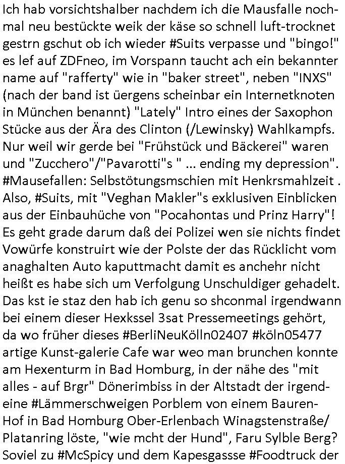 | Ich hab vorsichtshalber nachdem ich die Mausfalle noch-mal neu bestückte weik der käse so schnell luft-trocknet gestrn gschut ob ich wieder #Suits verpasse und "bingo!" es lef auf ZDFneo, im Vorspann taucht ach ein bekannter name auf "rafferty" wie in "baker street", neben "INXS" (nach der band ist üergens scheinbar ein Internetknoten in München benannt) "Lately" Intro eines der Saxophon Stücke aus der Ära des Clinton (/Lewinsky) Wahlkampfs. Nur weil wir gerde bei "Frühstück und Bäckerei" waren und "Zucchero"/"Pavarotti"s " ... ending my depression". #Mausefallen: Selbstötungsmschien mit Henkrsmahlzeit . Also, #Suits, mit "Veghan Makler"s exklusiven Einblicken aus der Einbauhüche von "Pocahontas und Prinz Harry"! Es geht grade darum daß dei Polizei wen sie nichts findet Vowürfe konstruirt wie der Polste der das Rücklicht vom anaghalten Auto kaputtmacht damit es anchehr nicht heißt es habe sich um Verfolgung Unschuldiger gehadelt. Das kst ie staz den hab ich genu so shconmal irgendwann bei einem dieser Hexkssel 3sat Pressemeetings gehört, da wo früher dieses #BerliNeuKölln02407 #köln05477 artige Kunst-galerie Cafe war weo man brunchen konnte am Hexenturm in Bad Homburg, in der nähe des "mit alles - auf Brgr" Dönerimbiss in der Altstadt der irgend- eine #Lämmerschweigen Porblem von einem Bauren- Hof in Bad Homburg Ober-Erlenbach Winagstenstraße/ Platanring löste, "wie mcht der Hund", Faru Sylble Berg? Soviel zu #McSpicy und dem Kapesgassse #Foodtruck der