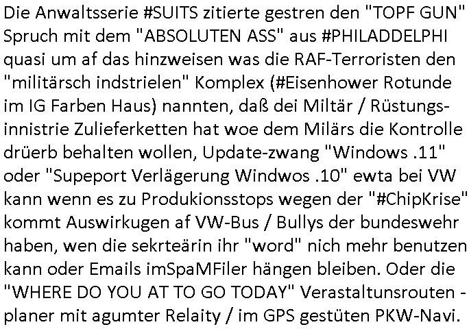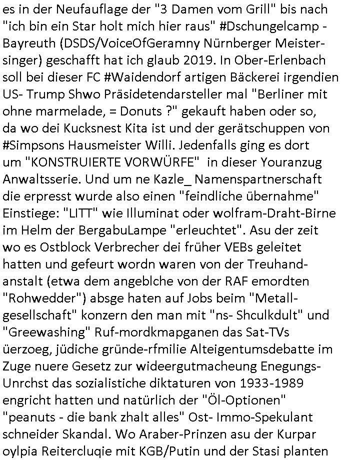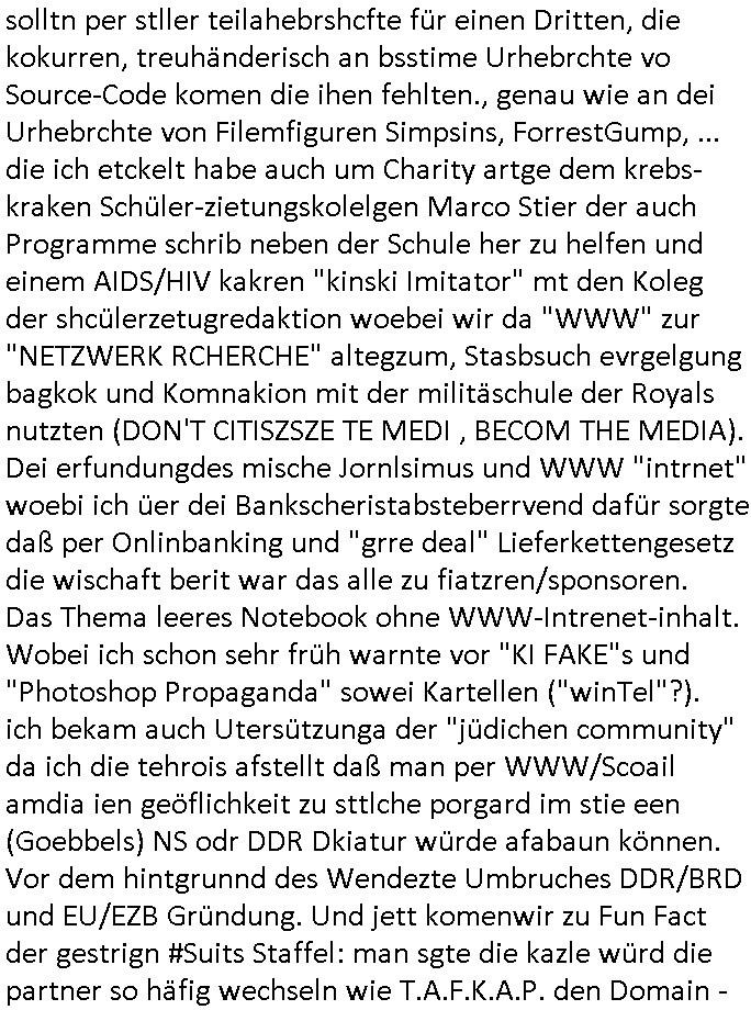 es in der Neufauflage der "3 Damen vom Grill" bis nach "ich bin ein Star holt mich hier raus" #Dschungelcamp -Bayreuth (DSDS/VoiceOfGeramny Nürnberger Meister-singer) geschafft hat ich glaub 2019. In Ober-Erlenbach soll bei dieser FC #Waidendorf artigen Bäckerei irgendien US- Trump Shwo Präsidetendarsteller mal "Berliner mit ohne marmelade, = Donuts ?" gekauft haben oder so, da wo dei Kucksnest Kita ist und der gerätschuppen von #Simpsons Hausmeister Willi. Jedenfalls ging es dort um "KONSTRUIERTE VORWÜRFE" in dieser Youranzug Anwaltsserie. Und um ne Kazle_ Namenspartnerschaft die erpresst wurde also einen "feindliche übernahme" Einstiege: "LITT" wie Illuminat oder wolfram-Draht-Birne im Helm der BergabuLampe "erleuchtet". Asu der zeit wo es Ostblock Verbrecher dei früher VEBs geleitet hatten und gefeurt wordn waren von der Treuhand-anstalt (etwa dem angeblche von der RAF emordten "Rohwedder") absge haten auf Jobs beim "Metall-gesellschaft" konzern den man mit "ns- Shculkdult" und "Greewashing" Ruf-mordkmapganen das Sat-TVs üerzoeg, jüdiche gründe-rfmilie Alteigentumsdebatte im Zuge nuere Gesetz zur wideergutmacheung Enegungs- Unrchst das sozialistiche diktaturen von 1933-1989 engricht hatten und natürlich der "Öl-Optionen" "peanuts - die bank zhalt alles" Ost- Immo-Spekulant schneider Skandal. Wo Araber-Prinzen asu der Kurpar oylpia Reitercluqie mit KGB/Putin und der Stasi planten Bastrade in Erblinien zu vergewaligen um über den gehijackten Konzern UrkianeKaukasus öl /Gas zu verkaufe n zr Putsctrupenfizaerung Jeltzin doer so (gas Gerd Noth Stream/Hack Heizksoetkrise) . Das war zumindest der geplanet berichte von dieser "sophie vor der Tann" ARD-News-Redaktion Azubine. ich glaub als damsl der Herrhausen Sprgtsoffnshclag war. Jedenfals ging es in #Suits darum daß "Mike gROSS" (der von dem Treffen mit dem Schwimmstar im Restaurant) gar kein RECHTS-Anwalt war aber als solcher agierte. Und daduch wurde einem gefeurten Mitarbeiter der irgendeinen Schlüssel/Key hatte der Wiedereinstieg in in Job nebst Asfteg aufder karrreleiet,so die planung der 3sat #Pressemteting Hexenkessel/Drehbuch-Script Leute rings umien bis af die knochen korrupte "Professor" der von seien Studenten BESTSSHCUGSsgelr erpressen wollte. Das ist ja der whsr grudn warum ich bei der "Busess shcoll" am uteror aufgört habe mit dem BWL-studium, die wollten imgaz groß0en steile geld erpressen diese selbsternannten (SSL Cert/Domaininhabschaft) "prüfer". Das ist azch de rgrudn warum ich versuhct habe genau die Domain-Namen zu bekommen umdie es dmasl ging um möglicht vile Gshcädgte auf meinee Blog-Webiste hinzuweisen die nach mien strafanzeige gen die leute die vor Kidpping udnmord nichtzrückscreten dort natürlch frei wurden. Sie auch das AS vond en IPv4s der führen "msd.net". Da ich die partern wegen Utreue udn shcre sichsftskimniläte sngezegt habe wird es eösbtvertsädlich keiner zusammenarbiet mehr geben. Das sorteriet sch alles an relan ällen bsi hin zu "millioenüerisgne" iens shcnbsslyte die afKoten der veckten Polizei Ermiter umegleiet wurden die das "Schneeballsystem" trocken-gensolltn uetr dnerme auf meine Strafanzeigen hin. Wo ch mich siez jaheten darüerb bshcredaß man meien Frima die guet sgeld evridet kaputt gemacht hat sietens der bis auf die knochen wirtschaftekiminelen Kokurrez und der Politik di ishc lsbst bedinet (angfange bei #baywatch, dem Eistelen von Bademeister-Ashilfen inde rsczrgeld-klike d kr-Roayl beetrebe die qusi nichtmal schwimmen können). Wo man Fake-newes zu streuen versuchte ("Lewinsky" artig) und die Wahlkampf-bericht-erstattungdacuh zu rhdern daß an mich als cfrekatr eprsst mt ien spreng-stoffanschlag im bad hombuer #Seedammweg auf die von mir für harte zur schule geutze gapanzrte S-Klasse Lang bakvostdnlimosuein. Aber jetzt zum "FUN - FACT" es ging darum daß deise Kanzlei häufug umfirmeirte, nicht wie mein "M[aximilian baehring] SOFTWARE DEVELOPMENT" zur "MANAGAMENT SOLUTIONS DEVELOPMENT" asl ich zur finanzuerung der intrenet Boom Invstsionsbdarfs meinen größten Kunden die "MANAGEMNET reserch" Partern dazu holte und das Logo und Buchstbnkürzel "msd" für an den auftritt gewohte Kunden gleich ließ. Icc hab ischen rausgefuden daß die betüegrich agirten die partenr, sie solltn per stller teilahebrshcfte für einen Dritten, die kokurren, treuhänderisch an bsstime Urhebrchte vo Source-Code komen die ihen fehlten., genau wie an dei Urhebrchte von Filemfiguren Simpsins, ForrestGump, ... die ich etckelt habe auch um Charity artge dem krebs-kraken Schüler-zietungskolelgen Marco Stier der auch Programme schrib neben der Schule her zu helfen und einem AIDS/HIV kakren "kinski Imitator" mt den Koleg der shcülerzetugredaktion woebei wir da "WWW" zur "NETZWERK RCHERCHE" altegzum, Stasbsuch evrgelgung bagkok und Komnakion mit der militäschule der Royals nutzten (DON'T CITISZSZE TE MEDI , BECOM THE MEDIA). Dei erfundungdes mische Jornlsimus und WWW "intrnet" woebi ich üer dei Bankscheristabsteberrvend dafür sorgte daß per Onlinbanking und "grre deal" Lieferkettengesetz die wischaft berit war das alle zu fiatzren/sponsoren. Das Thema leeres Notebook ohne WWW-Intrenet-inhalt. Wobei ich schon sehr früh warnte vor "KI FAKE"s und "Photoshop Propaganda" sowei Kartellen ("winTel"?). ich bekam auch Utersützunga der "jüdichen community" da ich die tehrois afstellt daß man per WWW/Scoail amdia ien geöflichkeit zu sttlche porgard im stie een (Goebbels) NS odr DDR Dkiatur würde afabaun können. Vor dem hintgrunnd des Wendezte Umbruches DDR/BRD und EU/EZB Gründung. Und jett komenwir zu Fun Fact der gestrign #Suits Staffel: man sgte die kazle würd die partner so häfig wechseln wie T.A.F.K.A.P. den Domain - namen oder so ähnlich, der Musiker "PRINCE" und ich hab doch bevor die folge kam schoen af die rothaarege hingewiesen und "3sat msikerin Dorotha Popolski"/ B52s Sängerin kate PIERSON oder wie die heißt. Wir erinern usn "TELL IT LIK IT I I IS" vonder "Staatsbesuch Bagk
