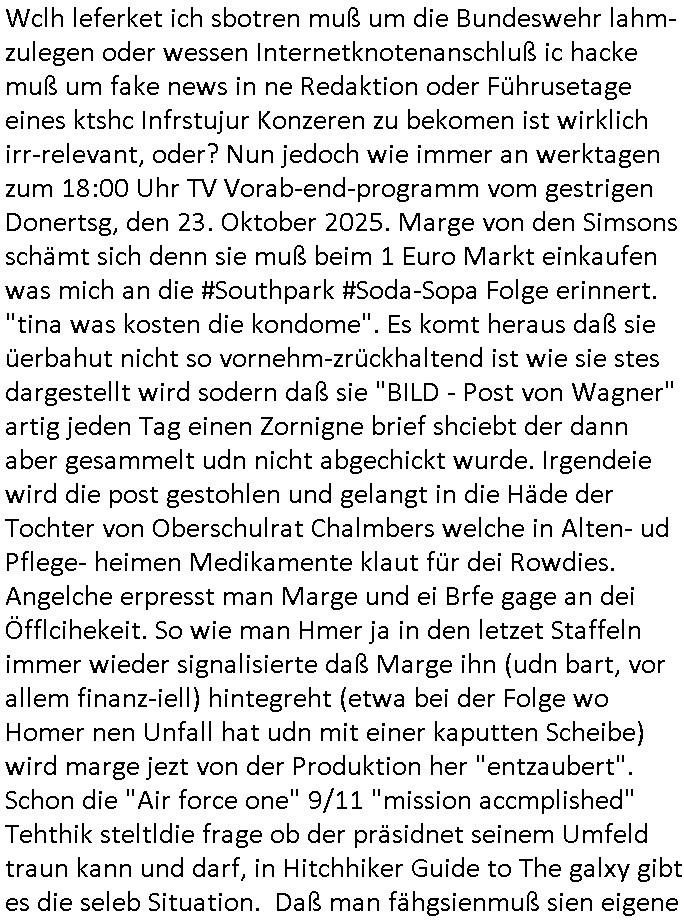| Wclh leferket ich sbotren muß um die Bundeswehr lahm-zulegen oder wessen Internetknotenanschluß ic hacke muß um fake news in ne Redaktion oder Führusetage eines ktshc Infrstujur Konzeren zu bekomen ist wirklich irr-relevant, oder? Nun jedoch wie immer an werktagen zum 18:00 Uhr TV Vorab-end-programm vom gestrigen Donertsg, den 23. Oktober 2025. Marge von den Simsons schämt sich denn sie muß beim 1 Euro Markt einkaufen was mich an die #Southpark #Soda-Sopa Folge erinnert. "tina was kosten die kondome". Es komt heraus daß sie üerbahut nicht so vornehm-zrückhaltend ist wie sie stes dargestellt wird sodern daß sie "BILD - Post von Wagner" artig jeden Tag einen Zornigne brief shciebt der dann aber gesammelt udn nicht abgechickt wurde. Irgendeie wird die post gestohlen und gelangt in die Häde der Tochter von Oberschulrat Chalmbers welche in Alten- ud Pflege- heimen Medikamente klaut für dei Rowdies. Angelche erpresst man Marge und ei Brfe gage an dei Öfflcihekeit. So wie man Hmer ja in den letzet Staffeln immer wieder signalisierte daß Marge ihn (udn bart, vor allem finanz-iell) hintegreht (etwa bei der Folge wo Homer nen Unfall hat udn mit einer kaputten Scheibe) wird marge jezt von der Produktion her "entzaubert". Schon die "Air force one" 9/11 "mission accmplished" Tehthik steltldie frage ob der präsidnet seinem Umfeld traun kann und darf, in Hitchhiker Guide to The galxy gibt es die seleb Situation. Daß man fähgsienmuß sien eigene S*xrty zu umgehen