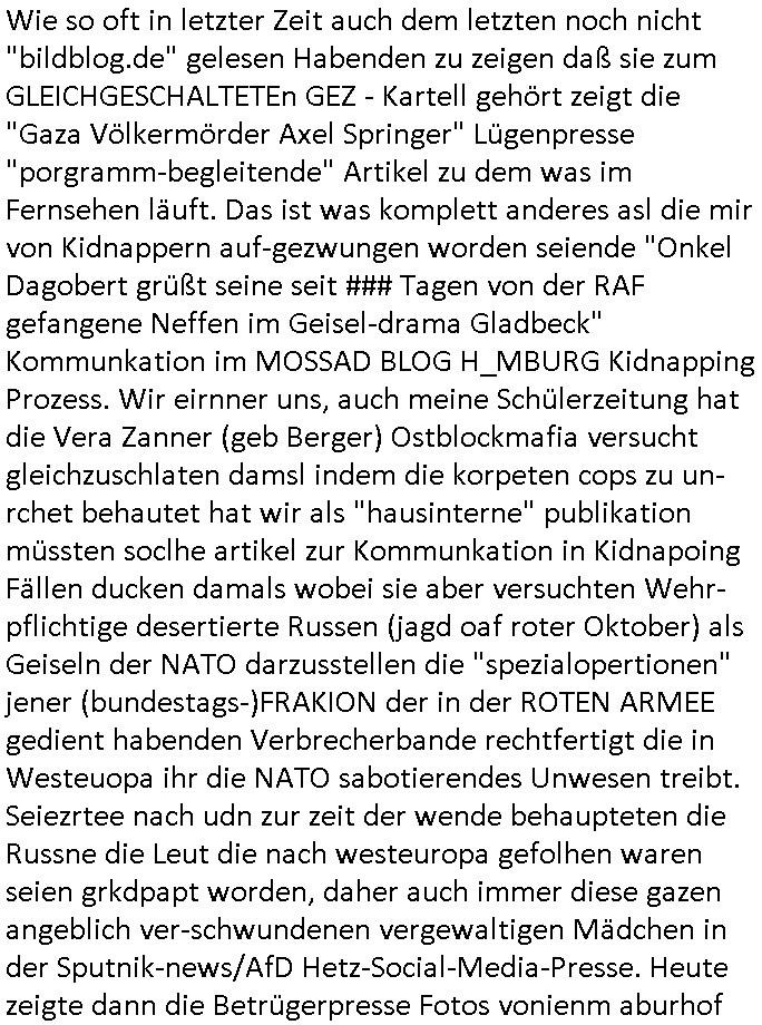 | Wie so oft in letzter Zeit auch dem letzten noch nicht "bildblog.de" gelesen Habenden zu zeigen daß sie zum GLEICHGESCHALTETEn GEZ - Kartell gehört zeigt die "Gaza Völkermörder Axel Springer" Lügenpresse "porgramm-begleitende" Artikel zu dem was im Fernsehen läuft. Das ist was komplett anderes asl die mir von Kidnappern auf-gezwungen worden seiende "Onkel Dagobert grüßt seine seit ### Tagen von der RAF gefangene Neffen im Geisel-drama Gladbeck" Kommunkation im MOSSAD BLOG H_MBURG Kidnapping Prozess. Wir eirnner uns, auch meine Schülerzeitung hat die Vera Zanner (geb Berger) Ostblockmafia versucht gleichzuschlaten damsl indem die korpeten cops zu un-rchet behautet hat wir als "hausinterne" publikation müssten soclhe artikel zur Kommunkation in Kidnapoing Fällen ducken damals wobei sie aber versuchten Wehr-pflichtige desertierte Russen (jagd oaf roter Oktober) als Geiseln der NATO darzusstellen die "spezialopertionen" jener (bundestags-)FRAKION der in der ROTEN ARMEE gedient habenden Verbrecherbande rechtfertigt die in Westeuopa ihr die NATO sabotierendes Unwesen treibt. Seiezrtee nach udn zur zeit der wende behaupteten die Russne die Leut die nach westeuropa gefolhen waren seien grkdpapt worden, daher auch immer diese gazen angeblich ver-schwundenen vergewaltigen Mädchen in der Sputnik-news/AfD Hetz-Social-Media-Presse. Heute zeigte dann die Betrügerpresse Fotos vonienm aburhof