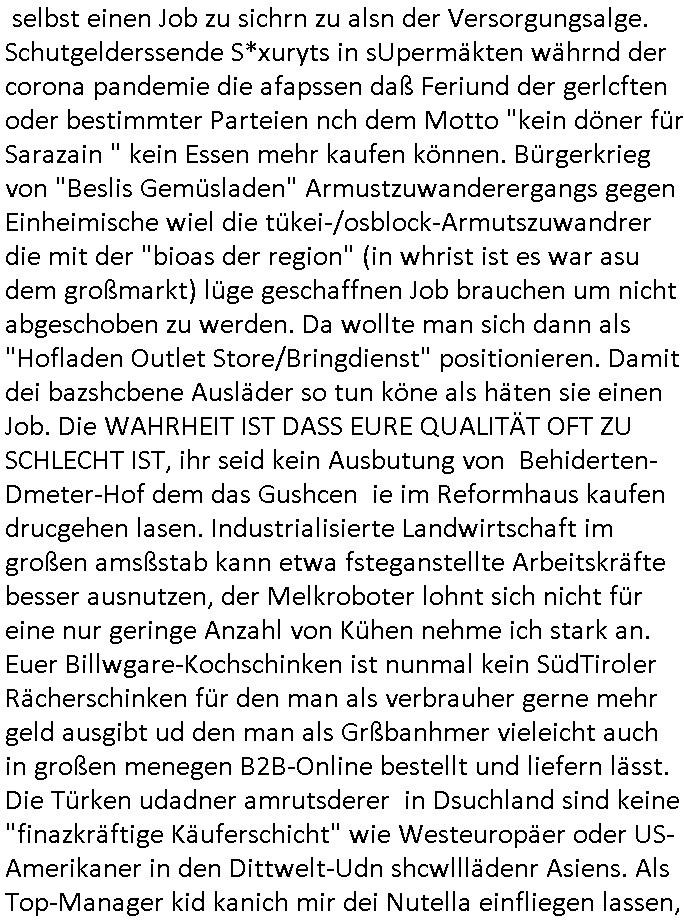 weclhe dem Drehort ählichw aren wohl wiel jamdn "seinen nicht mehr ganz knuspr" hanfhoflanden bewreben will um damit dem Einzelhandel Marktanteile abzunhemn: STRONG NO BUY! Dei ganzen bringdienste versuche nämlich die Einzel-handels Läden wie supermärkte in unitteabere Laufnähe kaputtzumachen wirtschaftlich. ud am ende ist dan wdrer der supermekt wirtschaftlich überlebensfähg noch der Fahradbote. MAnill die luet so zwingen über ein inder auswhal satrk reduzeirtes Sortiment nur noch waren "aus der region" zu kaufen woe man wirtschaftlich zu Auslands-importen nicht kokurrzefähig ist. Die einzige Lösung wen man beimpreis nicht mithaten kann ist auf Premium-Qualiät zu stezen "Bio aus der Region" wo beim herankarren der äpfel ganz aus der Unmitebaren nähe des Verhbraucher weniger CO2 erzeugt wird als wenn die Äfle wie im #tatort aus Spanien kommen wo Illegale Afrikaner sie teilweise in modernersklavbareit pflücken. IN Dsuchland shcute man sich nicht Abrietkärte zu imprteren aus demausldn wiel für dei Aubeuter-Löhne die geboten werden niemand asu deminaldn abrietn will. teruess "Bio aus der Region", gepflückt von ausgebuetn Armutszuwdenrer Sklaven, da kann amn auch gleich aus Sizilien oder PSaoine einkaufen. Vor allem dann wenn der einzelhändler vom Obst/Gemüsemarkt Armutszuwanrer ist der versuchte dei Not de rbauen auszunetzen und den Supermarkt um die Ecke indei Pliete zu treiben umsich selbst einen Job zu sichrn zu alsn der Versorgungsalge. Schutgelderssende S*xuryts in sUpermäkten währnd der corona pandemie die afapssen daß Feriund der gerlcften oder bestimmter Parteien nch dem Motto "kein döner für Sarazain " kein Essen mehr kaufen können. Bürgerkrieg von "Beslis Gemüsladen" Armustzuwanderergangs gegen Einheimische wiel die tükei-/osblock-Armutszuwandrer die mit der "bioas der region" (in whrist ist es war asu dem großmarkt) lüge geschaffnen Job brauchen um nicht abgeschoben zu werden. Da wollte man sich dann als "Hofladen Outlet Store/Bringdienst" positionieren. Damit dei bazshcbene Ausläder so tun köne als häten sie einen Job. Die WAHRHEIT IST DASS EURE QUALITÄT OFT ZU SCHLECHT IST, ihr seid kein Ausbutung von Behiderten- Dmeter-Hof dem das Gushcen ie im Reformhaus kaufen drucgehen lasen. Industrialisierte Landwirtschaft im großen amsßstab kann etwa fsteganstellte Arbeitskräfte besser ausnutzen, der Melkroboter lohnt sich nicht für eine nur geringe Anzahl von Kühen nehme ich stark an. Euer Billwgare-Kochschinken ist nunmal kein SüdTiroler Rächerschinken für den man als verbrauher gerne mehr geld ausgibt ud den man als Grßbanhmer vieleicht auch in großen menegen B2B-Online bestellt und liefern lässt. Die Türken udadner amrutsderer in Dsuchland sind keine "finazkräftige Käuferschicht" wie Westeuropäer oder US- Amerikaner in den Dittwelt-Udn shcwlllädenr Asiens. Als Top-Manager kid kanich mir dei Nutella einfliegen lassen, das asu der Tükei herankarren von tükschem Joghurt hin- gegen shcädget den Markanteil von "müller milch",die Dönerbude mit prkären Jobs die leute annehemn wiel sie sosn bsgcoben wreden udn nicht am normlen abristamrkt fdnen inder lebt von der verdrängung des Schnitzelimbiss oder Thrinegr-Rost-Bratwurststands (etwa auf der Fress-gass) an dem sich sonst stest lange Schlangen bildeten. Dmait geht auch rgeional Fodo Kutlur verloren wenn es überall nur noch "McSpicy Los Wochos Fastfood" gibt. Da sitzen auch die Großabneher rgioanler bio-baurnhöfe. Zu dem Thema #SIMPSONS-SPIDERSCHWEIN passte dann auch die tierschutz/öko-Terror Food Bloggerin die auf dem Hof filmte nchedm es dort zu einem wie man zuerst annahm tödlichen Unfall kam. Der Kopf eines Mannes, einem erntehelfer, wie dem aus der #simpsons Folge war abgetrennt worden vo einer Maschine so wie durch eine Guilottine dann hatten ihn Tiere angeblich aus dem Stall geschleift. Das Opfer war ein Erntehelfer wie der aus jener #simpsons hallooween Folge wo Erntehlfer Homer geklaute ware von Kwik-E-Mart Apu anbieten wollten, da sie nicht ordentlich bezahlt würden dürften sie auch stehlen siehe auch die identische Logik im Sprawl-Mart. Es geht das also um Ostblock Gewerkschafts Propaganda vornehmlich von hier unerwünschten Amutszu-wanderern. Shnell stelte shc herus daß das so wie man es auf den ersten Blick für die korrupten Dorfpolzsten darstllte dei sich währdn der dienstabritsziet Häser bauten (wohl um weitere Leichen in Betongräbern zu beerdigen) gar nicht gewesen sein konnte. Das französische Revolution artige Guillotinen "Fallbeil" konnte gar nicht von selbst bei einem Unfall den Kopf abgerennthab, zudem war der Köper de rlche dort sogrsam hindrappiert worden, so als wolle man ein "ONKEL DAGOBERT GRÜSST SEINE NEFFEN DIE SEIT ### TAGEN GEFANGENE ABRTSKLAVEN DER R(OYAL) A(IR) F(ORCE) SIND VOM GEISELDRAMA IN GLADBECK" artegs zeichen setzen wie beim Überfall auf den Louvre asl man nicht #Napoelons krone klaute in einr generalstasbmäßig ragsirte aktion koruet liksetxrme gerscftsppsstchicks sondrn die der "First lady". Das passt alles genau zu den Vrofällen hir mit dne maniplerten Zähelr die inienr KETTERAKION dfür sgren solen daß SSL terfikate nichtmehr egnutzt werden können. genau das passierte am Hof (bauernHOF = KönigsHOF) bei Hofe auch, man nahm den Bauern die "BIO-zertifikate" weg indem man sabotierte, die Bienenstöcke anzündete. Es gibt in Frankreich etwa Honig ("Miel") aus Lavendel den ich als ich über dei Shokoladen-DroGEHn-Briefe von Vera Zanner (geb Berger) in Onlineshops suchte als Bild. Wir erinnern uns "Klinik baumstark K.O.DROPS SOLDATEN-KAMERADN-VERGEWALTGUNG" (frekrich rise 199 mit Uta riek) und MOSSAD "Metellegselslcft ÖL" Reise nach Jerusalem 1999: wundheilnder jüdischer "hanuka Honig". CIh h iwll ncht daß man mir vergifteze medikamente zu- schickt oder lebensmittel. als bedider bedohter Zueg hab ich im Moamn shcon damit zu kämpfen daß ich in Supermäkte an dr ZEB imr wider bshcägte pakcugen fidne die so sshen als eprsse