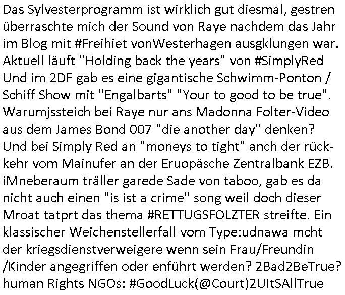 Das Sylvesterprogramm ist wirklich gut diesmal, gestren überraschte mich der Sound von Raye nachdem das Jahr im Blog mit #Freihiet vonWesterhagen ausgklungen war. Aktuell läuft "Holding back the years" von #SimplyRed Und im 2DF gab es eine gigantische Schwimm-Ponton / Schiff Show mit "Engalbarts" "Your to good to be true". Warumjssteich bei Raye nur ans Madonna Folter-Video aus dem James Bond 007 "die another day" denken? Und bei Simply Red an "moneys to tight" anch der rück- kehr vom Mainufer an der Eruopäsche Zentralbank EZB. iMneberaum träller garede Sade von taboo, gab es da nicht auch einen "is ist a crime" song weil doch dieser Mroat tatprt das thema #RETTUGSFOLZTER streifte. Ein klassischer Weichenstellerfall vom Type:udnawa mcht der kriegsdienstverweigere wenn sein Frau/Freundin /Kinder angegriffen oder enführt werden? 2Bad2BeTrue? human Rights NGOs: #GoodLuck(@Court)2UItSAllTrue
