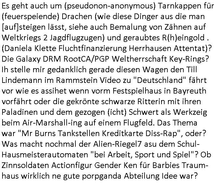Es geht auch um (pseudonon-anonymous) Tarnkappen für (feuerspeiende) Drachen (wie diese Dinger aus die man [auf]steigen lässt, siehe auch Bemalung von Zähnen auf Weltkriegs 2 Jagdflugzugen) und geraubtes R(h)eingold . (Daniela Klette Fluchtfinanzierung Herrhausen Attentat)? Die Galaxy DRM RootCA/PGP Weltherrschaft Key-Rings? Ih stelle mir gedanklich gerade diesen Wagen den Till Lindemann im Rammstein Video zu "Deutschland" fährt vor wie es assihet wenn vorm Festspielhaus in Bayreuth vorfährt oder die gekrönte schwarze Ritterin mit ihren Paladinen und dem gezogen (icht) Schwert als Werkzeig beim Air-Marshall-ing auf einem Flugfeld. Das Thema war "Mr Burns Tankstellen Kreditkarte Diss-Rap", oder? Was macht nochmal der Alien-Riegel7 asu dem Schul-Hausmeisterautomaten "bei Arbeit, Sport und Spiel"? Ob Zinnsoldaten Actionfigur Gender Ken für Barbies Traum-haus wirklich ne gute porpganda Abteilung Idee war?
