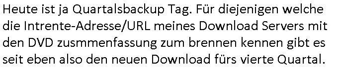 Heute ist ja Quartalsbackup Tag. Für diejenigen welche die Intrente-Adresse/URL meines Download Servers mit den DVD zusmmenfassung zum brennen kennen gibt es seit eben also den neuen Download fürs vierte Quartal.