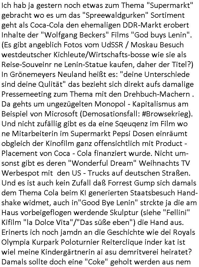 Ich hab ja gestern noch etwas zum Thema "Supermarkt" gebracht wo es um das "Spreewaldgurken" Sortiment geht als Coca-Cola den ehemaligen DDR-Markt erobert Inhalte der "Wolfgang Beckers" Films "God buys Lenin". (Es gibt angeblich Fotos vom UdSSR / Moskau Besuch westdeutscher Kichleute/Wirtschafts-bosse wie sie als Reise-Souveinr ne Lenin-Statue kaufen, daher der Titel?) In Grönemeyers Neuland heißt es: "deine Unterschiede sind deine Qulität" das bezieht sich direkt aufs damalige Pressemeeting zum Thema mit den Drehbuch-Machern . Da gehts um ungezügelten Monopol - Kapitalismus am Beispiel von Microsoft (Demosationsfall: #Browsekrieg). Und nicht zufällig gibt es da eine Sqeuqenz im Film wo ne Mitarbeiterin im Supermarkt Pepsi Dosen einräumt obgleich der Kinofilm ganz offensichtlich mit Product - Placement von Coca - Cola finanziert wurde. Nicht um- sonst gibt es deren "Wonderful Dream" Weihnachts TV Werbespot mit den US - Trucks auf deutschen Straßen. Und es ist auch kein Zufall daß Forrest Gump sich damals dem Thema Cola beim KI generierten Staatsbesuch Hand- shake widmet, auch in"Good Bye Lenin" strckte ja die am Haus vorbeigeflogen werdende Skulptur (siehe "Fellini" Kifilm "la Dolce Vita"/"Das süße eben") die Hand aus. Erinerts ich noch jamdn an die Geschichte wie dei Royals Olympia Kurpark Poloturnier Reiterclique inder kat ist wiel meine Kindergärtnerin ai asu demritverei heiratet? Damals sollte doch eine "Coke" geholt werden aus nem