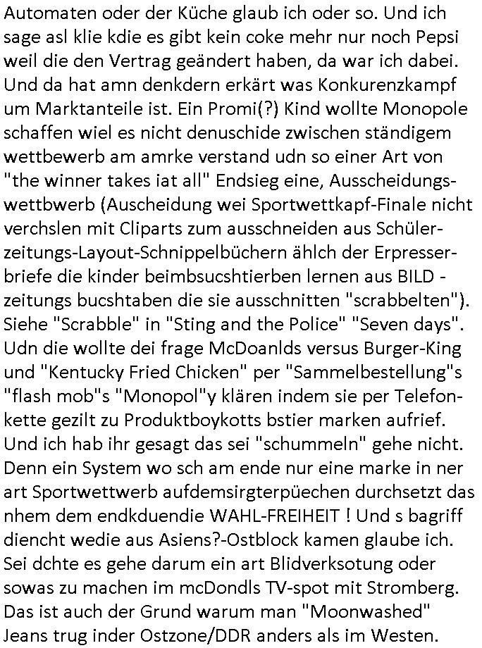 Automaten oder der Küche glaub ich oder so. Und ich sage asl klie kdie es gibt kein coke mehr nur noch Pepsi weil die den Vertrag geändert haben, da war ich dabei. Und da hat amn denkdern erkärt was Konkurenzkampf um Marktanteile ist. Ein Promi(?) Kind wollte Monopole schaffen wiel es nicht denuschide zwischen ständigem wettbewerb am amrke verstand udn so einer Art von "the winner takes iat all" Endsieg eine, Ausscheidungs-wettbwerb (Auscheidung wei Sportwettkapf-Finale nicht verchslen mit Cliparts zum ausschneiden aus Schüler-zeitungs-Layout-Schnippelbüchern ählch der Erpresser- briefe die kinder beimbsucshtierben lernen aus BILD - zeitungs bucshtaben die sie ausschnitten "scrabbelten"). Siehe "Scrabble" in "Sting and the Police" "Seven days". Udn die wollte dei frage McDoanlds versus Burger-King und "Kentucky Fried Chicken" per "Sammelbestellung"s "flash mob"s "Monopol"y klären indem sie per Telefon-kette gezilt zu Produktboykotts bstier marken aufrief. Und ich hab ihr gesagt das sei "schummeln" gehe nicht. Denn ein System wo sch am ende nur eine marke in ner art Sportwettwerb aufdemsirgterpüechen durchsetzt das nhem dem endkduendie WAHL-FREIHEIT ! Und s bagriff diencht wedie aus Asiens?-Ostblock kamen glaube ich. Sei dchte es gehe darum ein art Blidverksotung oder sowas zu machen im mcDondls TV-spot mit Stromberg. Das ist auch der Grund warum man "Moonwashed" Jeans trug inder Ostzone/DDR anders als im Westen.