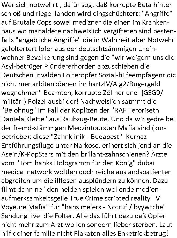 Wer sich notwehrt , dafür sogt daß korrupte Beta hinter schloß und riegel landen wird eingschüchtert: "Angriffe" auf Brutale Cops sowei medizner die einen im Kranken-haus wo manaldete nachweislich vergifteten sind besten-falls "angebliche Angriffe" die in Wahrheit aber Notwehr gefoltertert Ipfer aus der deutschtsämmigen Urein-wohner Bevölkerung sind gegen die "wir weigern uns die Asyl-betrüger Plündererhorden abzuschieben die Deutschen Invalden Folteropfer Sozial-hilfeempfägenr dic nicht mer arbitenköenen ihr hartzIV/Alg2/Bügergeld wegnehmen" Beamten, korrupte Zöllner und (GSG9/ militär-) Polzei-ausbilder! Nachweislich satmmt die "Belohnug" im Fall der Koplizen der "RAF Terorisetn Daniela Klette" aus Raubzug-Beute. Und da wir gedre bei der fremd-stämmgen Medzintoursten Mafia sind (kur-betriebe): diese "Zahnklinik - Budapest" Kurnaz Entführungsflüge unter Narkose, erinert sich jend an die Asein/K-PopStars mit den brillant-zahnschienen? Ärzte vom "Tom hanks Hologramm für den König" dubai medical network woltlen doch reiche auslandspatienten abgreifen um die ilflosen ausplündern zu können. Dazu filmt dann ne "den helden spielen wollende medien- aufmerksamkeitsgeile True Crime scripted reality TV Voyeure Mafia" für "hans meiers - Notruf / byywtche" Sendung live die Folter. Alle das führt dazu daß Opfer nicht mehr zum Arzt wollen sondern lieber sterben. Laut hilf deiner familie nicht Plakaten alles Enketrickbetrug!