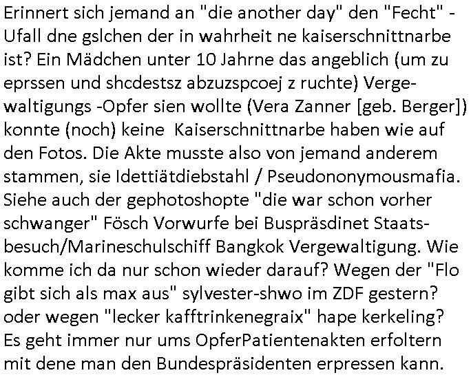 Erinnert sich jemand an "die another day" den "Fecht" - Ufall dne gslchen der in wahrheit ne kaiserschnittnarbe ist? Ein Mädchen unter 10 Jahrne das angeblich (um zu eprssen und shcdestsz abzuzspcoej z ruchte) Verge-waltigungs -Opfer sien wollte (Vera Zanner [geb. Berger]) konnte (noch) keine Kaiserschnittnarbe haben wie auf den Fotos. Die Akte musste also von jemand anderem stammen, sie Idettiätdiebstahl / Pseudononymousmafia. Siehe auch der gephotoshopte "die war schon vorher schwanger" Fösch Vorwurfe bei Buspräsdinet Staats-besuch/Marineschulschiff Bangkok Vergewaltigung. Wie komme ich da nur schon wieder darauf? Wegen der "Flo gibt sich als max aus" sylvester-shwo im ZDF gestern? oder wegen "lecker kafftrinkenegraix" hape kerkeling? Es geht immer nur ums OpferPatientenakten erfoltern mit dene man den Bundespräsidenten erpressen kann.
