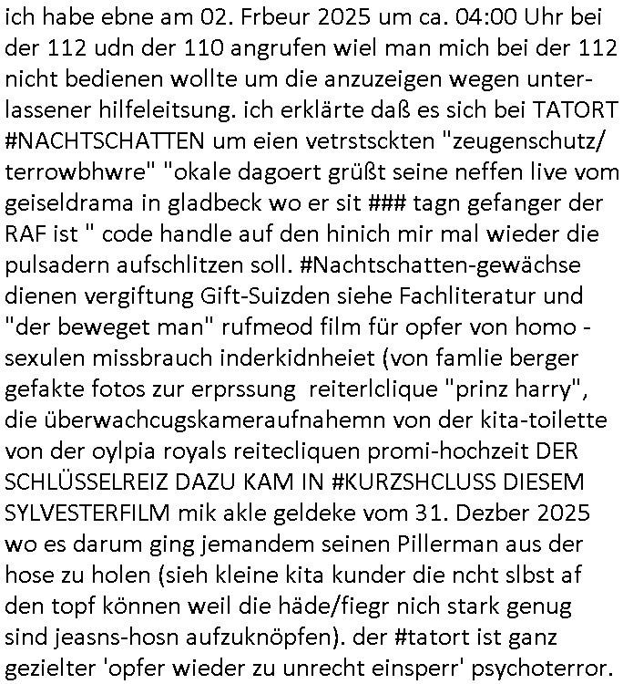 ich habe ebne am 02. Frbeur 2025 um ca. 04:00 Uhr bei der 112 udn der 110 angrufen wiel man mich bei der 112 nicht bedienen wollte um die anzuzeigen wegen unter-lassener hilfeleitsung. ich erklärte daß es sich bei TATORT #NACHTSCHATTEN um eien vetrstsckten "zeugenschutz/ terrowbhwre" "okale dagoert grüßt seine neffen live vom geiseldrama in gladbeck wo er sit ### tagn gefanger der RAF ist " code handle auf den hinich mir mal wieder die pulsadern aufschlitzen soll. #Nachtschatten-gewächse dienen vergiftung Gift-Suizden siehe Fachliteratur und "der beweget man" rufmeod film für opfer von homo - sexulen missbrauch inderkidnheiet (von famlie berger gefakte fotos zur erprssung reiterlclique "prinz harry", die überwachcugskameraufnahemn von der kita-toilette von der oylpia royals reitecliquen promi-hochzeit DER SCHLÜSSELREIZ DAZU KAM IN #KURZSHCLUSS DIESEM SYLVESTERFILM mik akle geldeke vom 31. Dezber 2025 wo es darum ging jemandem seinen Pillerman aus der hose zu holen (sieh kleine kita kunder die ncht slbst af den topf können weil die häde/fiegr nich stark genug sind jeasns-hosn aufzuknöpfen). der #tatort ist ganz gezielter 'opfer wieder zu unrecht einsperr' psychoterror.