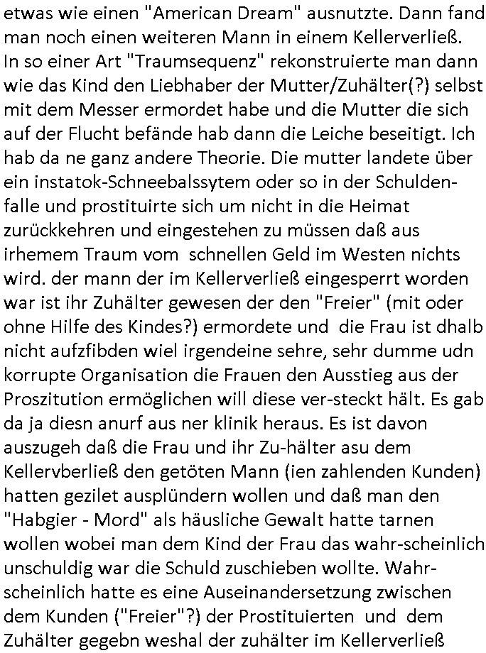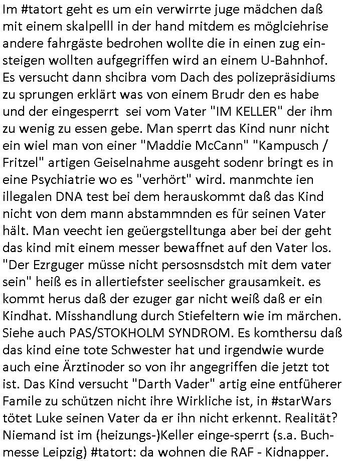 Im #tatort geht es um ein verwirrte juge mädchen daß mit einem skalpelll in der hand mitdem es möglciehrise andere fahrgäste bedrohen wollte die in einen zug ein-steigen wollten aufgegriffen wird an einem U-Bahnhof.Es versucht dann shcibra vom Dach des polizepräsidiums zu sprungen erklärt was von einem Brudr den es habe und der eingesperrt sei vom Vater "IM KELLER" der ihm zu wenig zu essen gebe. Man sperrt das Kind nunr nicht ein wiel man von einer "Maddie McCann" "Kampusch / Fritzel" artigen Geiselnahme ausgeht sodenr bringt es in eine Psychiatrie wo es "verhört" wird. manmchte ien illegalen DNA test bei dem herauskommt daß das Kind nicht von dem mann abstammnden es für seinen Vater hält. Man veecht ien geüergstelltunga aber bei der geht das kind mit einem messer bewaffnet auf den Vater los. "Der Ezrguger müsse nicht persosnsdstch mit dem vater sein" heiß es in allertiefster seelischer grausamkeit. es kommt herus daß der ezuger gar nicht weiß daß er ein Kindhat. Misshandlung durch Stiefeltern wie im märchen. Siehe auch PAS/STOKHOLM SYNDROM. Es komthersu daß das kind eine tote Schwester hat und irgendwie wurde auch eine Ärztinoder so von ihr angegriffen die jetzt tot ist. Das Kind versucht "Darth Vader" artig eine entfüherer Famile zu schützen nicht ihre Wirkliche ist, in #starWars tötet Luke seinen Vater da er ihn nicht erkennt. Realität? Niemand ist im (heizungs-)Keller einge-sperrt (s.a. Buch-messe Leipzig) #tatort: da wohnen die RAF - Kidnapper.