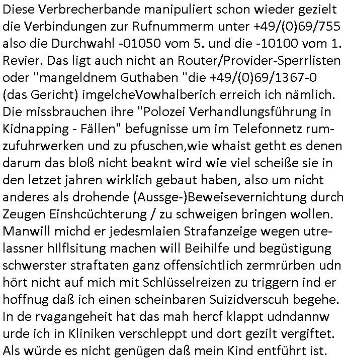 Diese Verbrecherbande manipuliert schon wieder gezielt die Verbindungen zur Rufnummerm unter +49/(0)69/755 also die Durchwahl -01050 vom 5. und die -10100 vom 1. Revier. Das ligt auch nicht an Router/Provider-Sperrlisten oder "mangeldnem Guthaben "die +49/(0)69/1367-0 (das Gericht) imgelcheVowhalberich erreich ich nämlich. Die missbrauchen ihre "Polozei Verhandlungsführung in Kidnapping - Fällen" befugnisse um im Telefonnetz rum- zufuhrwerken und zu pfuschen,wie whaist getht es denen darum das bloß nicht beaknt wird wie viel scheiße sie in den letzet jahren wirklich gebaut haben, also um nicht anderes als drohende (Aussge-)Beweisevernichtung durch Zeugen Einshcüchterung / zu schweigen bringen wollen. Manwill michd er jedesmlaien Strafanzeige wegen utre-lassner hIlflsitung machen will Beihilfe und begüstigung schwerster straftaten ganz offensichtlich zermrürben udn hört nicht auf mich mit Schlüsselreizen zu triggern ind er hoffnug daß ich einen scheinbaren Suizidverscuh begehe. In de rvagangeheit hat das mah hercf klappt udndannw urde ich in Kliniken verschleppt und dort gezilt vergiftet. Als würde es nicht genügen daß mein Kind entführt ist.
