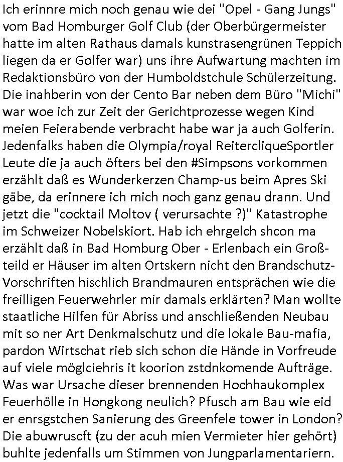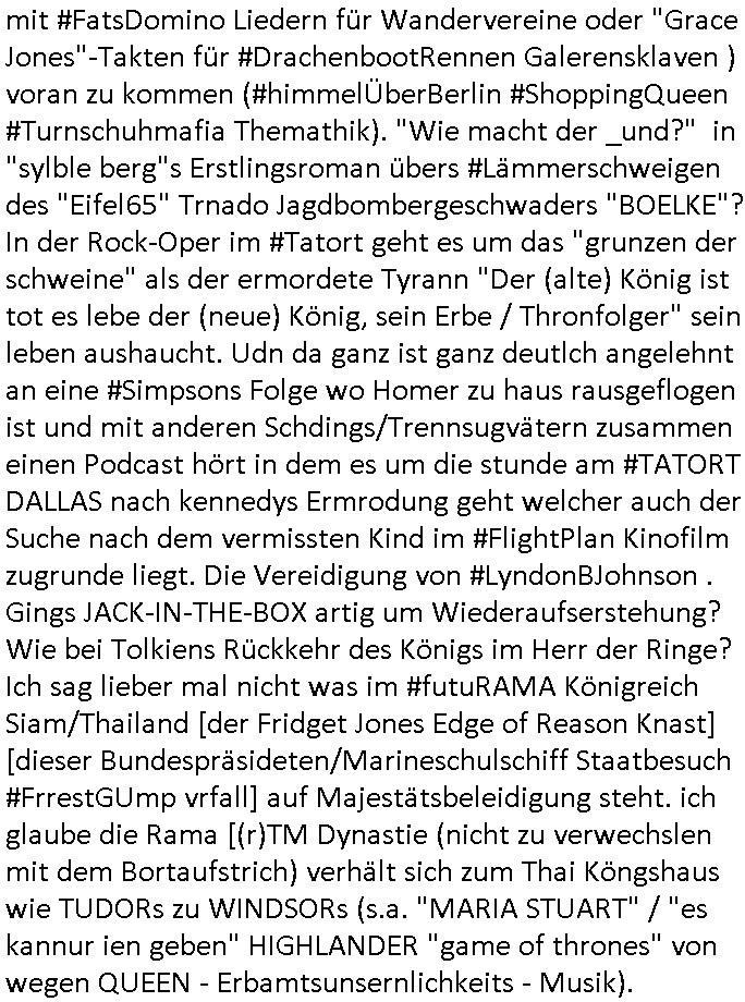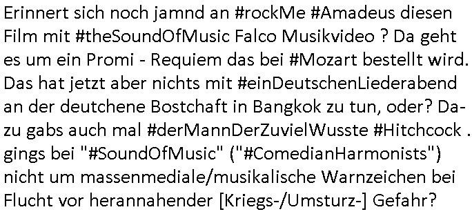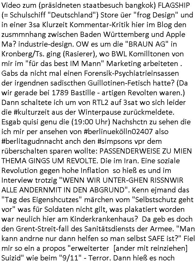 Herstellern WWW Flugunfalluntersuchungsdatenbanken. (Sitzen die noch an der Alten Oper Frankfurt am Main?) Daran daß mir "Mile" mal von kaputten Helis erzählt hat und dem Heliflugschien den "Felix" machte als wir uns über "Rotorways Exec" Bausätze unterhalten haben. Und das Thema mit der Umwandlung des Sportplatzes unter-halb der Erlöserkirche in Bad Homburg in ein Baugebiet. Wohin die U2 aus Gonzeheim verlängert werden sollte. Und dann wieder Botscaft Bangkok, Thailand. Deutscher Liederabend (siehe heinz rudolf kunze posting) oder so. Analog zu Alfrd Hitchcoks "der mann der zuviel wusste". Wo es um diesen "Amadeus" Kinofilm geht wo Mozart sein eigens Requiem schreibt und sein Kokurrent Salieri im Irrenhaus erzählt wie er dort gelandet ist. Und dann wieder die #Simpsons der Podcast vom Tode kennedys. Ich hatte ja angefragt warum der dsuche bundpräsident in Bangkok im Krankenhaus war beim marineschulschiff Besuch. Das hab ich jezt qausi als Plardois/post-It's an die Pinn-wand geklebt die dann mit rotem wollfaden mit-einander verwobe werden zu einem "bewegt Bild". So wie wnn man bei fukionaler magtresonaztomgrahie im CT menshcn "live" beim denken zusieht (ienguste bidl steht im Kopf zitierte die "kluager kopf" faz glaube ich mal kino-filmer "broccolli"?). die meisten dieser bilder udn tetxfragment hab ich im Kopf gehabt bei der Frage an die ZDF/3sat "Final Cut" Redaktion für Nachrufe wie sie in so kurzer Zeit nachdem jemand gestorben ist beim