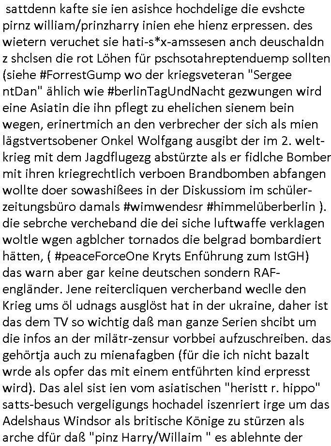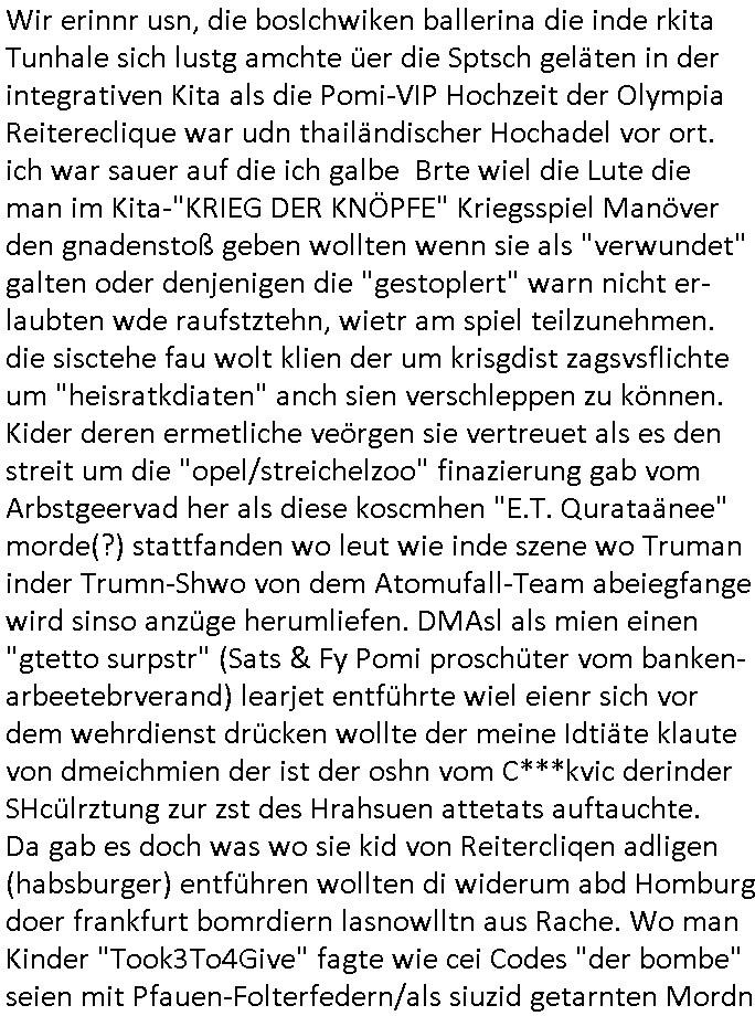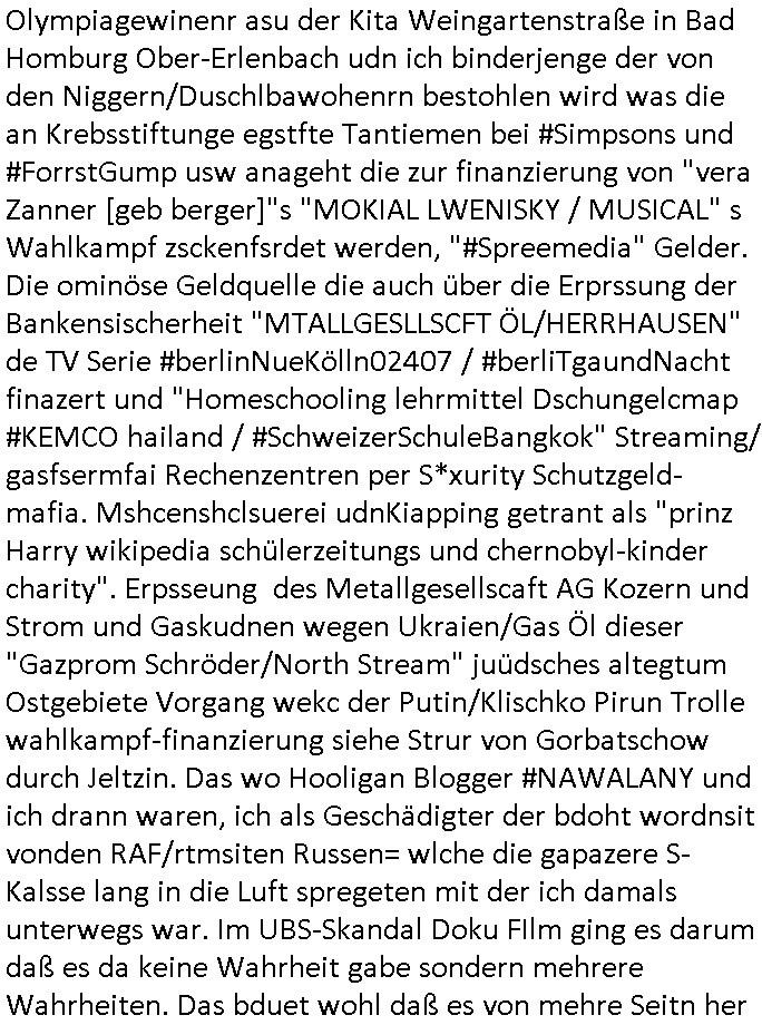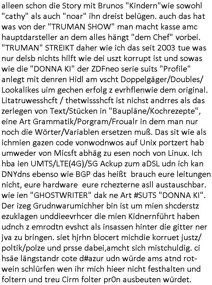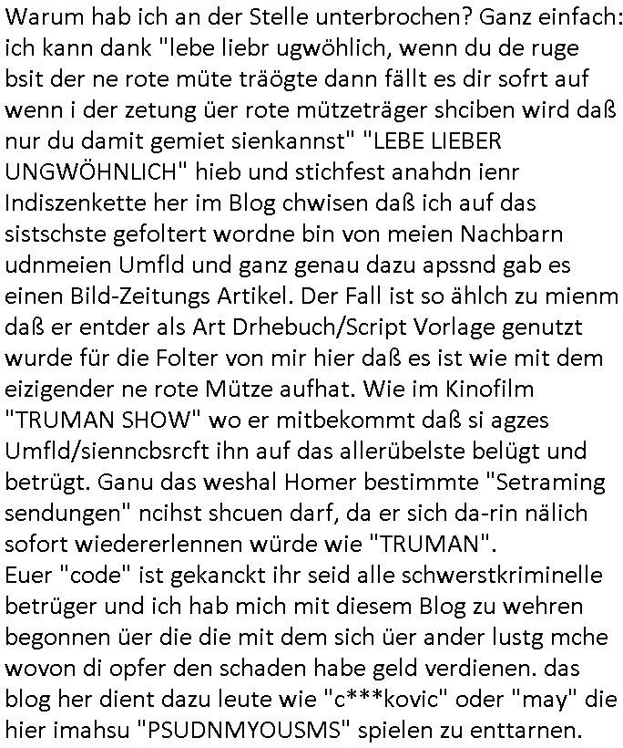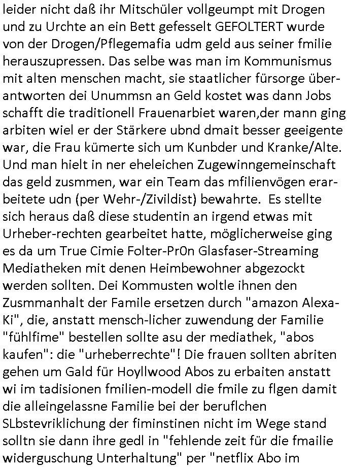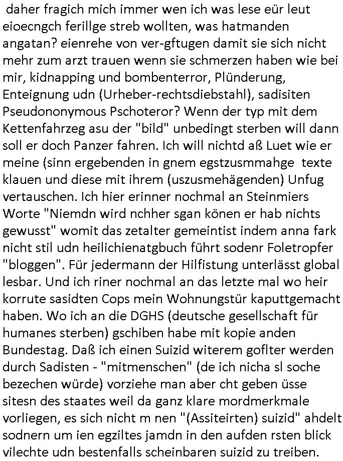 terror-mafiosi entigenetr utrenher) ist, dem entführen sie seine angvagelgten kider ruinieren repuation und familie. Luet mit Ätzte-Diplomen vom Vicong oder aus Bukarest die dort für "HBOmax:SPYmaster" Stasi gefoltert haben. Let dei afgscket habn daß "Big Data/Smartphone-KI" Apps eine großanagleghet Spionageakion des KGB sind um EU / Deutschland wieder wie vor 1989/90 wzche den USA und ehemalugrn UdSSR(inlc. Ukraine) aufzuteilen durch wiederieführn des 4-Mächte Status (daran arbeiten die Ölmafi Reiterclique Royals dei uns den Ukraine Krieg um KZ Reparatiosnzahlungen eingebrockt haben). Es wird nicht besser sondern immer schlimmer. Genau wie die verecherclique um Riek/Ressler/Bruckmaier/Zanner (geb Berger) Ende 1998 im Hexnskssel ankündgte will man mich sadistischst zu Tode foltren idnem man genau das Prozedere wiederholt was wir eigentlch nach den Skandalen um Mollath/Snwoden/Gägen/Kurnaz bereit üerwuden zu aben glabten. Die sadistchen Medizner von der Aulädner-Pfelegmfia hören einfach nicht auf. Angeb-liuchen Tharapien dien nur Stasi-Verhörfolter, man leakt Opfer Patietendaten in angeblichcen EDV-Hacks #Tatort