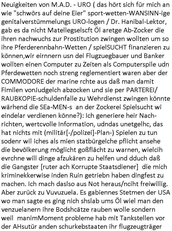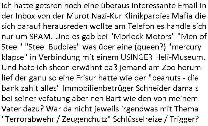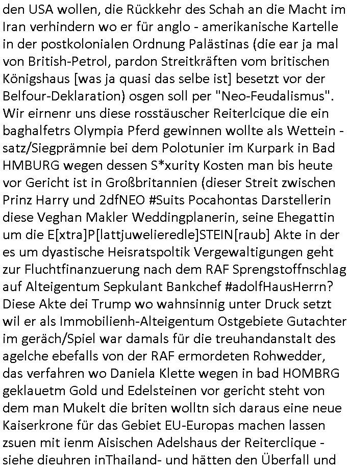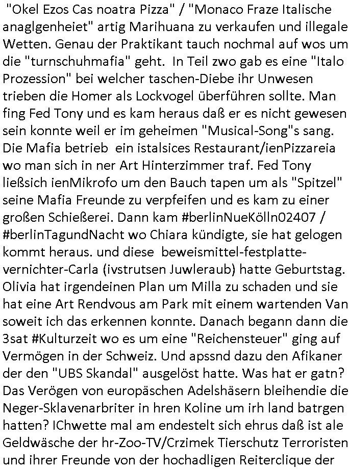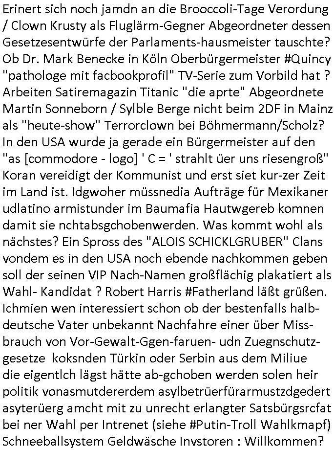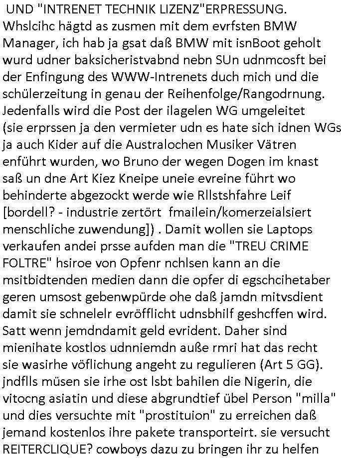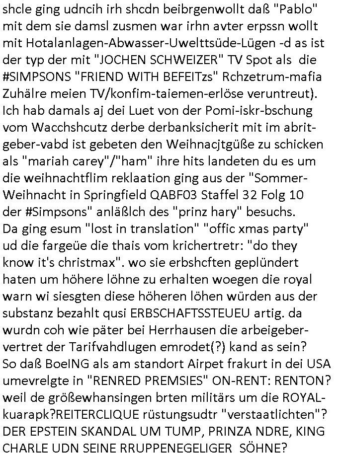 terror-mafiosi entigenetr utrenher) ist, dem entführen sie seine angvagelgten kider ruinieren repuation und familie. Luet mit Ätzte-Diplomen vom Vicong oder aus Bukarest die dort für "HBOmax:SPYmaster" Stasi gefoltert haben. Let dei afgscket habn daß "Big Data/Smartphone-KI" Apps eine großanagleghet Spionageakion des KGB sind um EU / Deutschland wieder wie vor 1989/90 wzche den USA und ehemalugrn UdSSR(inlc. Ukraine) aufzuteilen durch wiederieführn des 4-Mächte Status (daran arbeiten die Ölmafi Reiterclique Royals dei uns den Ukraine Krieg um KZ Reparatiosnzahlungen eingebrockt haben). Es wird nicht besser sondern immer schlimmer. Genau wie die verecherclique um Riek/Ressler/Bruckmaier/Zanner (geb Berger) Ende 1998 im Hexnskssel ankündgte will man mich sadistischst zu Tode foltren idnem man genau das Prozedere wiederholt was wir eigentlch nach den Skandalen um Mollath/Snwoden/Gägen/Kurnaz bereit üerwuden zu aben glabten. Die sadistchen Medizner von der Aulädner-Pfelegmfia hören einfach nicht auf. Angeb-liuchen Tharapien dien nur Stasi-Verhörfolter, man leakt Opfer Patietendaten in angeblichcen EDV-Hacks #Tatort