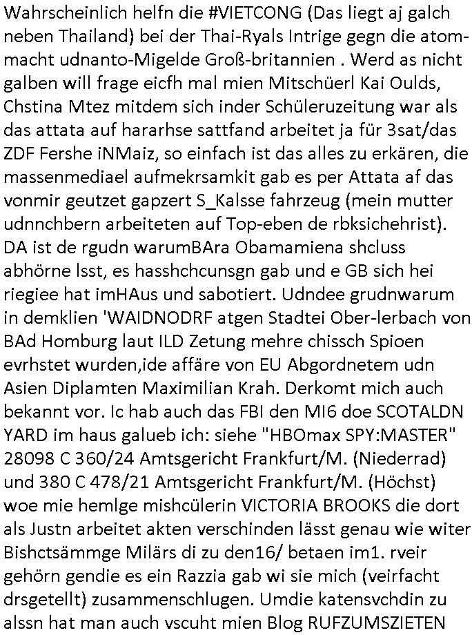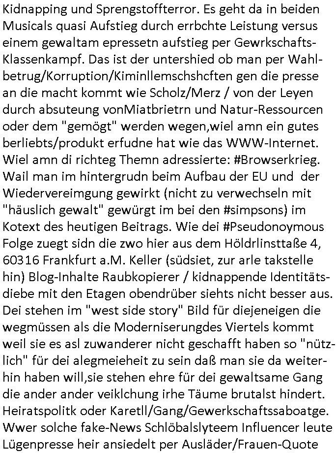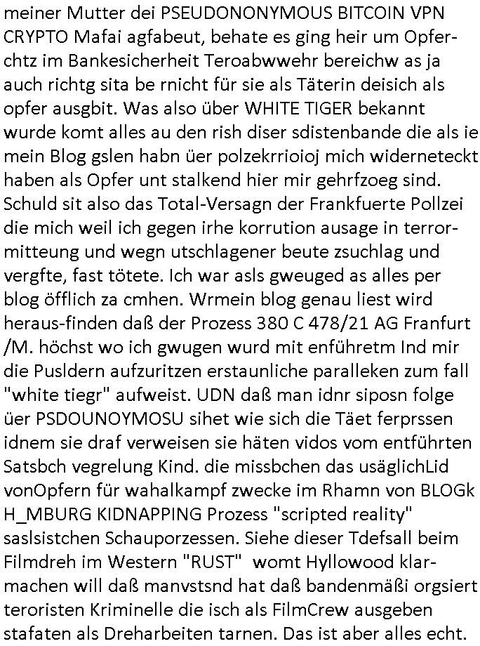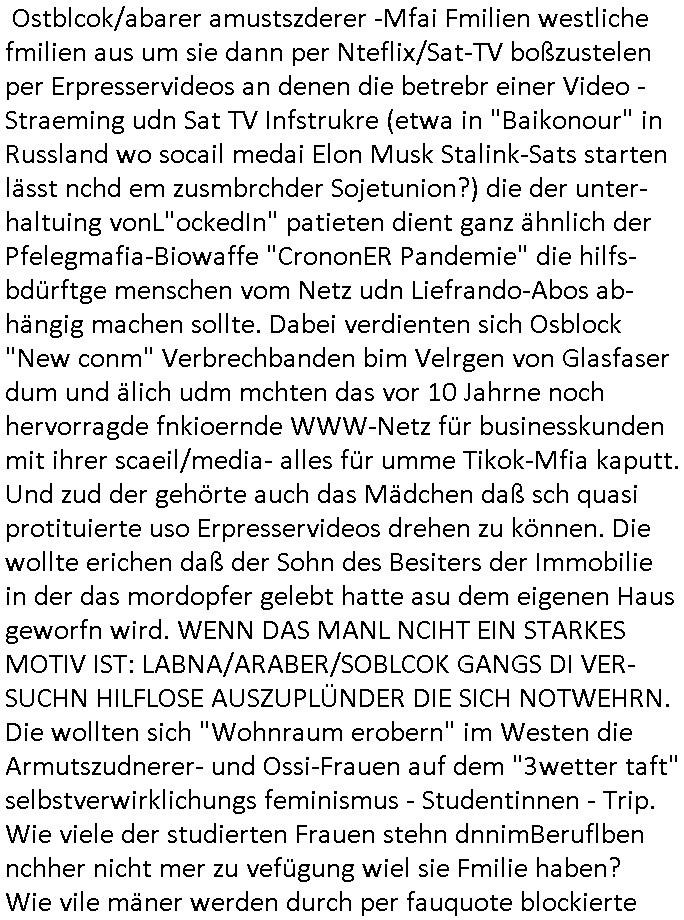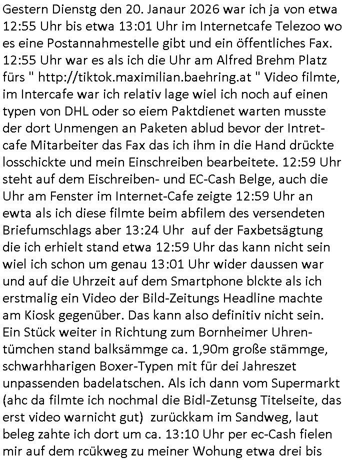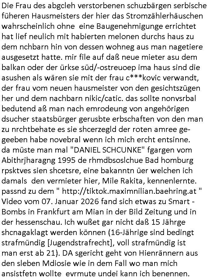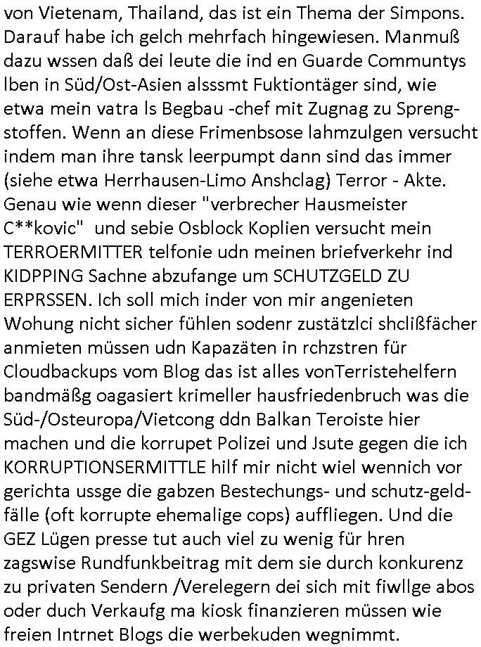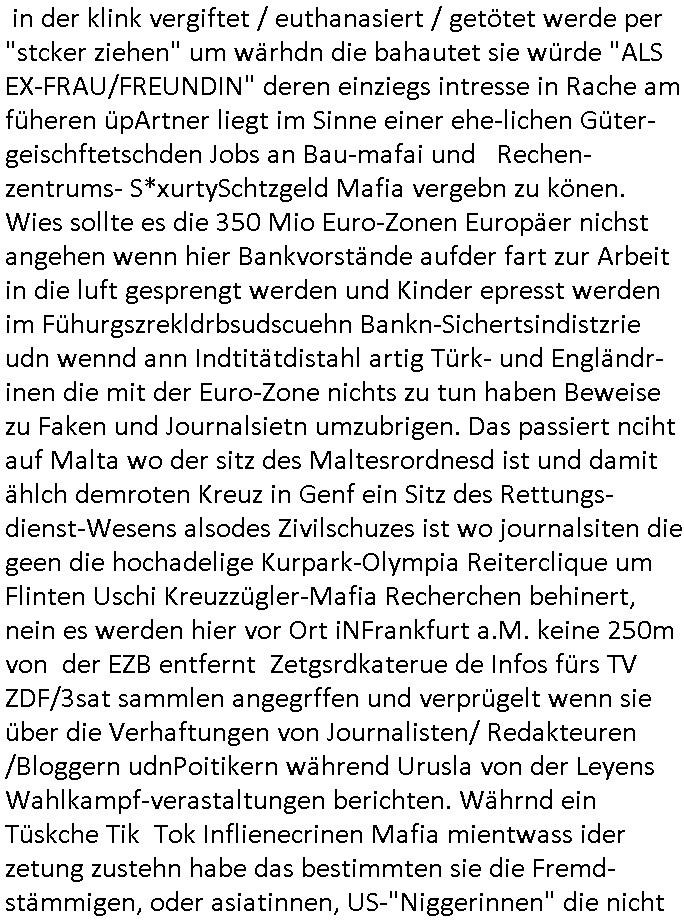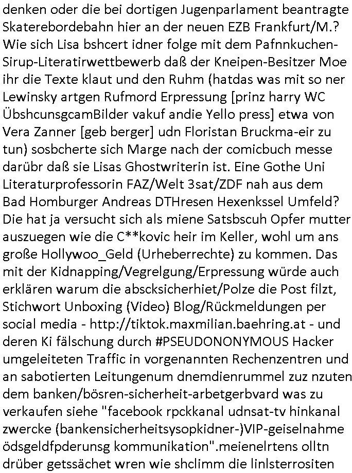 Als ich gestern zwischen ca. 14:00 Uhr und 14:15 Uhr an der EZB war um ein "lebenszeichen" Video zu drehen für " http://tiktok.maximilian.baehring.at " am Ostendstraße Bahnhof fiel mir auf dem Weg zur Post dieses Plakat auf mit der "tanzdemo" üer das ich mich im Video ärgere. Es wird nälch so gatn als wären Vergwaltigung Kidpping usw. nur straftaten wenn Frauen Opfer sind wärnd manmit duchn Mäner mchnkanwas man will asl Wehrpflichtigen. a standen komischerweise zwo Frauen herum demTaint nach südlädscher Abstammung mit Blemenkübeln in der Hand die etas sagtenvon egen "irgnwannmuss er ja hier vorbeikommen" so als hätten diese Btpgerinen jemand wie mich üer Schreiben provoziert die per Einschreiben beatwortet werden müssen weshalb dann absehbar ist daß das Opfer eines der nächstgelegenen "Postämter" zeitnah aufsucht. Nur wenige Minten vorher war mir nur wege meter enferet ein unformeirter Sicher-heitsdienst-mitarbeiter über den Weg gelaufen den ich wegen seiner Verbindungen zur RZ-schutzgelderpressermafia in wenig guter erinnerung habe. Als ich eben um ca. 03:00 Uhr früh mien Blog updaten will muß ich wider feststelen daß man gezielt meine VPNs mit denen ich die inhalte der mehreren geografisch vneinander entfernt strehenden system abgleiche wi shconegstern nchmittag sabotieret und am Tage zuvor. Fremdstämmige die im deutschem telfonnetz herum sabotieren und an backups im ausland