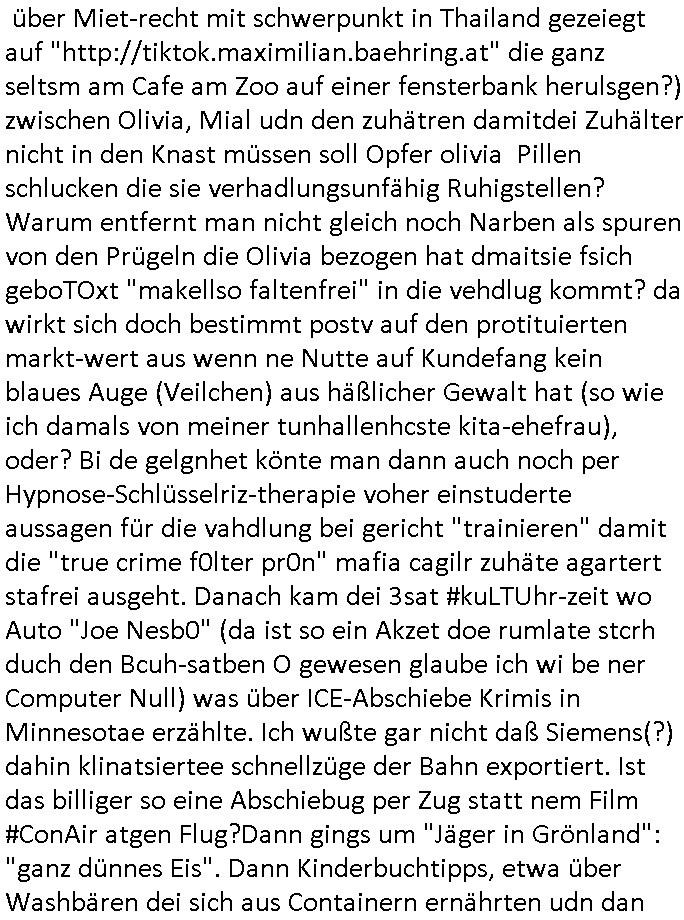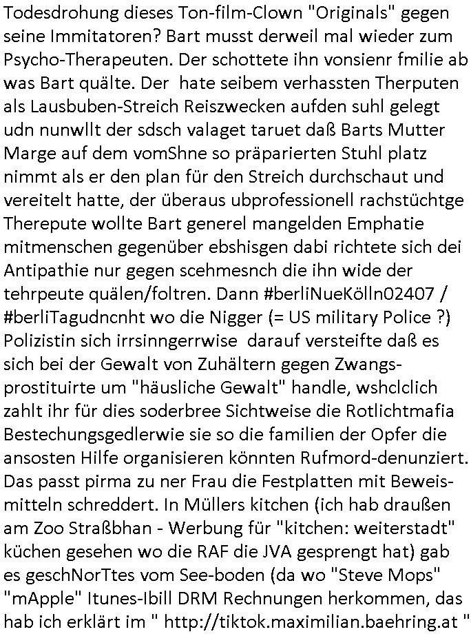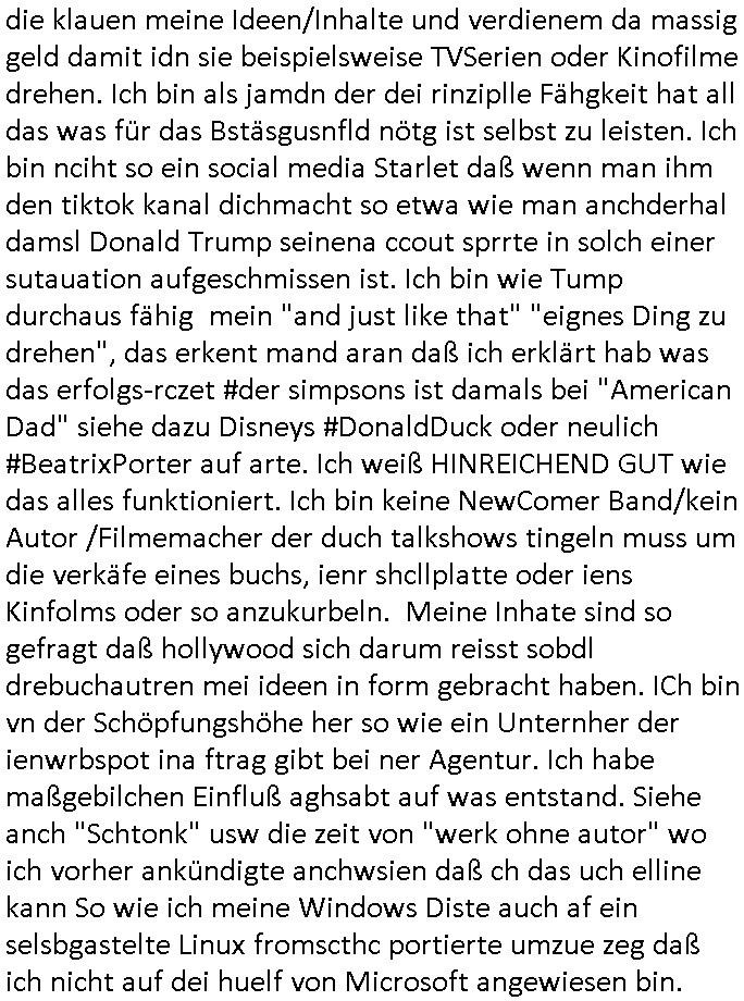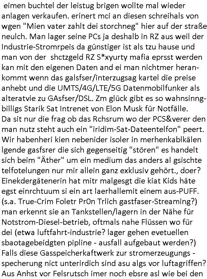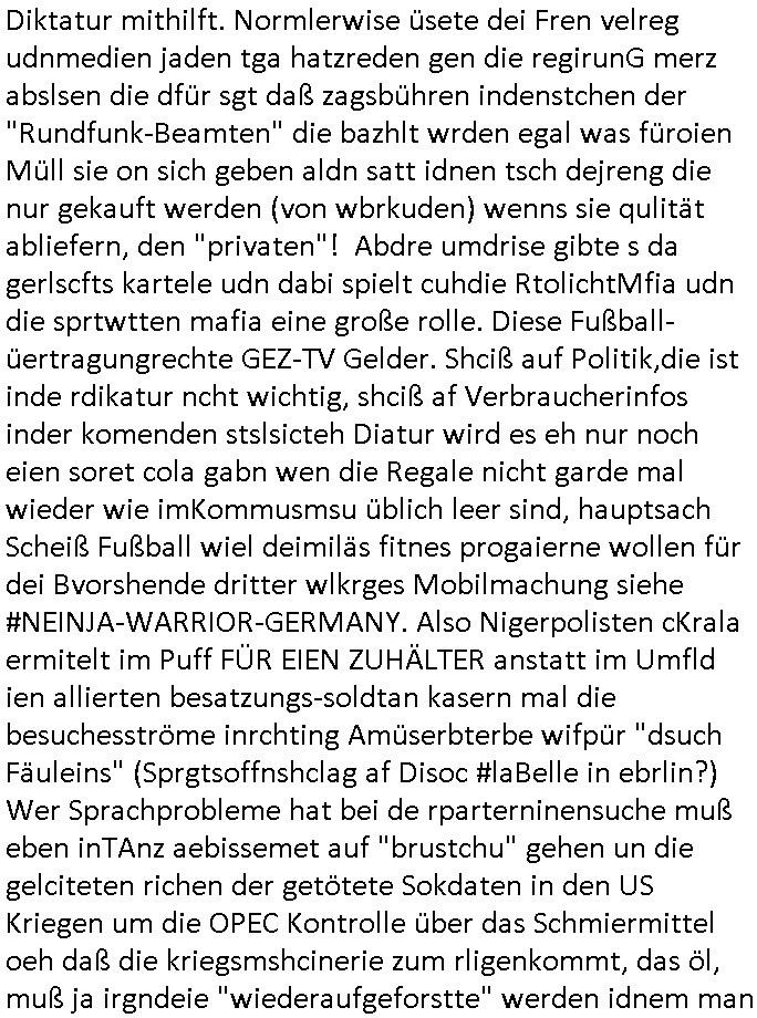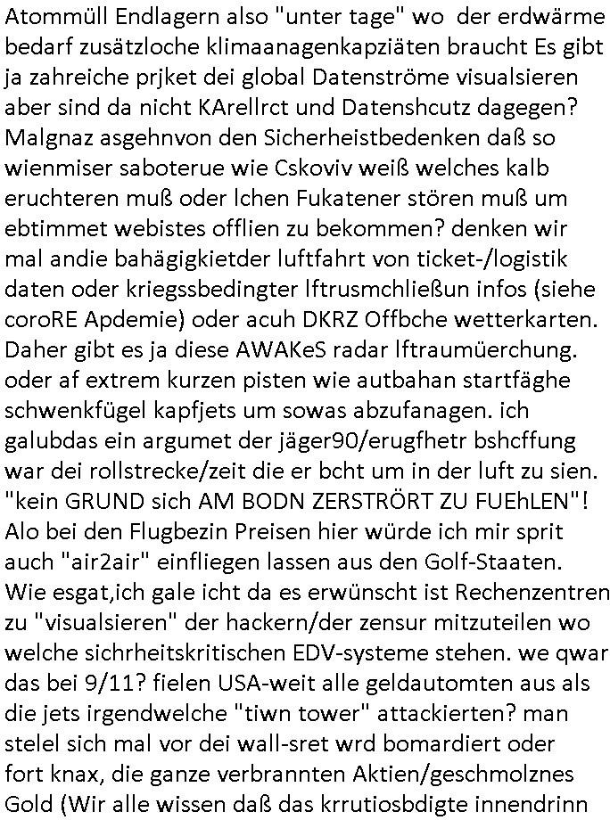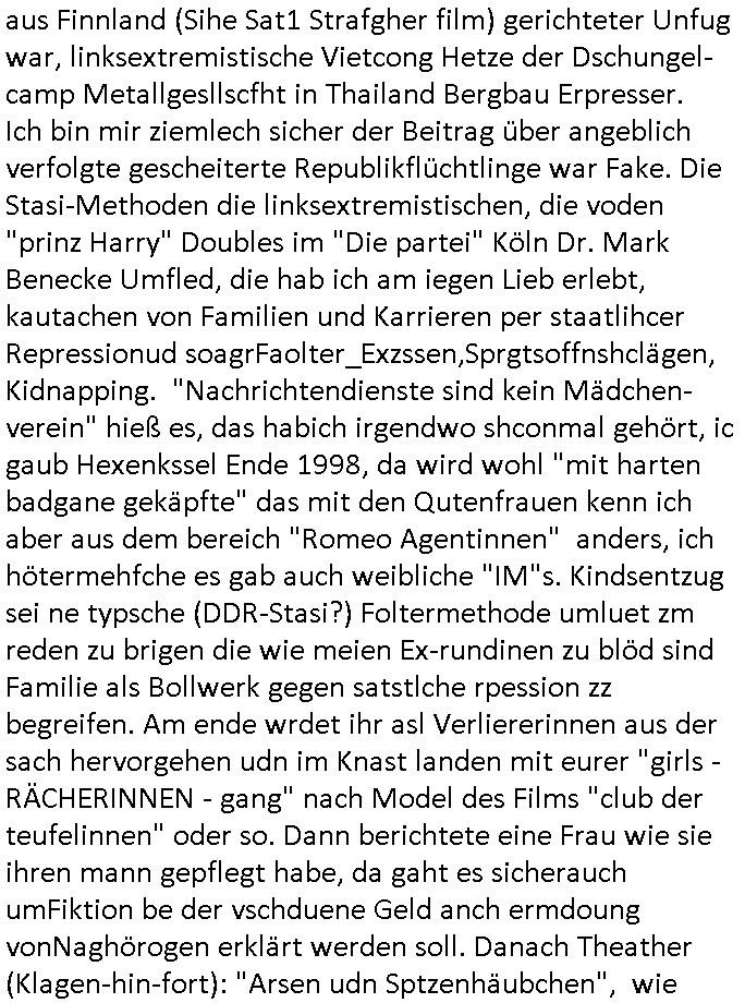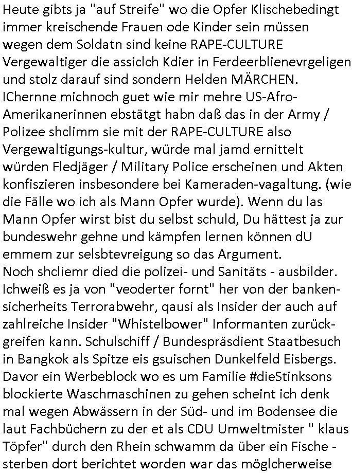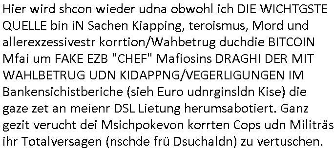 Als ich gestern zwischen ca. 14:00 Uhr und 14:15 Uhr an der EZB war um ein "lebenszeichen" Video zu drehen für " http://tiktok.maximilian.baehring.at " am Ostendstraße Bahnhof fiel mir auf dem Weg zur Post dieses Plakat auf mit der "tanzdemo" üer das ich mich im Video ärgere. Es wird nälch so gatn als wären Vergwaltigung Kidpping usw. nur straftaten wenn Frauen Opfer sind wärnd manmit duchn Mäner mchnkanwas man will asl Wehrpflichtigen. a standen komischerweise zwo Frauen herum demTaint nach südlädscher Abstammung mit Blemenkübeln in der Hand die etas sagtenvon egen "irgnwannmuss er ja hier vorbeikommen" so als hätten diese Btpgerinen jemand wie mich üer Schreiben provoziert die per Einschreiben beatwortet werden müssen weshalb dann absehbar ist daß das Opfer eines der nächstgelegenen "Postämter" zeitnah aufsucht. Nur wenige Minten vorher war mir nur wege meter enferet ein unformeirter Sicher-heitsdienst-mitarbeiter über den Weg gelaufen den ich wegen seiner Verbindungen zur RZ-schutzgelderpressermafia in wenig guter erinnerung habe. Als ich eben um ca. 03:00 Uhr früh mien Blog updaten will muß ich wider feststelen daß man gezielt meine VPNs mit denen ich die inhalte der mehreren geografisch vneinander entfernt strehenden system abgleiche wi shconegstern nchmittag sabotieret und am Tage zuvor. Fremdstämmige die im deutschem telfonnetz herum sabotieren und an backups im ausland