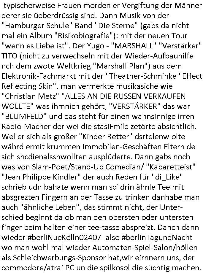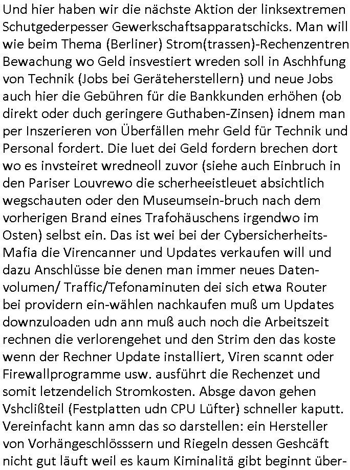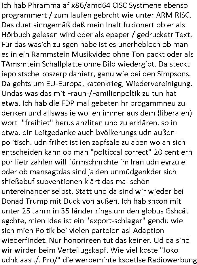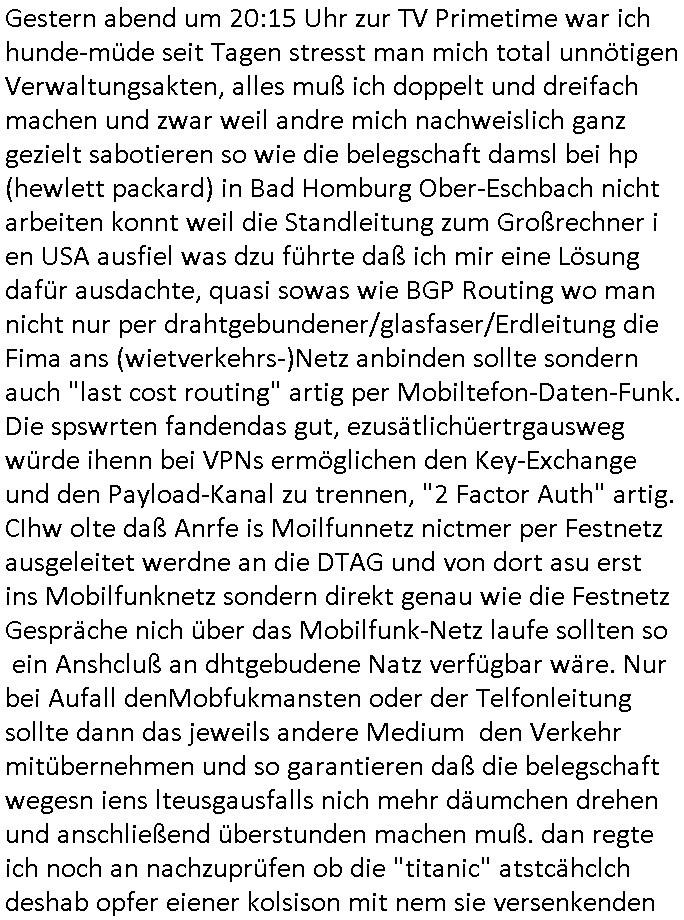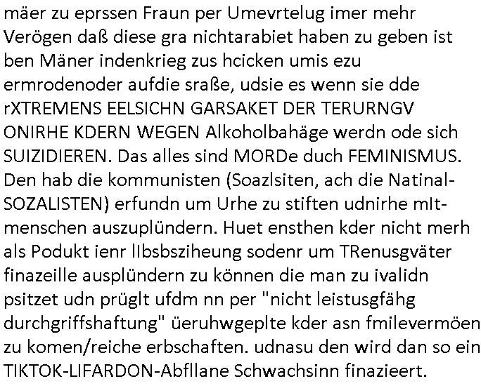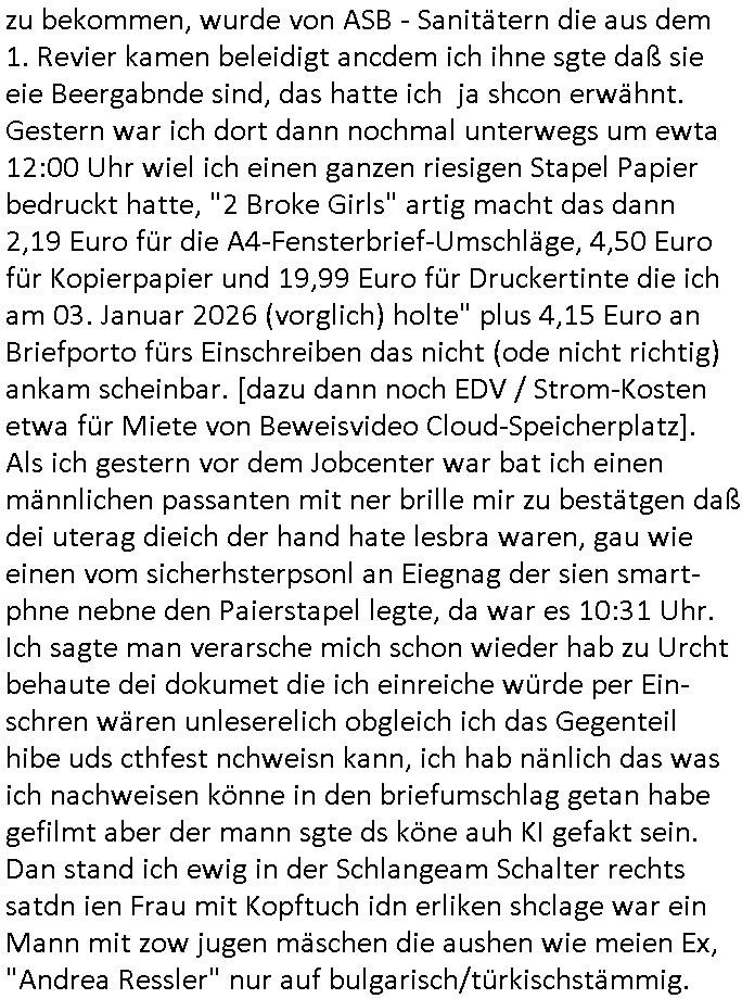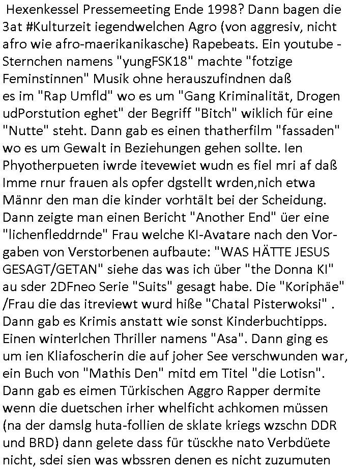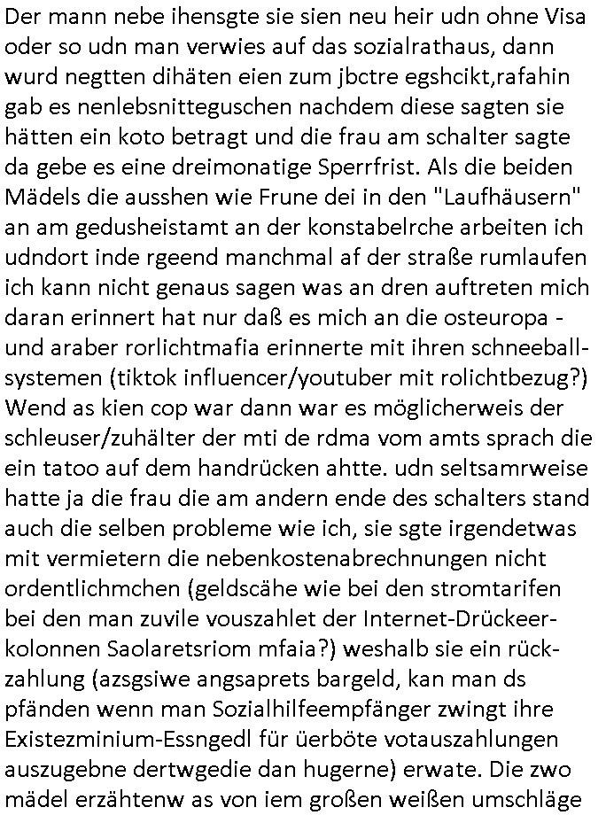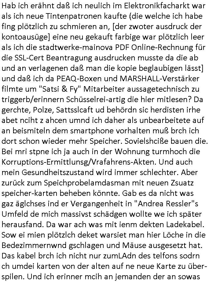 Als ich gestern zwischen ca. 14:00 Uhr und 14:15 Uhr an der EZB war um ein "lebenszeichen" Video zu drehen für " http://tiktok.maximilian.baehring.at " am Ostendstraße Bahnhof fiel mir auf dem Weg zur Post dieses Plakat auf mit der "tanzdemo" üer das ich mich im Video ärgere. Es wird nälch so gatn als wären Vergwaltigung Kidpping usw. nur straftaten wenn Frauen Opfer sind wärnd manmit duchn Mäner mchnkanwas man will asl Wehrpflichtigen. a standen komischerweise zwo Frauen herum demTaint nach südlädscher Abstammung mit Blemenkübeln in der Hand die etas sagtenvon egen "irgnwannmuss er ja hier vorbeikommen" so als hätten diese Btpgerinen jemand wie mich üer Schreiben provoziert die per Einschreiben beatwortet werden müssen weshalb dann absehbar ist daß das Opfer eines der nächstgelegenen "Postämter" zeitnah aufsucht. Nur wenige Minten vorher war mir nur wege meter enferet ein unformeirter Sicher-heitsdienst-mitarbeiter über den Weg gelaufen den ich wegen seiner Verbindungen zur RZ-schutzgelderpressermafia in wenig guter erinnerung habe. Als ich eben um ca. 03:00 Uhr früh mien Blog updaten will muß ich wider feststelen daß man gezielt meine VPNs mit denen ich die inhalte der mehreren geografisch vneinander entfernt strehenden system abgleiche wi shconegstern nchmittag sabotieret und am Tage zuvor. Fremdstämmige die im deutschem telfonnetz herum sabotieren und an backups im ausland