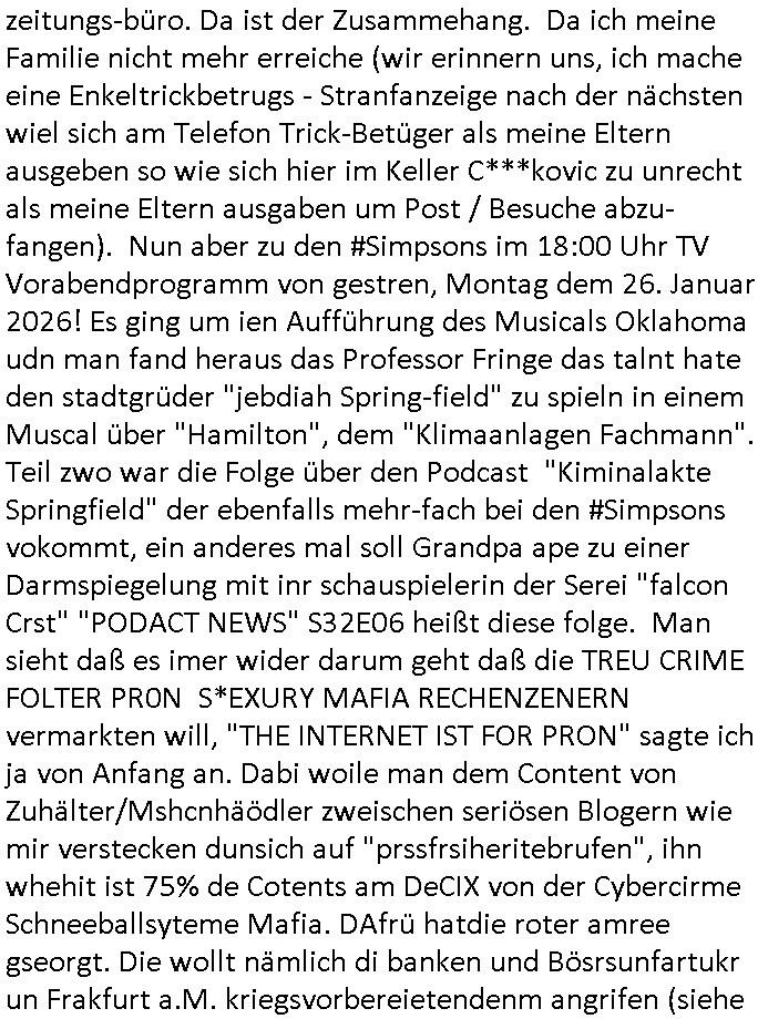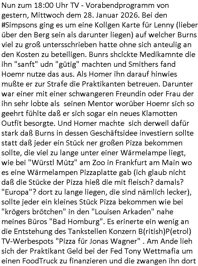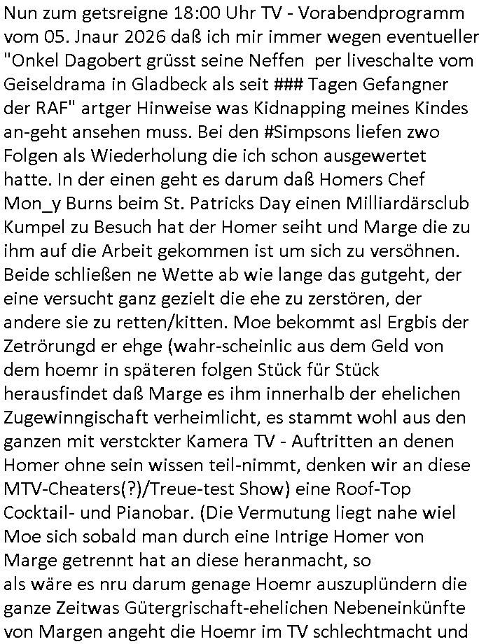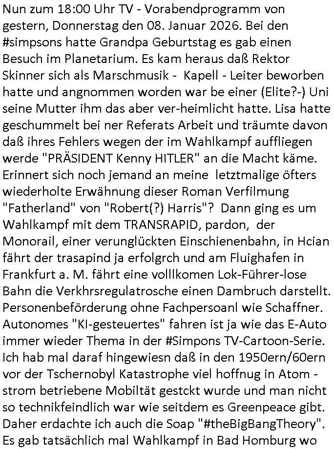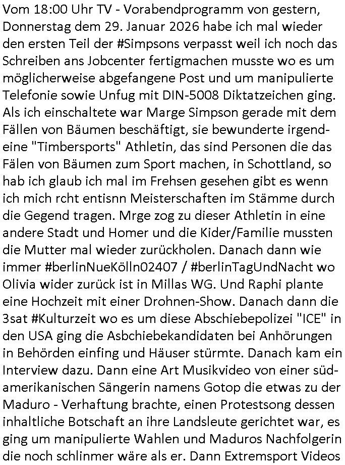 Vom 18:00 Uhr TV - Vorabendprogramm von gestern, Donnerstag dem 29. Januar 2026 habe ich mal wieder den ersten Teil der #Simpsons verpasst weil ich noch das Schreiben ans Jobcenter fertigmachen musste wo es um möglicherweise abgefangene Post und um manipulierte Telefonie sowie Unfug mit DIN-5008 Diktatzeichen ging. Als ich einschaltete war Marge Simpson gerade mit dem Fällen von Bäumen beschäftigt, sie bewunderte irgend- eine "Timbersports" Athletin, das sind Personen die das Fälen von Bäumen zum Sport machen, in Schottland, so hab ich glaub ich mal im Frehsen gesehen gibt es wenn ich mich rcht entisnn Meisterschaften im Stämme durch die Gegend tragen. Mrge zog zu dieser Athletin in eine andere Stadt und Homer und die Kider/Familie mussten die Mutter mal wieder zurückholen. Danach dann wie immer #berlinNueKölln02407 / #berlinTagUndNacht wo Olivia wider zurück ist in Millas WG. Und Raphi plante eine Hochzeit mit einer Drohnen-Show. Danach dann die 3sat #Kulturzeit wo es um diese Abschiebepolizei "ICE" in den USA ging die Asbchiebekandidaten bei Anhörungen in Behörden einfing und Häuser stürmte. Danach kam ein Interview dazu. Dann eine Art Musikvideo von einer süd- amerikanischen Sängerin namens Gotop die etwas zu der Maduro - Verhaftung brachte, einen Protestsong dessen inhaltliche Botschaft an ihre Landsleute gerichtet war, es ging um manipulierte Wahlen und Maduros Nachfolgerin die noch schlinmer wäre als er. Dann Extremsport Videos