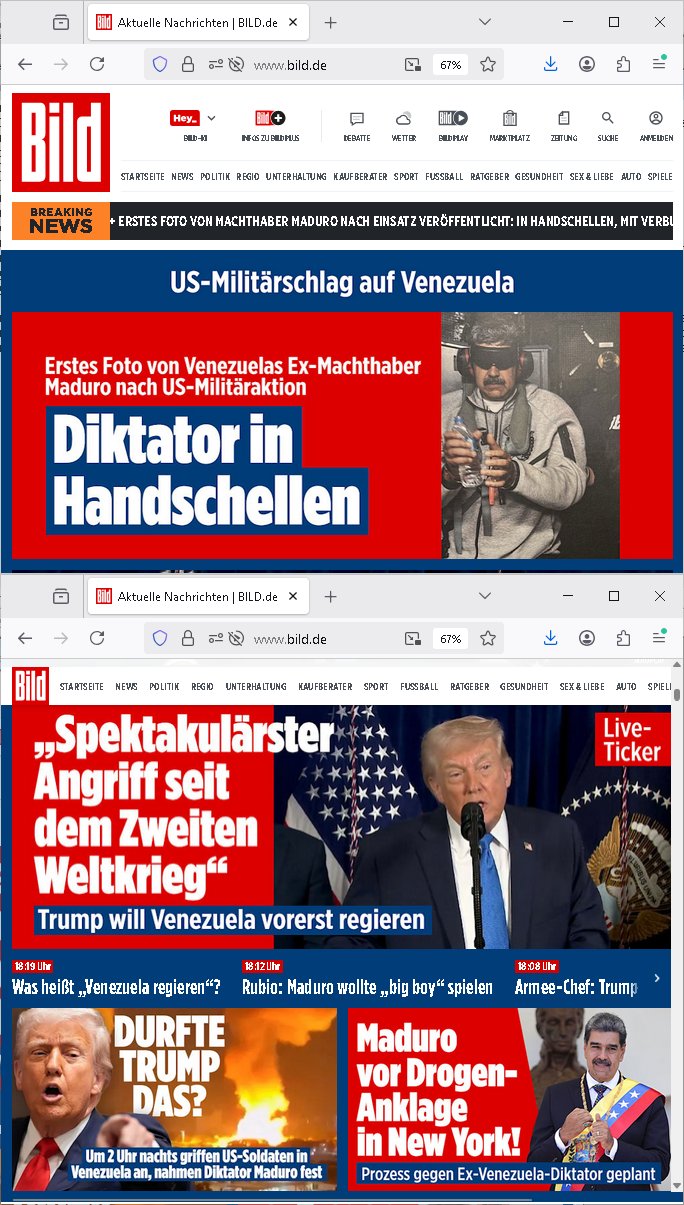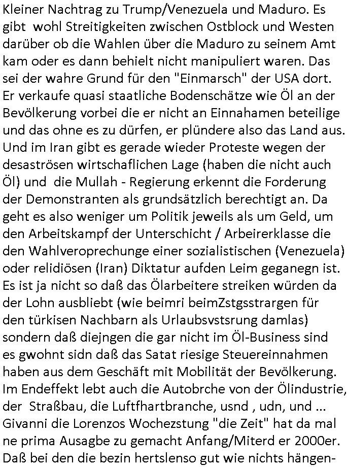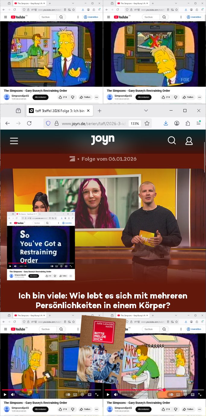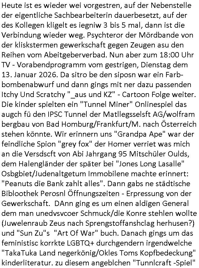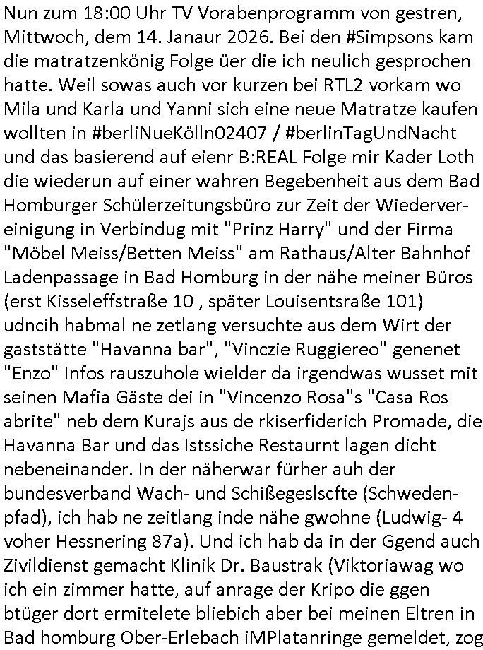 Vom 18:00 Uhr TV - Vorabendprogramm von gestern, Donnerstag dem 29. Januar 2026 habe ich mal wieder den ersten Teil der #Simpsons verpasst weil ich noch das Schreiben ans Jobcenter fertigmachen musste wo es um möglicherweise abgefangene Post und um manipulierte Telefonie sowie Unfug mit DIN-5008 Diktatzeichen ging. Als ich einschaltete war Marge Simpson gerade mit dem Fällen von Bäumen beschäftigt, sie bewunderte irgend- eine "Timbersports" Athletin, das sind Personen die das Fälen von Bäumen zum Sport machen, in Schottland, so hab ich glaub ich mal im Frehsen gesehen gibt es wenn ich mich rcht entisnn Meisterschaften im Stämme durch die Gegend tragen. Mrge zog zu dieser Athletin in eine andere Stadt und Homer und die Kider/Familie mussten die Mutter mal wieder zurückholen. Danach dann wie immer #berlinNueKölln02407 / #berlinTagUndNacht wo Olivia wider zurück ist in Millas WG. Und Raphi plante eine Hochzeit mit einer Drohnen-Show. Danach dann die 3sat #Kulturzeit wo es um diese Abschiebepolizei "ICE" in den USA ging die Asbchiebekandidaten bei Anhörungen in Behörden einfing und Häuser stürmte. Danach kam ein Interview dazu. Dann eine Art Musikvideo von einer süd- amerikanischen Sängerin namens Gotop die etwas zu der Maduro - Verhaftung brachte, einen Protestsong dessen inhaltliche Botschaft an ihre Landsleute gerichtet war, es ging um manipulierte Wahlen und Maduros Nachfolgerin die noch schlinmer wäre als er. Dann Extremsport Videos