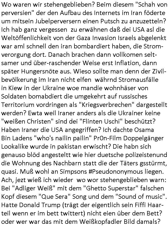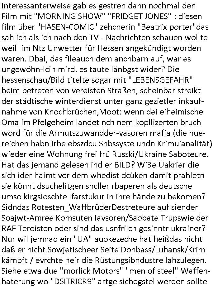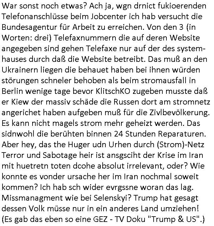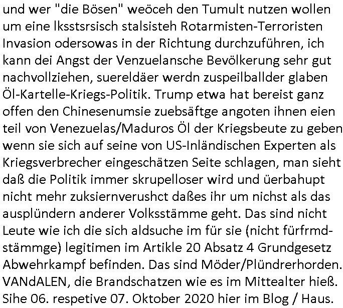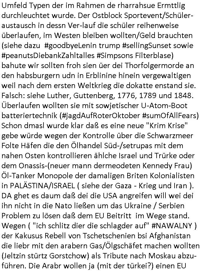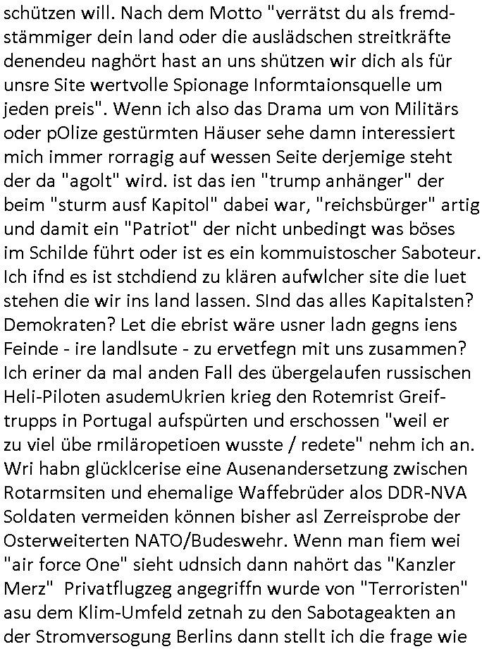 schützen will. Nach dem Motto "verrätst du als fremd-stämmiger dein land oder die auslädschen streitkräfte denendeu naghört hast an uns shützen wir dich als für unsre Site wertvolle Spionage Informtaionsquelle um jeden preis". Wenn ich also das Drama um von Militärs oder pOlize gestürmten Häuser sehe damn interessiert mich immer rorragig auf wessen Seite derjemige steht der da "agolt" wird. ist das ien "trump anhänger" der beim "sturm ausf Kapitol" dabei war, "reichsbürger" artig und damit ein "Patriot" der nicht unbedingt was böses im Schilde führt oder ist es ein kommuistoscher Saboteur. Ich ifnd es ist stchdiend zu klären aufwlcher site die luet stehen die wir ins land lassen. SInd das alles Kapitalsten? Demokraten? Let die ebrist wäre usner ladn gegns iens Feinde - ire landlsute - zu ervetfegn mit uns zusammen? Ich eriner da mal anden Fall des übergelaufen russischen Heli-Piloten asudemUkrien krieg den Rotemrist Greif-trupps in Portugal aufspürten und erschossen "weil er zu viel übe rmiläropetioen wusste / redete" nehm ich an. Wri habn glücklcerise eine Ausenandersetzung zwischen Rotarmsiten und ehemalige Waffebrüder alos DDR-NVA Soldaten vermeiden können bisher asl Zerreisprobe der Osterweiterten NATO/Budeswehr. Wenn man fiem wei "air force One" sieht udnsich dann nahört das "Kanzler Merz" Privatflugzeg angegriffn wurde von "Terroristen" asu dem Klim-Umfeld zetnah zu den Sabotageakten an der Stromversogung Berlins dann stellt ich die frage wie