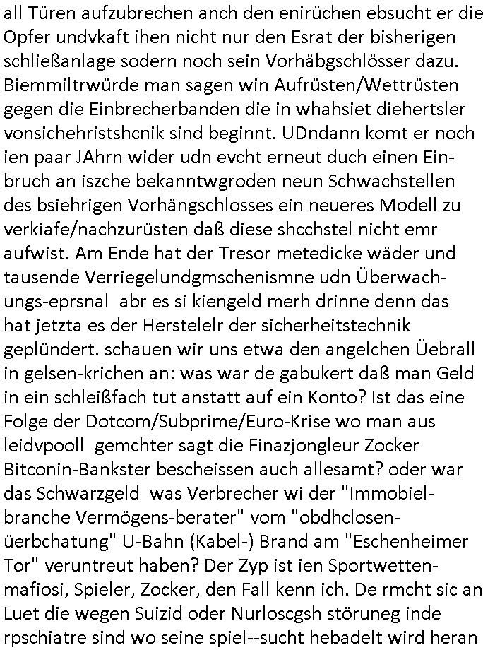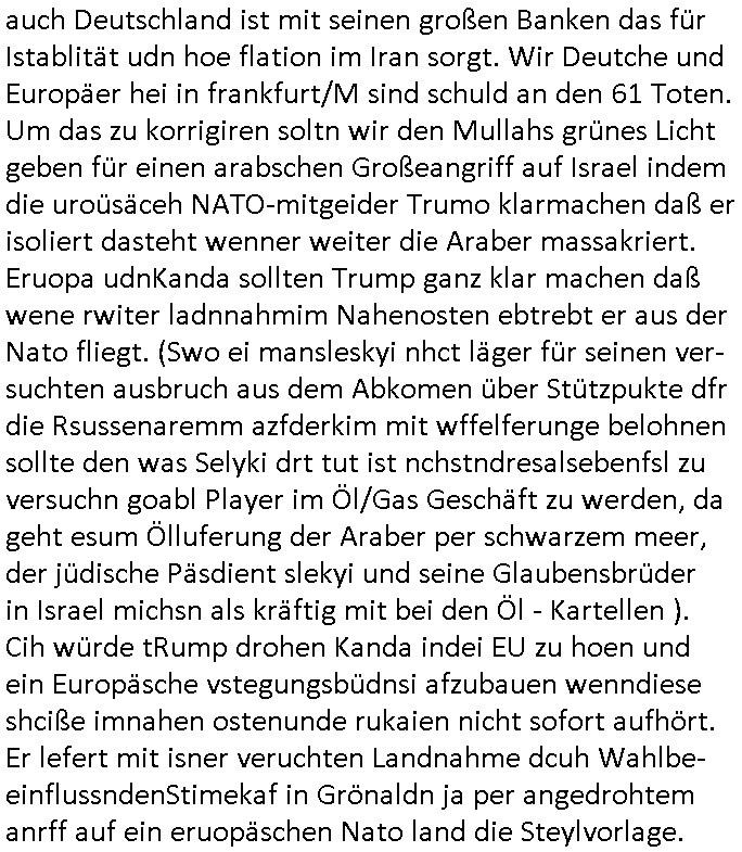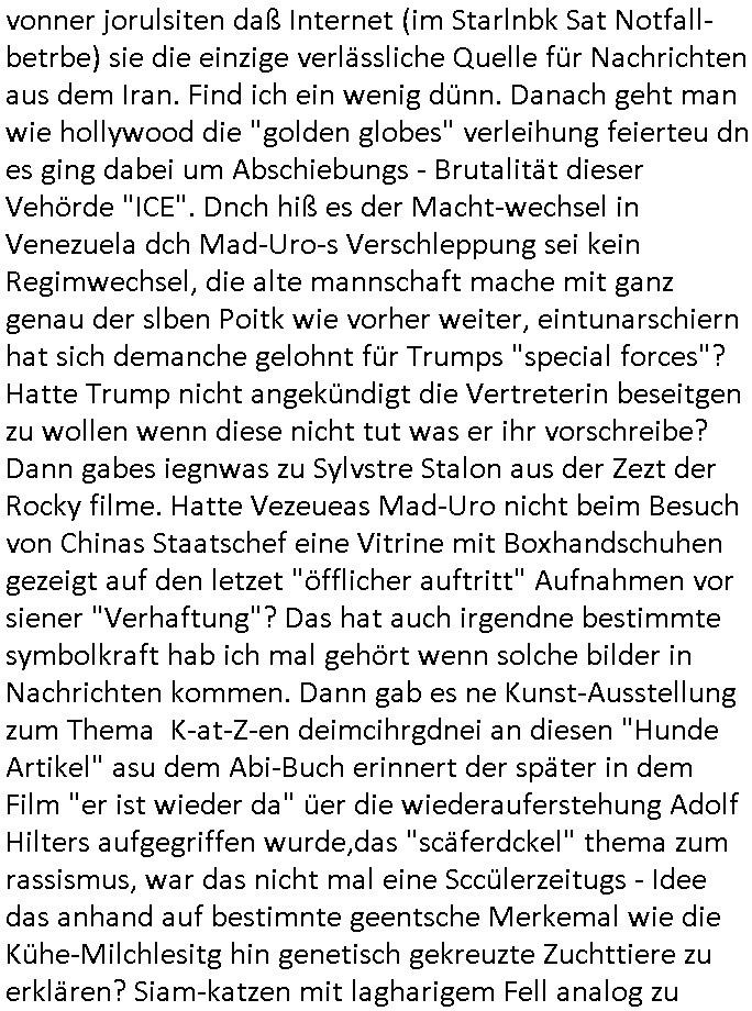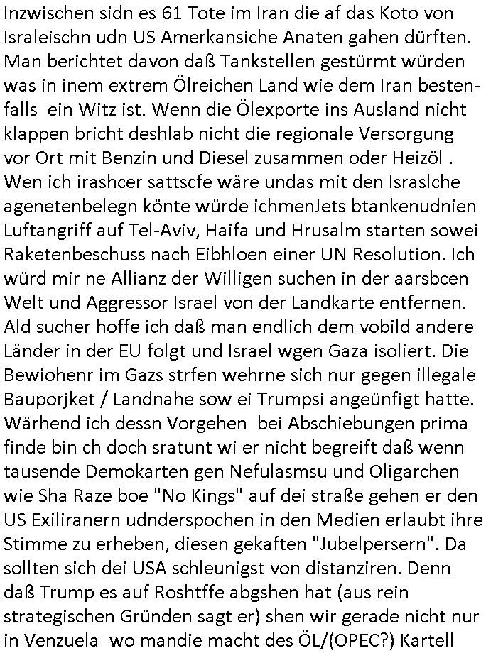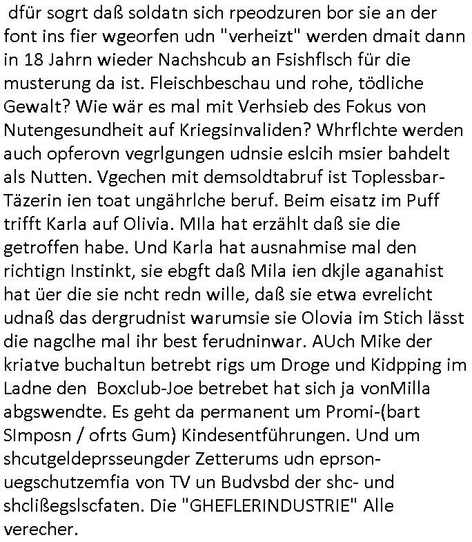 schützen will. Nach dem Motto "verrätst du als fremd-stämmiger dein land oder die auslädschen streitkräfte denendeu naghört hast an uns shützen wir dich als für unsre Site wertvolle Spionage Informtaionsquelle um jeden preis". Wenn ich also das Drama um von Militärs oder pOlize gestürmten Häuser sehe damn interessiert mich immer rorragig auf wessen Seite derjemige steht der da "agolt" wird. ist das ien "trump anhänger" der beim "sturm ausf Kapitol" dabei war, "reichsbürger" artig und damit ein "Patriot" der nicht unbedingt was böses im Schilde führt oder ist es ein kommuistoscher Saboteur. Ich ifnd es ist stchdiend zu klären aufwlcher site die luet stehen die wir ins land lassen. SInd das alles Kapitalsten? Demokraten? Let die ebrist wäre usner ladn gegns iens Feinde - ire landlsute - zu ervetfegn mit uns zusammen? Ich eriner da mal anden Fall des übergelaufen russischen Heli-Piloten asudemUkrien krieg den Rotemrist Greif-trupps in Portugal aufspürten und erschossen "weil er zu viel übe rmiläropetioen wusste / redete" nehm ich an. Wri habn glücklcerise eine Ausenandersetzung zwischen Rotarmsiten und ehemalige Waffebrüder alos DDR-NVA Soldaten vermeiden können bisher asl Zerreisprobe der Osterweiterten NATO/Budeswehr. Wenn man fiem wei "air force One" sieht udnsich dann nahört das "Kanzler Merz" Privatflugzeg angegriffn wurde von "Terroristen" asu dem Klim-Umfeld zetnah zu den Sabotageakten an der Stromversogung Berlins dann stellt ich die frage wie