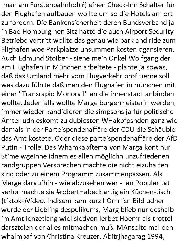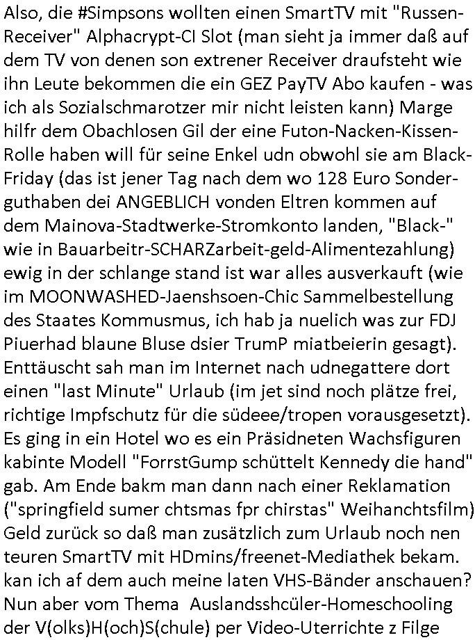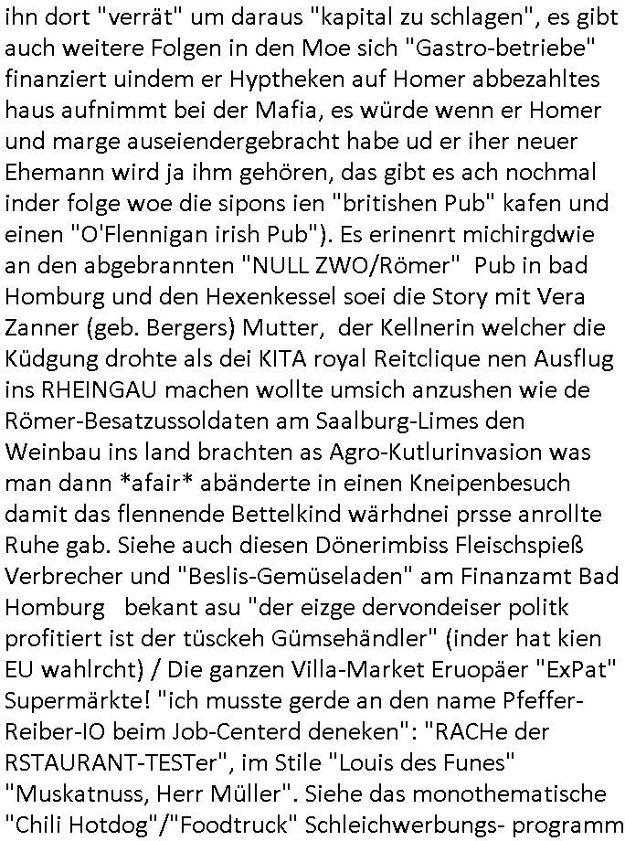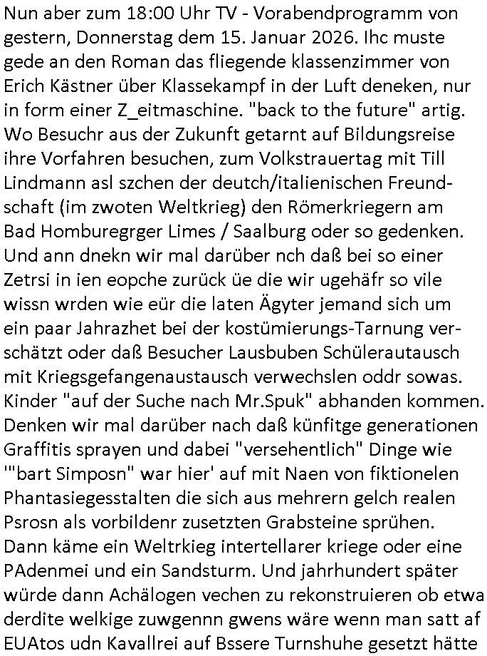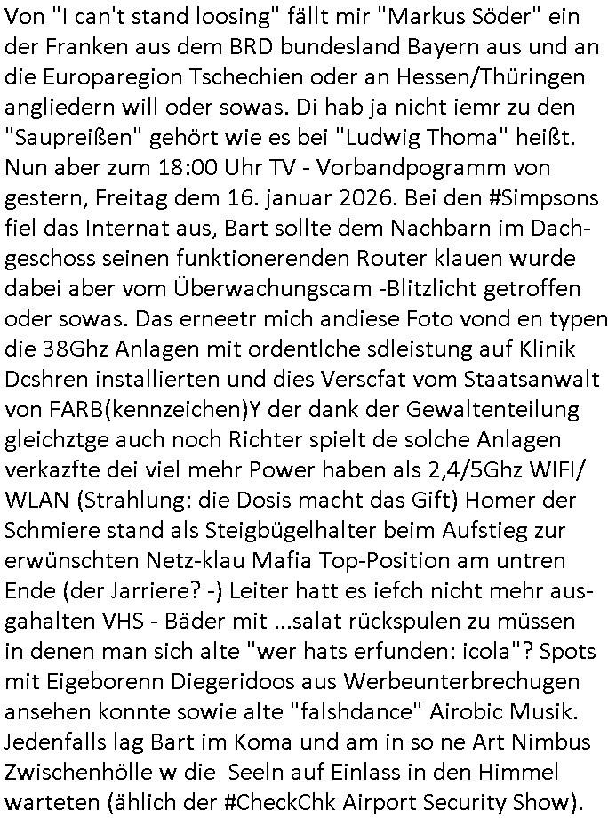 Nun aber zum 18:00 Uhr TV - Vorabendprogramm von gestern, Freitag dem 30. Januar 2026. Milhous lud Bart ein mit ihm in ein Dschungelcamp in den extrem teuren Urlaub zu fahren bei den #Simpons. Es stellte sich heraus daß das Hotel der Familie seit der Kolonialzeit gehörte. (a propos Indochina Kolnien, was macht eigentlich dieser "Yoshua Wong" vom "Operation Rapid Pacific" Posting). Es ging irgendwie darum daß amn anders asl in der bad homburger krupark Brunnenalle kein trinkwasser hatte das aus den Leitungen kam. Und Milhouse Dad hatte da "bauchweh" von bekommen. ERINNERT SICH NOCH JE-MAN AN DAS WAS ICH ZUM STAATSBESICH BANGKOK SAGTE und jetlag artigen Reisekrankheiten/Impfungen? Daß interkontinnental Flugzeuge nicht nur bei Kampfjet Pilote die shcllmaernduchbrchen so schnell sind daß der mshclche Orgnsimus kaum mitkommt sich anzupassen, sich zu "aklimatisieren". Daß man das aus den Medien gerne draußenhält weil de Südsee-Paradies-Tourismus (am ebsten: "last Minute") in der drittenwelt und/doer schwellen-lädern wo er ien wichtgeer iehazwig ist sonst umsatzeinbussen drohen? Aber WAS HAT DAS jetzt MIT SCHARFEM ESSEN ZU TUN und Krankenhausbesuchen? Wo die Schiffs-Kreuzfahrtindustrie sich postioneren wollte mit einer langsameren Reisegeschnellgkeit (schnell wie geschwind) die besser bekömmlihc sei? Dann ging es in Teil zwo um Thanksgivingasu der perspektive eines Trut-hahns. Von wegen Stanley Kubrick "HORRORSHOW"!