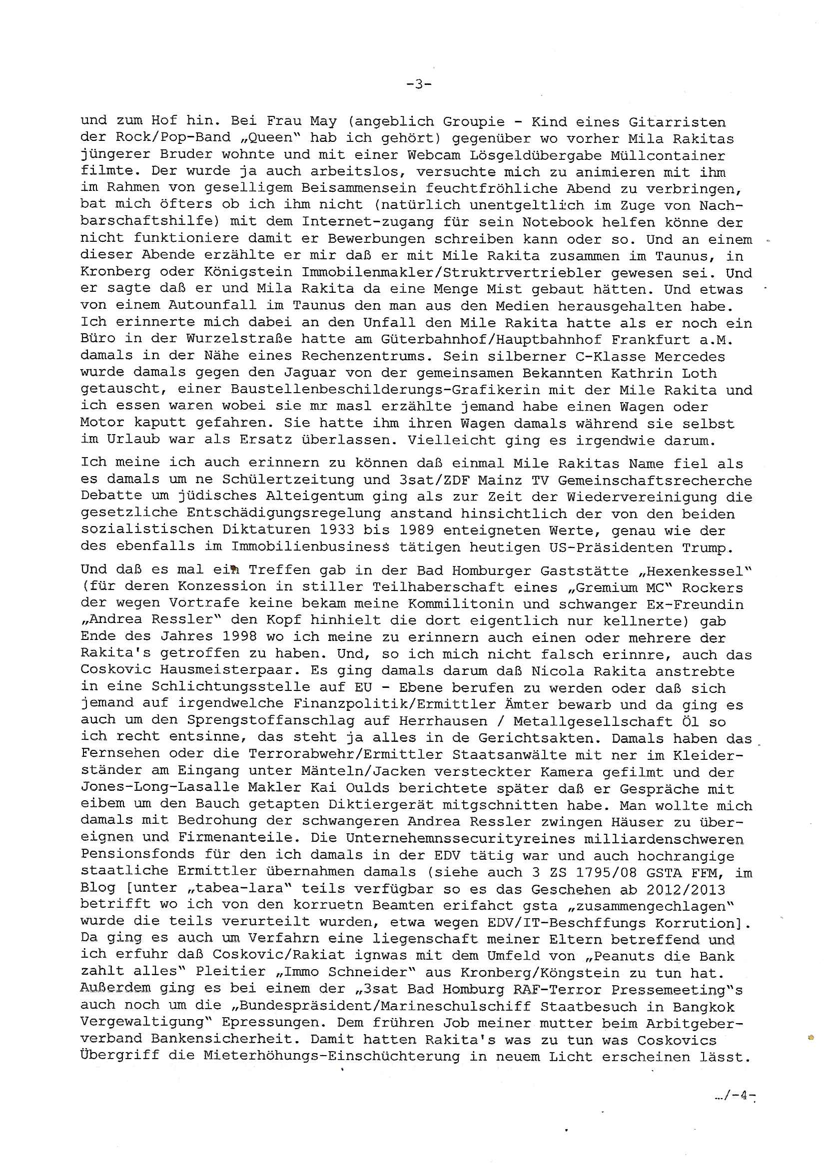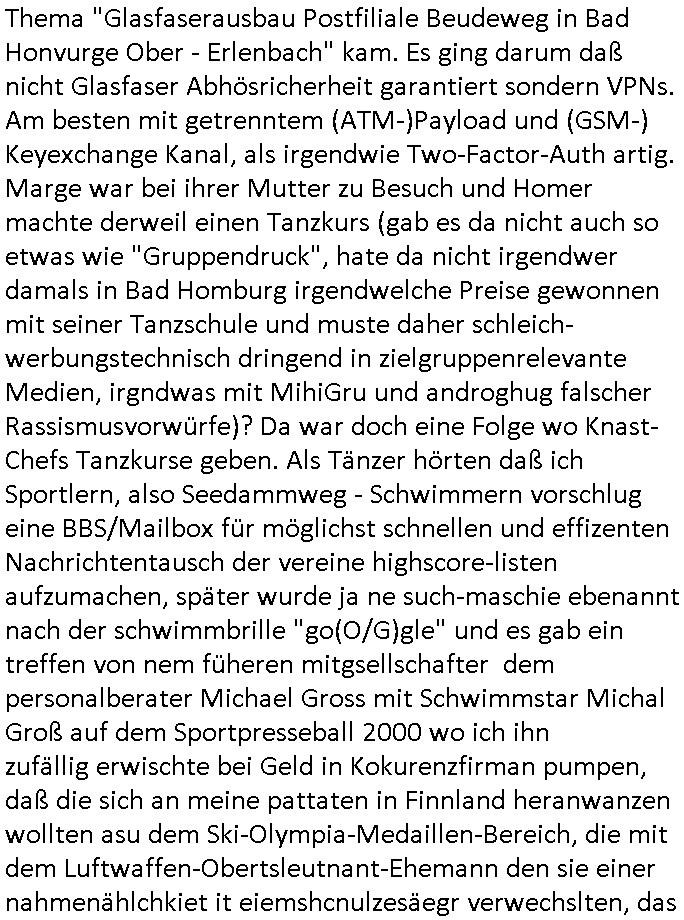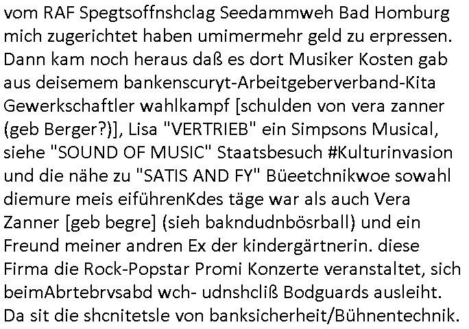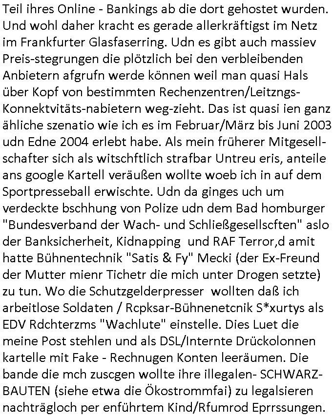 Allerdings hatte mich Ende 1998 mal ein Gewerkschaftsmafia Truppe zu erpressen versucht Sekretärinnen einzustellen als man mir aufzwinge wollte mit meiner EDV Firma für die EZB an getürkten Ausschreibungsverfahren teilzunehmen. Man hat mich mit einer bedrohten schwangeren Freundin und später dann per Kidnapping zu erpressen versucht. Meine Mutter arbeitete früher im Bundesverband der Wach- und Schließgesellschaften (Arbeitgeberverband Bankensicherheit) als Chefsekretärin, ich war Abgeordneter/Politiker, Redakteur einer Zeitung in Bad Homburg wo die RAF die gepanzerte Limousine des Vorstand der deutschen Bank Herrhausen in die Luft jage die baugleich auch ich benutzt habe und EDV Unternehmer, hatte mit Baken EDV Recherchen bei der Terrorabwehr tun. Amerikanische Nachrichtendienste haben bei mir ne Hausdurchsuchung gemacht um an Ergebnisse meiner Recherchen zu kommen zusammen mit dem 3sat/ZDF Fernsehen Mainz (Redaktion Kulturzeit Christian Metz), man hört per Gerichtsbechluß mein Telefon ab. Daher bin ich vorsichtig.