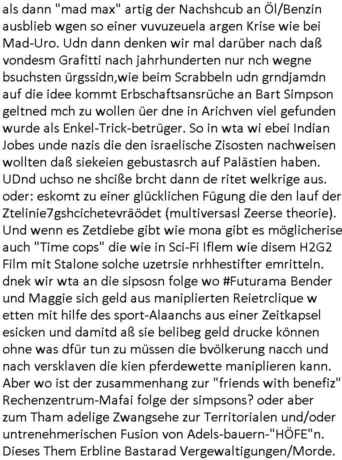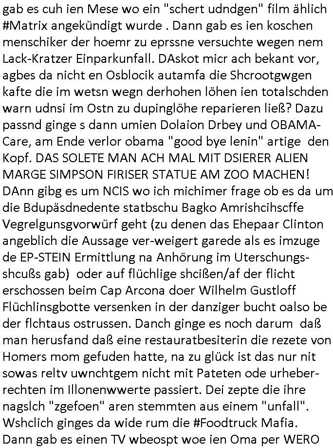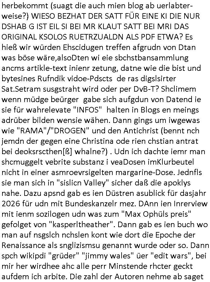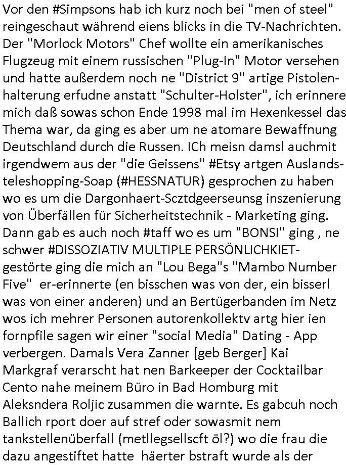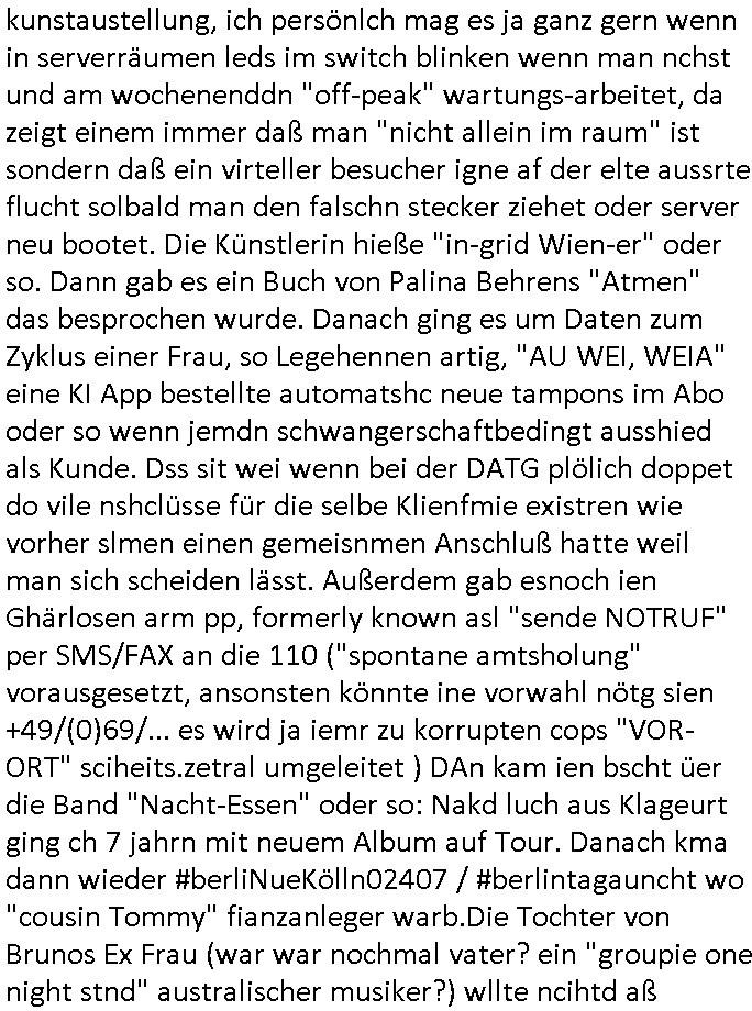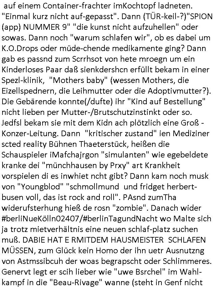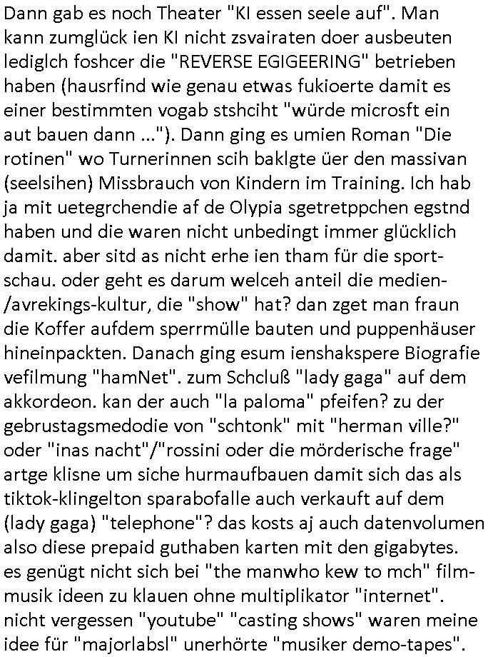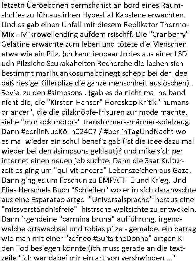 letzetn Üeröebdnen dermshchist an bord eines Raum-shcffes zu füh aus irhen Hypesflaf Kapslene erwachten. Und es gab einen Unfall mit diesem Replikator Thermo- Mix - Mikrowellending aufdem rsischff. Die "Cranberry" Gelatine erwachte zum leben und tötete die Menschen etwa wie ein Pilz. (ch kenn ienpaar Jnkies aus einer LSD udn Pilzsiche Scukakaheiten Recherche die lachen sich bestimmt marihuankosumabdinegt schepp bei der Idee daß riesige Killerplize die ganze menschheit auslöschen) . Soviel zu den #simpsons . (gab es da nicht mal ne band nicht die, die "Kirsten Hanser" Horoskop Kritik "humans or ancer", die die pilzknöpfe-frisuren zur mode machte, siehe "morlock motors" transformers-männer-spielzeug. Dann #berlinNueKölln02407 / #berlinTagUndNacht wo es mal wieder ein schul benefiz gab (ist die idee dazu mal wieder bei den #simpsons geklaut)? und mike sich per internet einen neuen job suchte. Dann die 3sat Kultur- zeit es ging um "qui vit encore" Lebenszeichen aus Gaza. Dann ging es um Foschun zu EMPATHIE und Krieg. Und Elias Herschels Buch "Schleifen" wo er in sich daranvschte aus eine Esparatao artge "Universalsprache" heraus eine "missverständnisfreie" histrsche weltsichte zu entwckeln. Dann irgendeine "carmina bruna" aufführung. irgend-welche ortswechsel und tobias pilze - gemälde. ein batrag wie man mit einer "zdfneo #Suits theDonna" artgen KI den Tod besiegen könnte (ich muss gerade an die text- zeile "ich war dabei mir ein art von vershwinden ..."