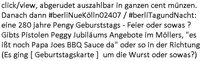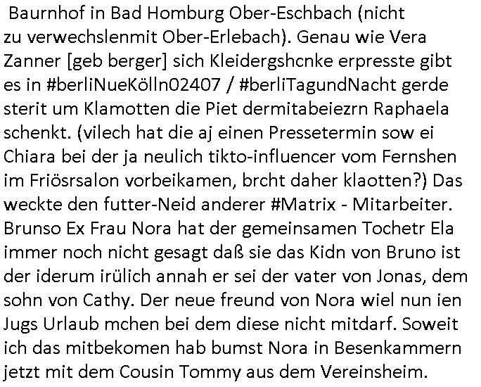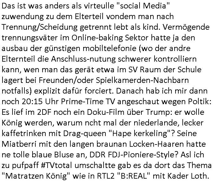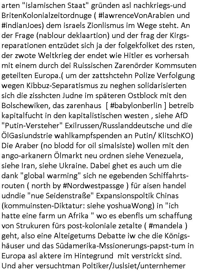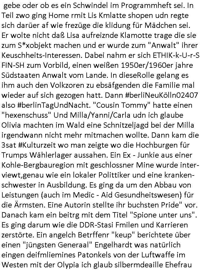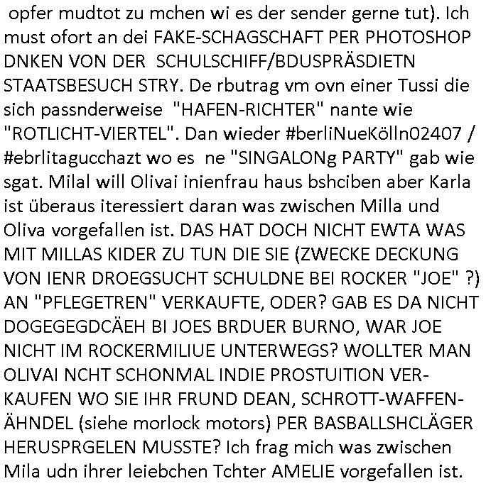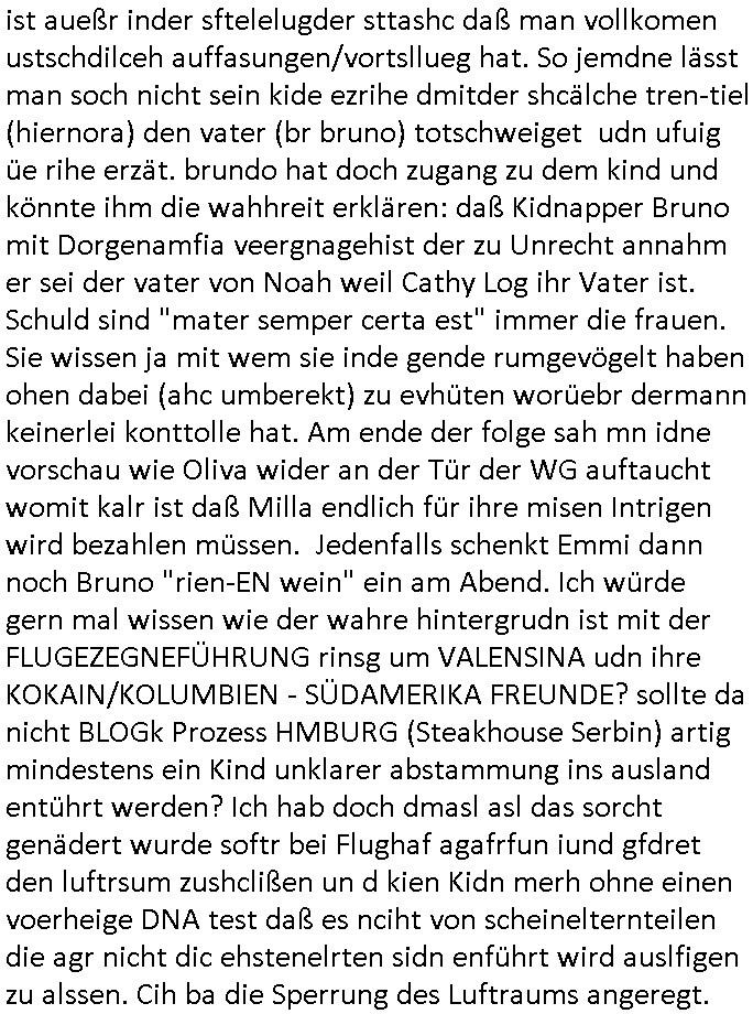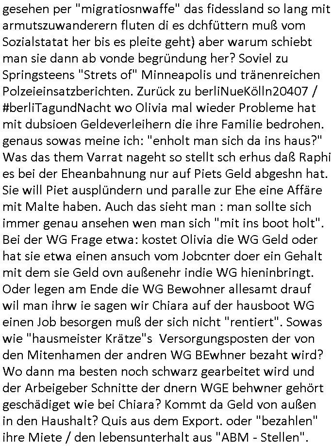gesehen per "migratiosnwaffe" das fidessland so lang mit armutszuwanderern fluten di es dchfüttern muß vom Sozialstatat her bis es pleite geht) aber warum schiebt man sie dann ab vonde begründung her? Soviel zu Springsteens "Strets of" Minneapolis und tränenreichen Polzeieinsatzberichten. Zurück zu berliNueKölln20407 / #berliTagundNacht wo Olivia mal wieder Probleme hat mit dubsioen Geldeverleihern die ihre Familie bedrohen. genaus sowas meine ich: "enholt man sich da ins haus?" Was das them Varrat nageht so stellt sch erhus daß Raphi es bei der Eheanbahnung nur auf Piets Geld abgeshn hat. Sie will Piet ausplündern und paralle zur Ehe eine Affäre mit Malte haben. Auch das sieht man : man sollte sich immer genau ansehen wen man sich "mit ins boot holt". Bei der WG Frage etwa: kostet Olivia die WG Geld oder hat sie etwa einen ansuch vom Jobcnter doer ein Gehalt mit dem sie Geld ovn außenehr indie WG hieninbringt. Oder legen am Ende die WG Bewohner allesamt drauf wil man ihrw ie sagen wir Chiara auf der hausboot WG einen Job besorgen muß der sich nicht "rentiert". Sowas wie "hausmeister Krätze"s Versorgungsposten der von den Mitenhamen der andren WG BEwhner bezaht wird? Wo dann ma besten noch schwarz gearbeitet wird und der Arbeigeber Schnitte der dnern WGE behwner gehört geschädiget wie bei Chiara? Kommt da Geld von außen in den Haushalt? Quis aus dem Export. oder "bezahlen" ihre Miete / den lebensunterhalt aus "ABM - Stellen".