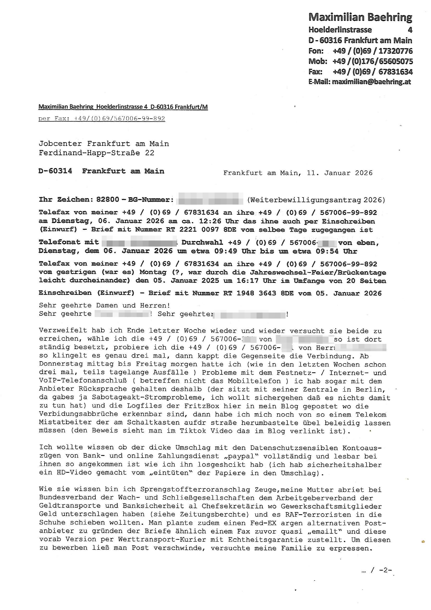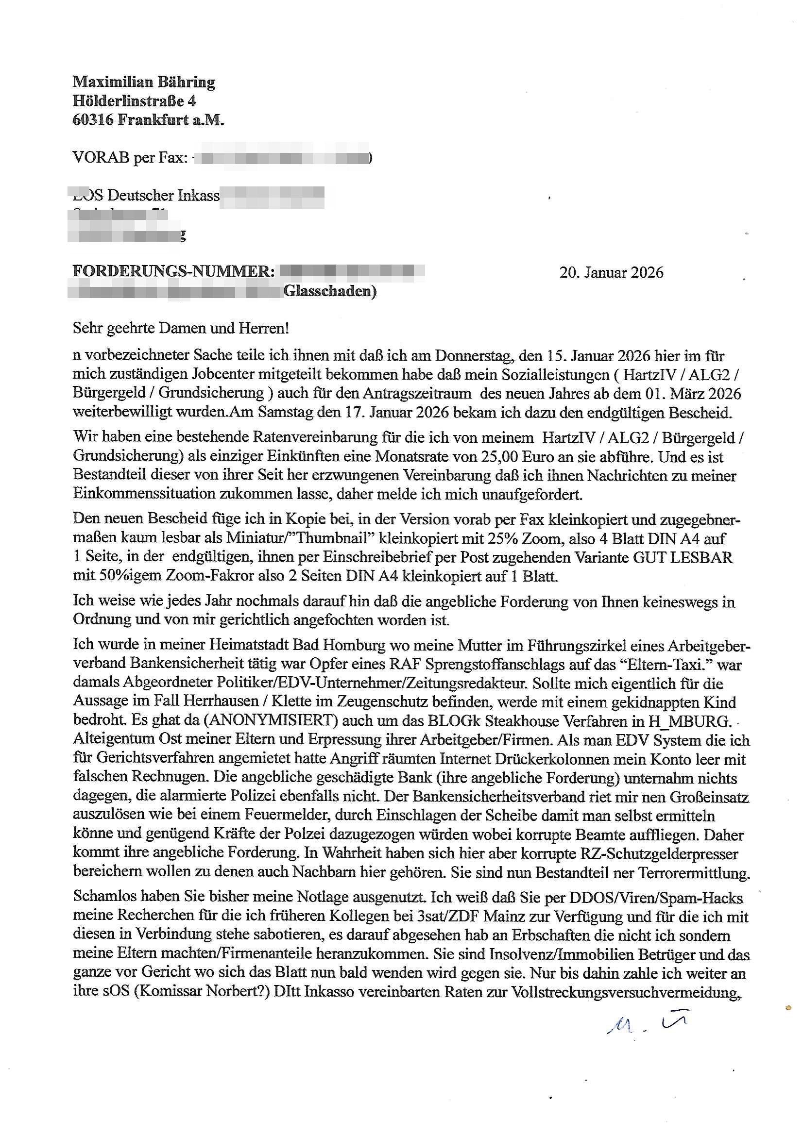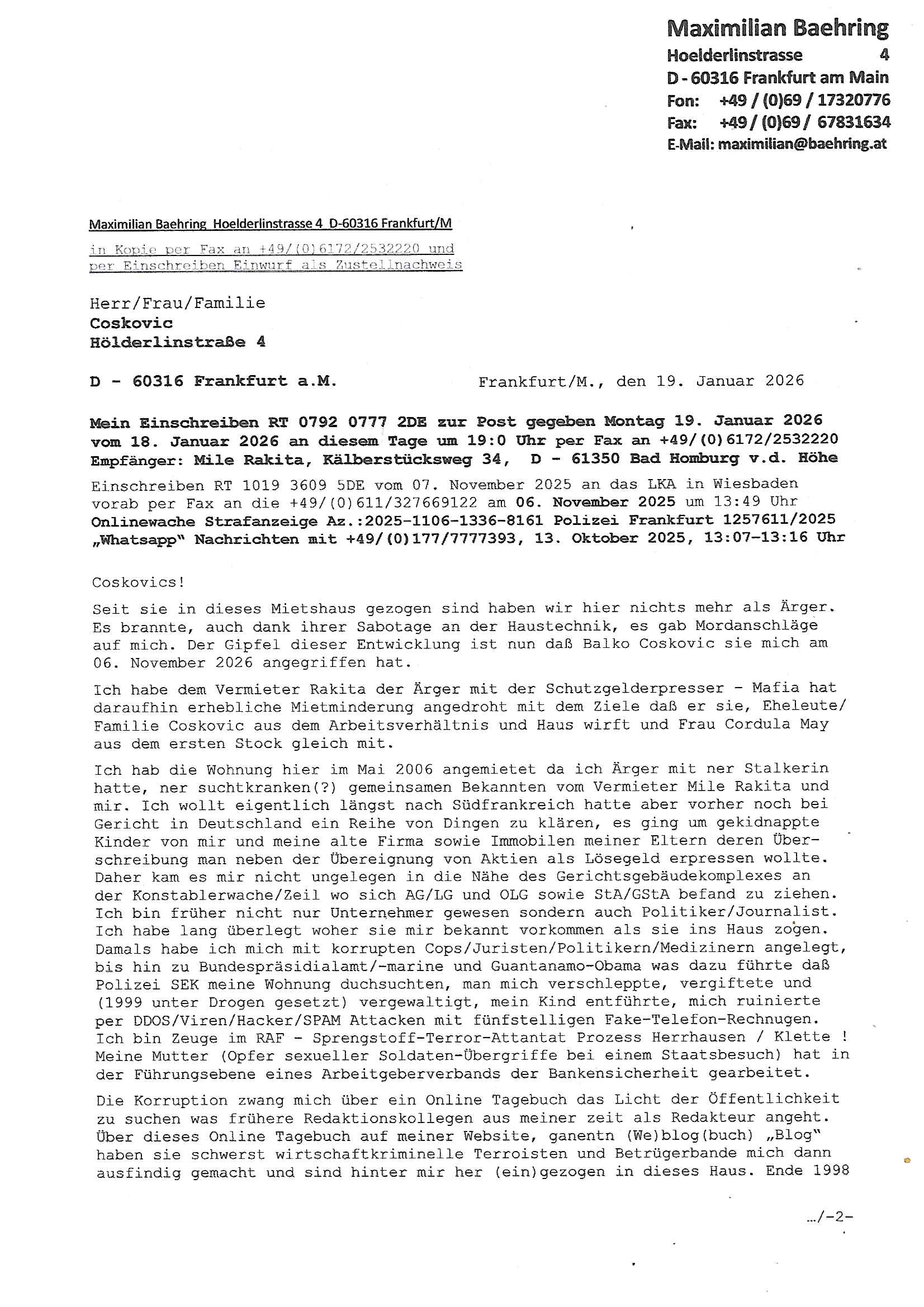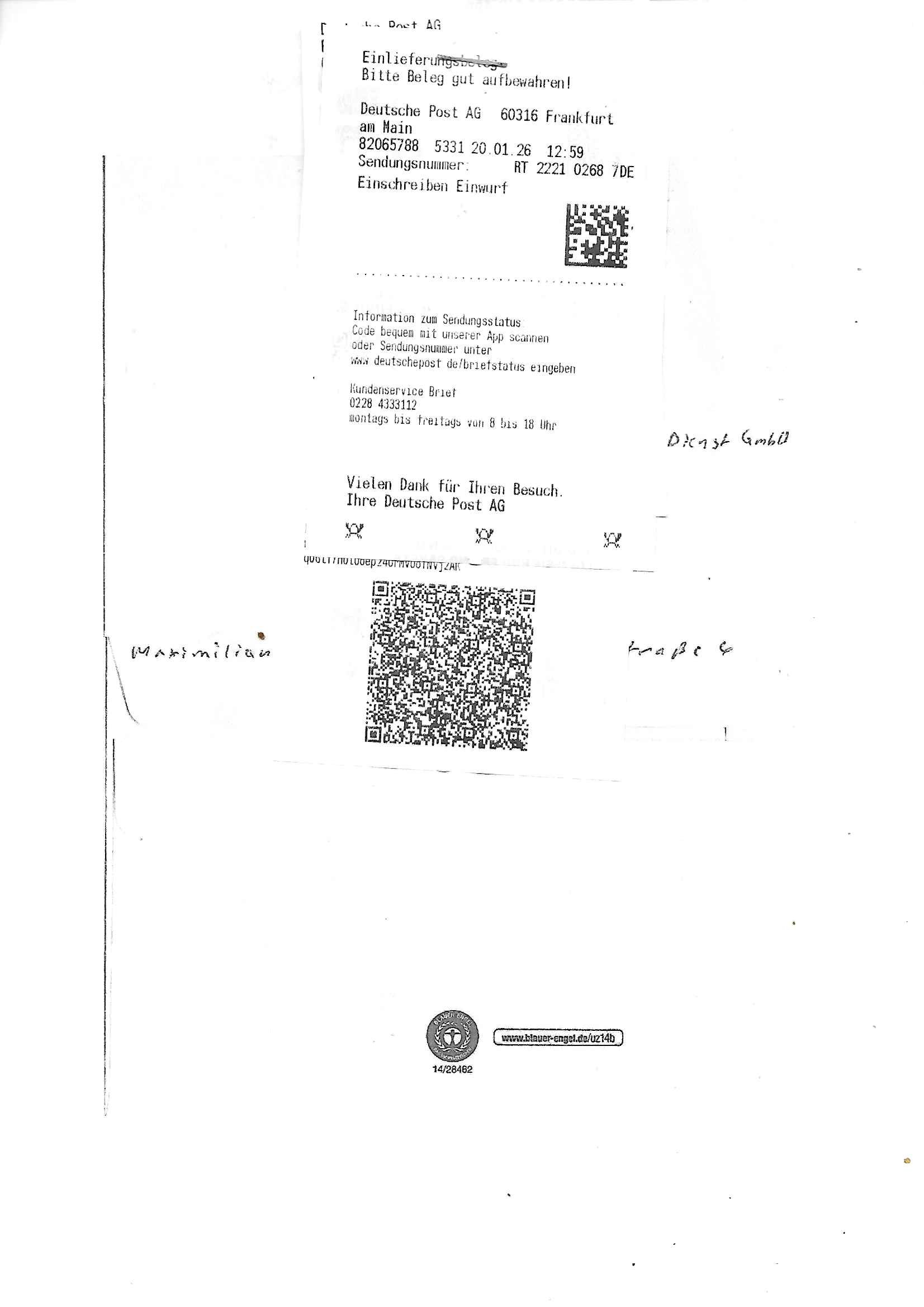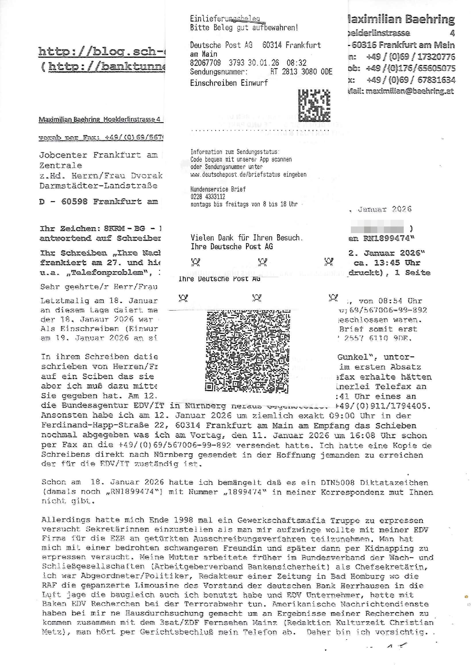 Letztmalig am 18. Januar 2026 hatte ich mit ihrem Hause Kontakt, von 08:54 Uhr an diesem tage daiert mein Telefax an ihre Frau Behrami +49/(0)69/567006-99-892 der 18. Janaur 2026 war ein Sonntag an dem die Postfilialen geschlossen waren. Als Einschreiben (Einwurf) ging der vorab per faxe gesendete Brief somit erst am 19. Januar 2026 an sie herus die Nummer der Sendung ist RT 2557 6110 9DE.