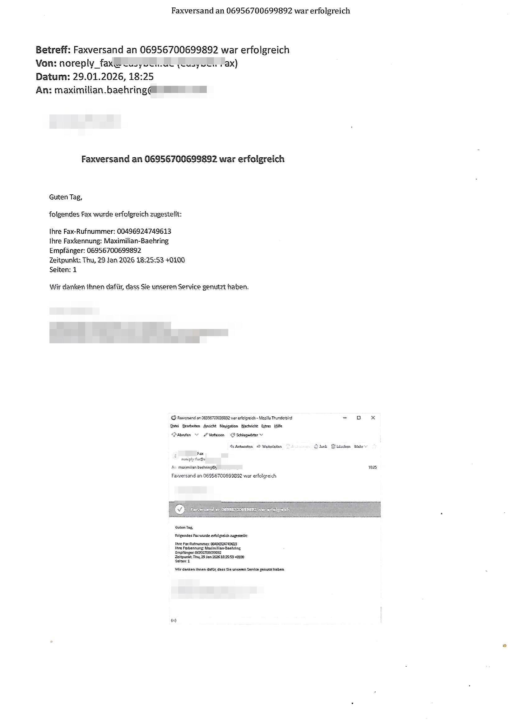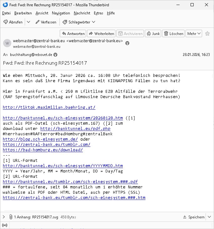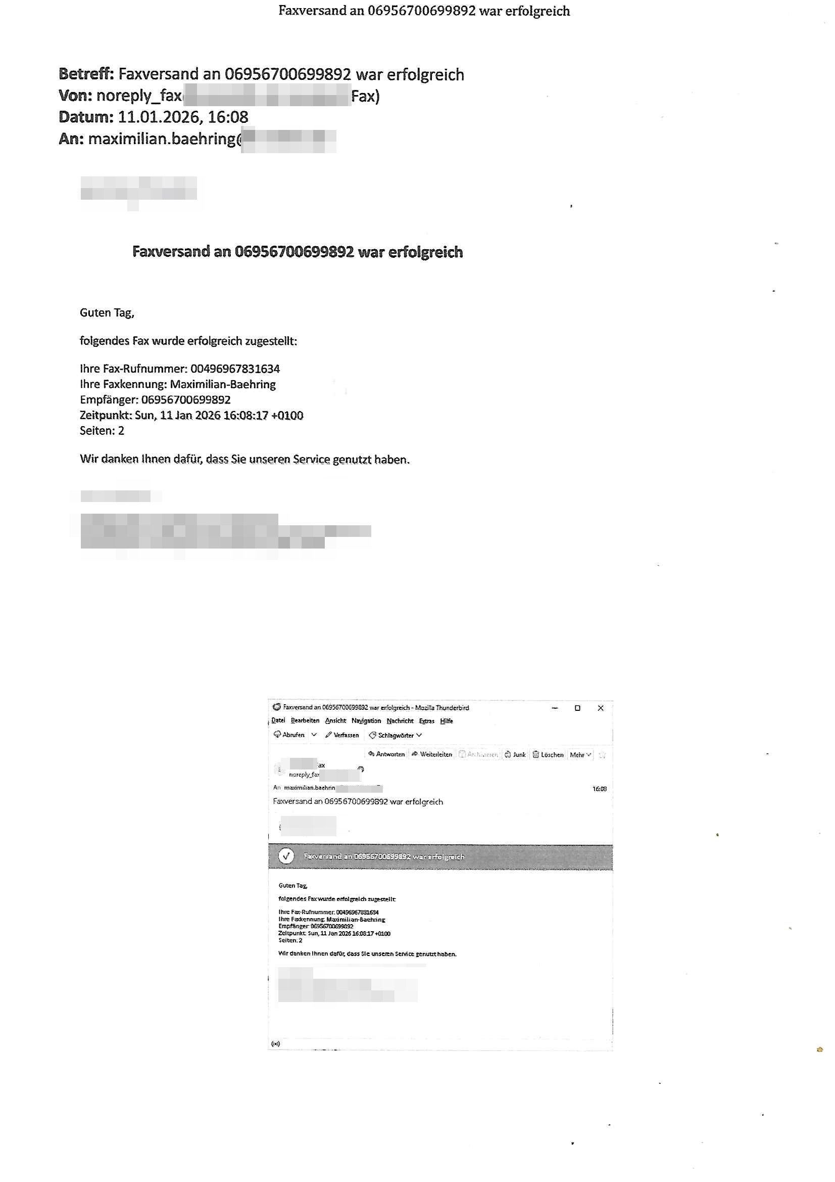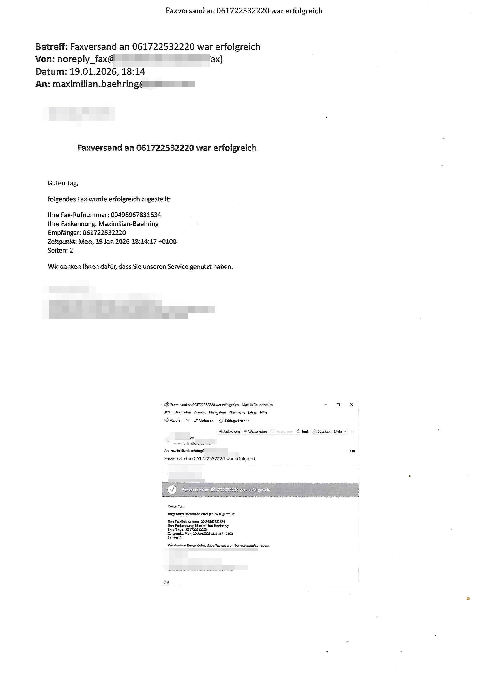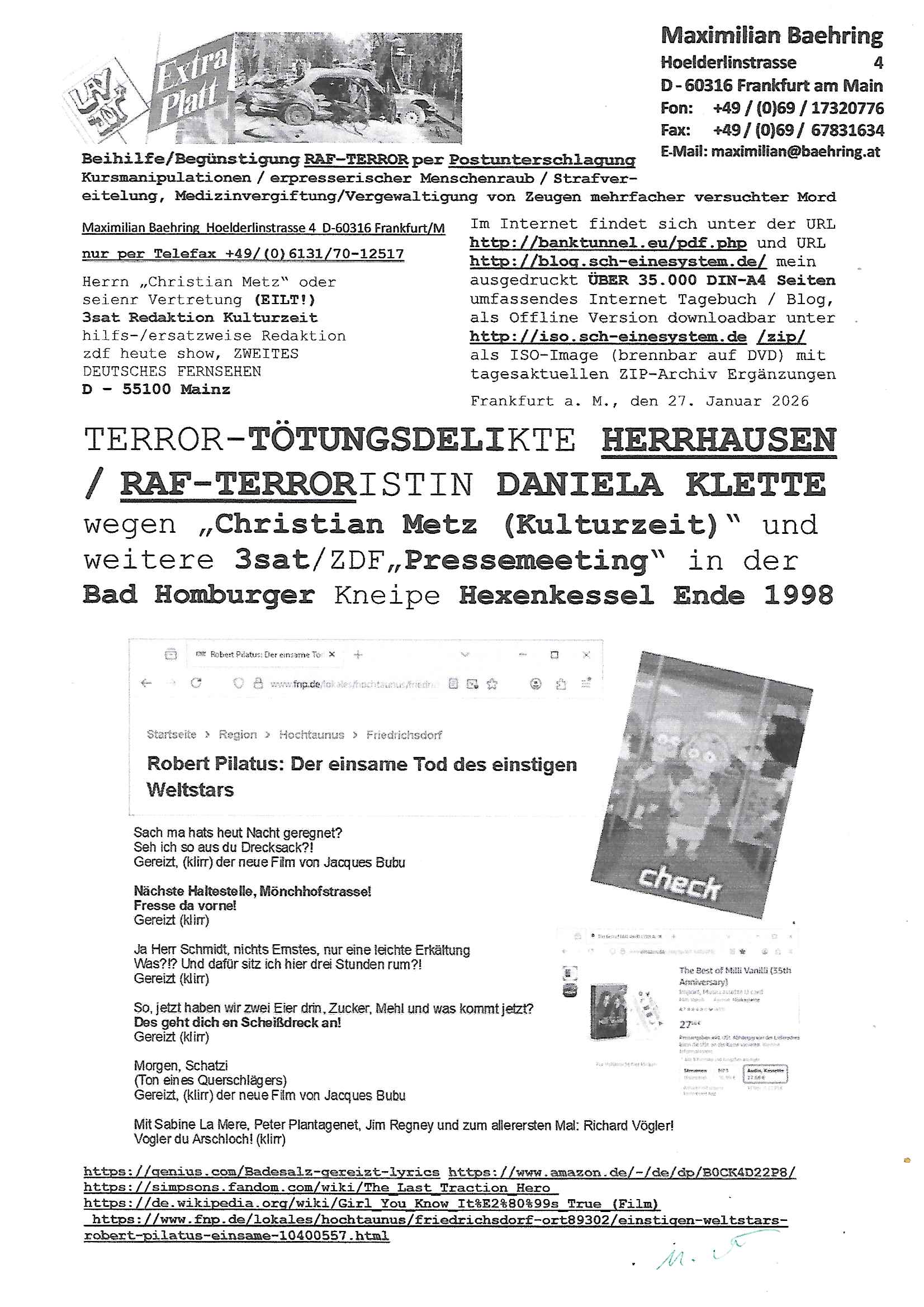Letztmalig am 18. Januar 2026 hatte ich mit ihrem Hause Kontakt, von 08:54 Uhr an diesem tage daiert mein Telefax an ihre Frau Behrami +49/(0)69/567006-99-892 der 18. Janaur 2026 war ein Sonntag an dem die Postfilialen geschlossen waren. Als Einschreiben (Einwurf) ging der vorab per faxe gesendete Brief somit erst am 19. Januar 2026 an sie herus die Nummer der Sendung ist RT 2557 6110 9DE.
