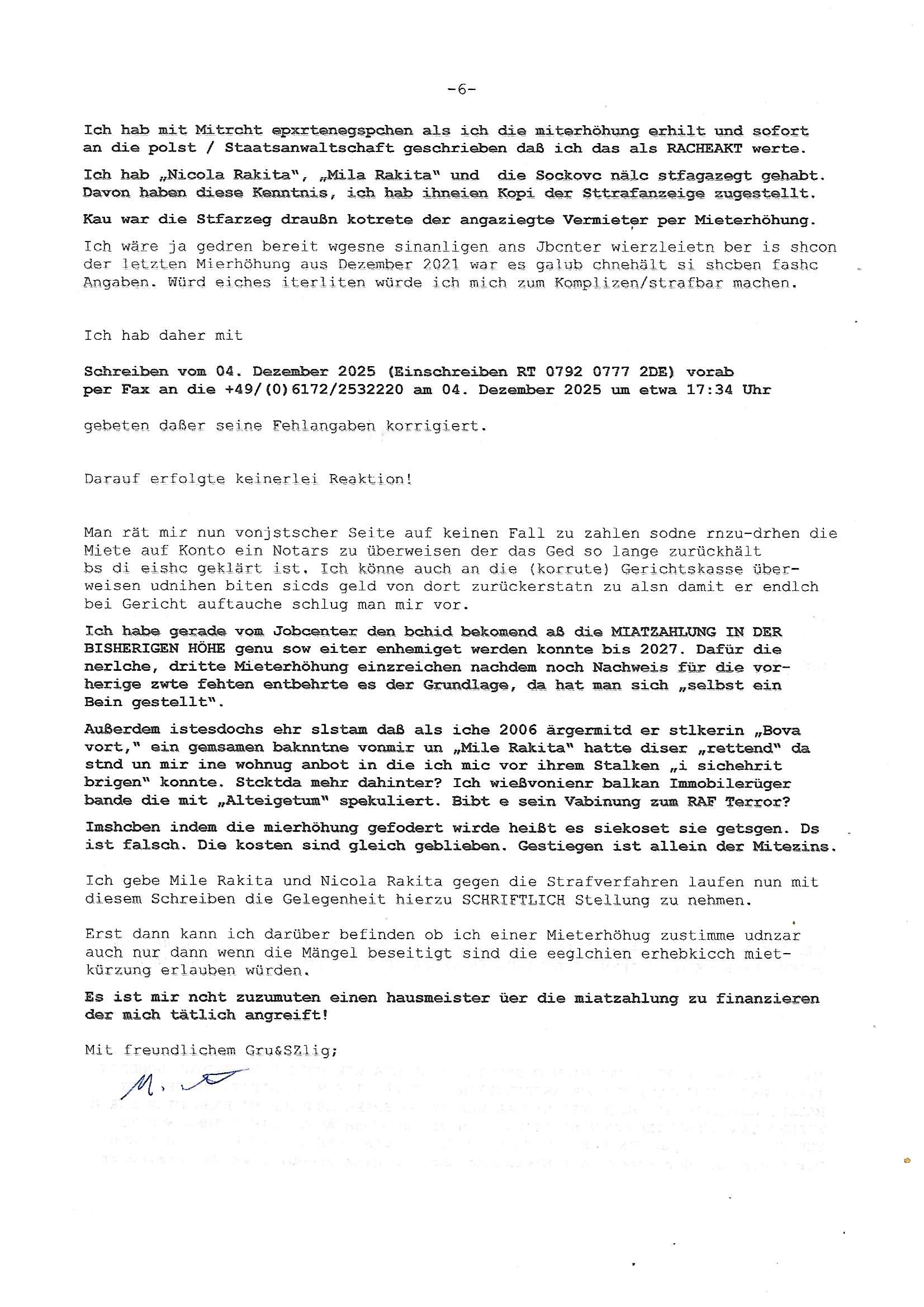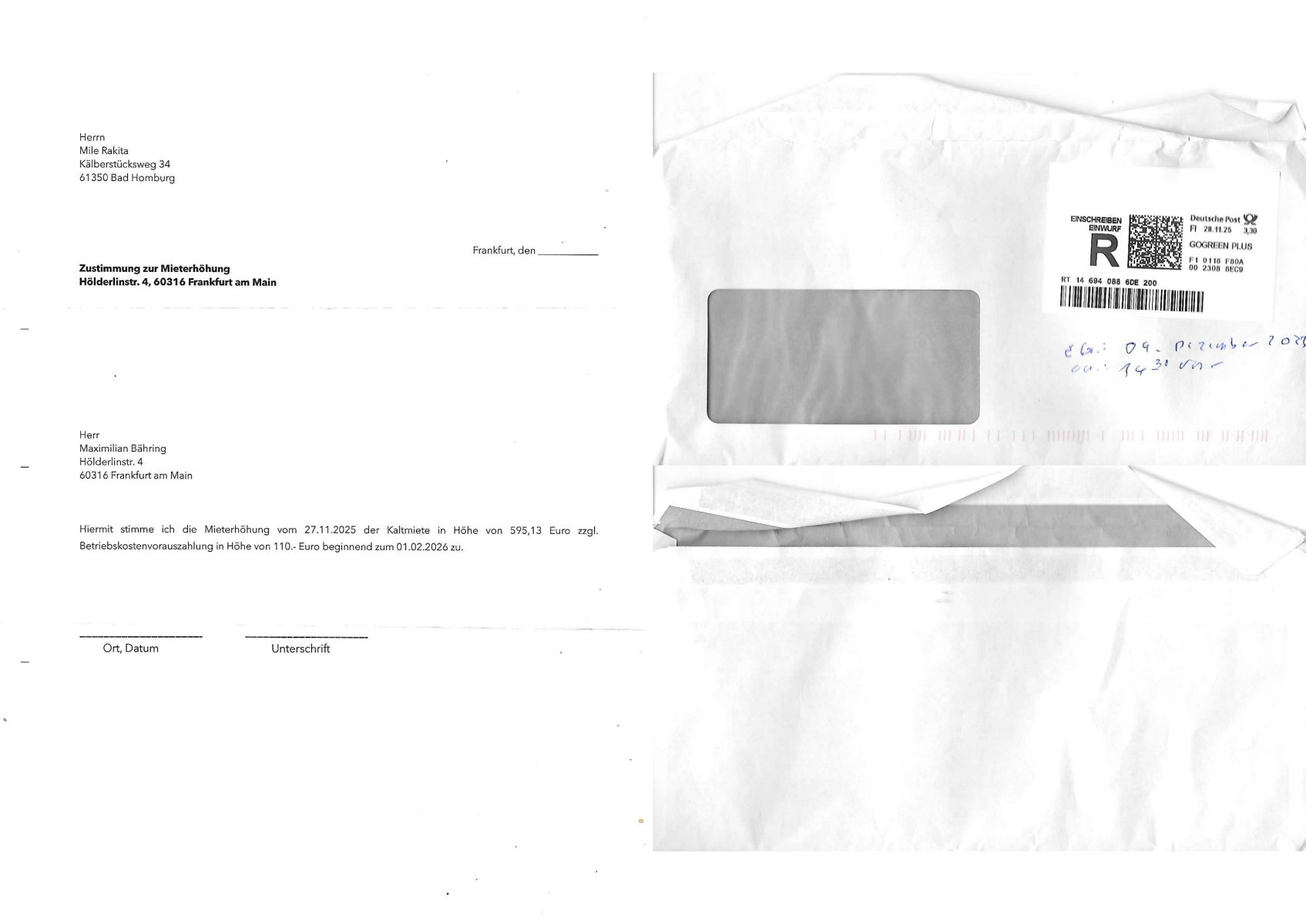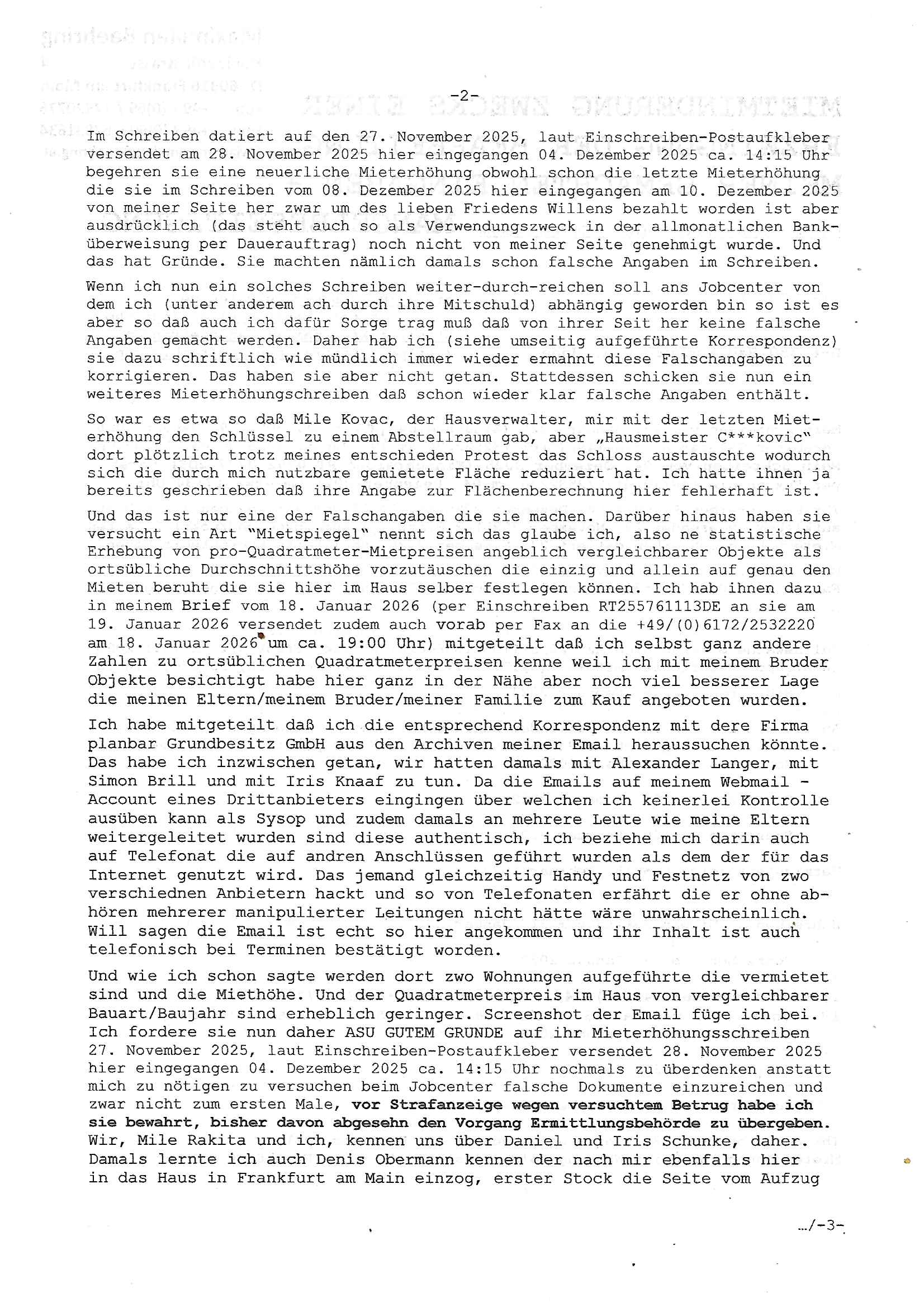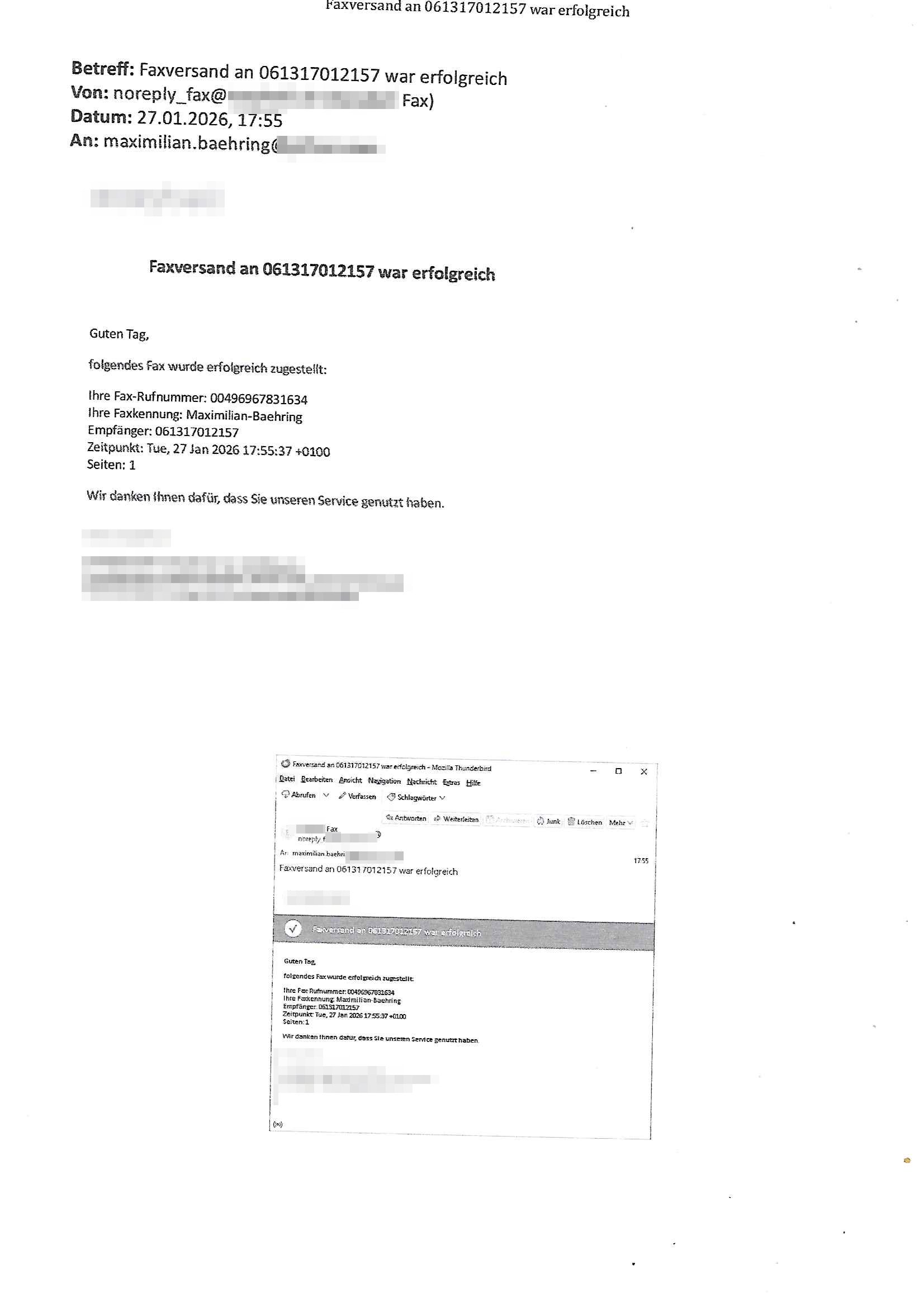 Letztmalig am 18. Januar 2026 hatte ich mit ihrem Hause Kontakt, von 08:54 Uhr an diesem tage daiert mein Telefax an ihre Frau Behrami +49/(0)69/567006-99-892 der 18. Janaur 2026 war ein Sonntag an dem die Postfilialen geschlossen waren. Als Einschreiben (Einwurf) ging der vorab per faxe gesendete Brief somit erst am 19. Januar 2026 an sie herus die Nummer der Sendung ist RT 2557 6110 9DE.