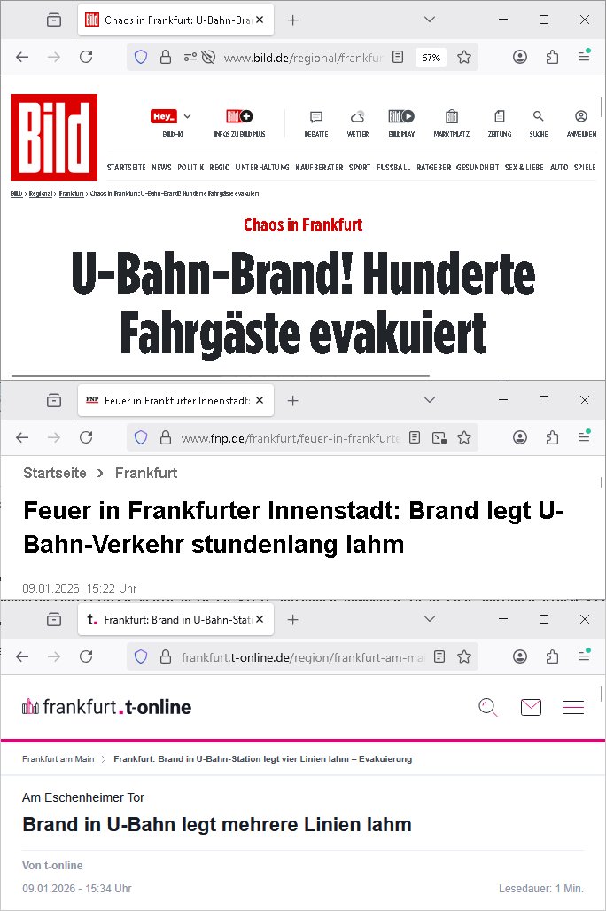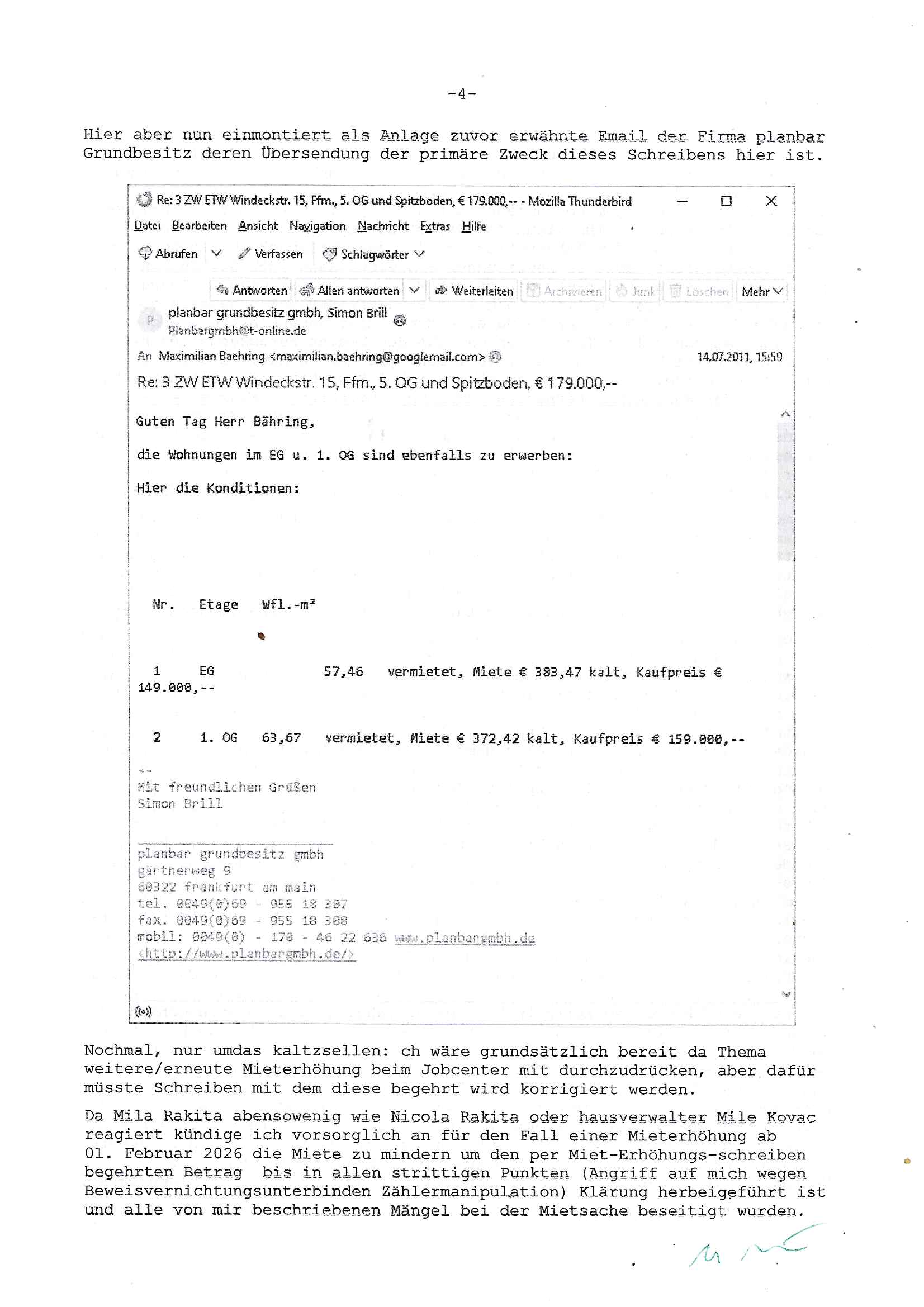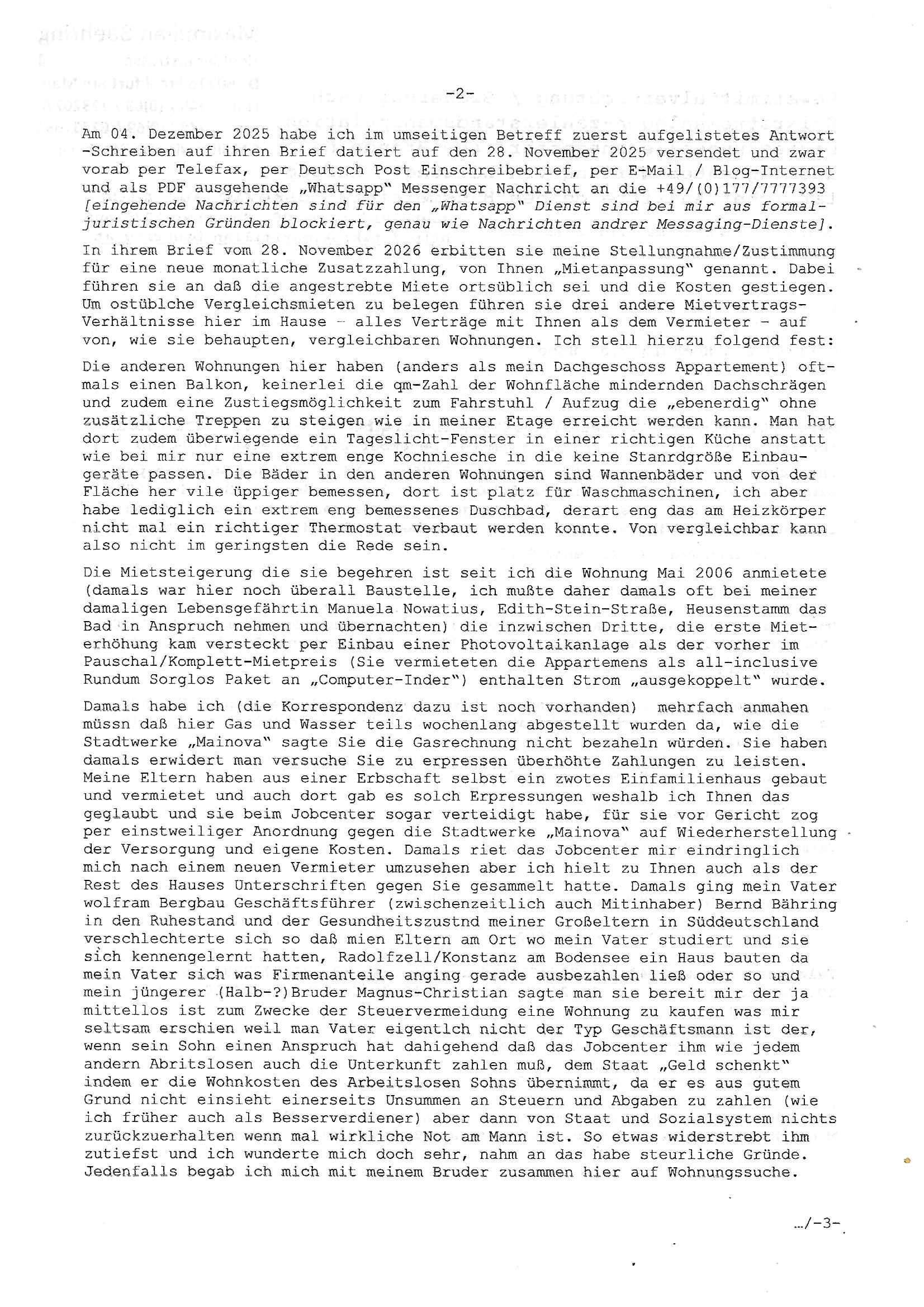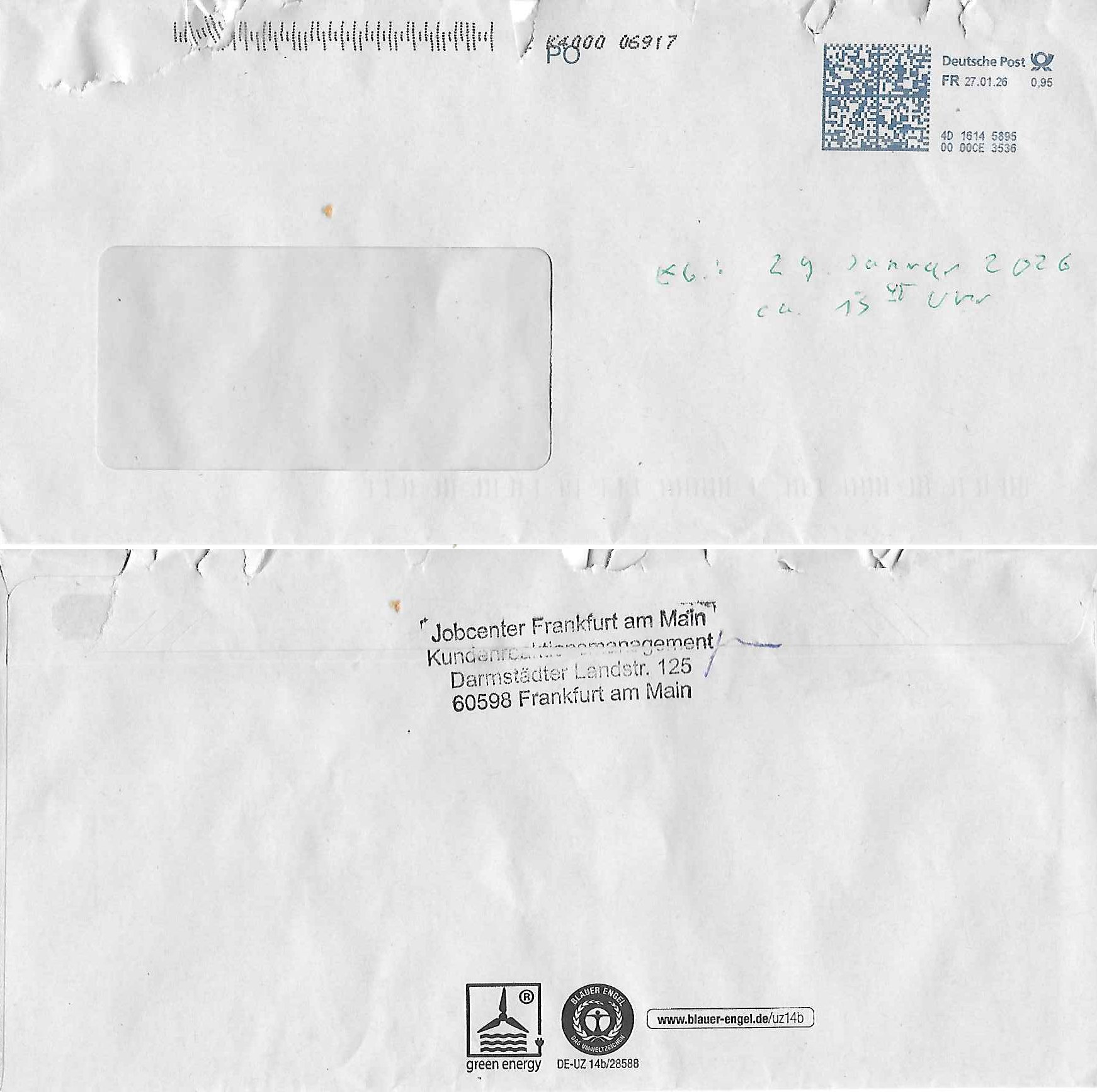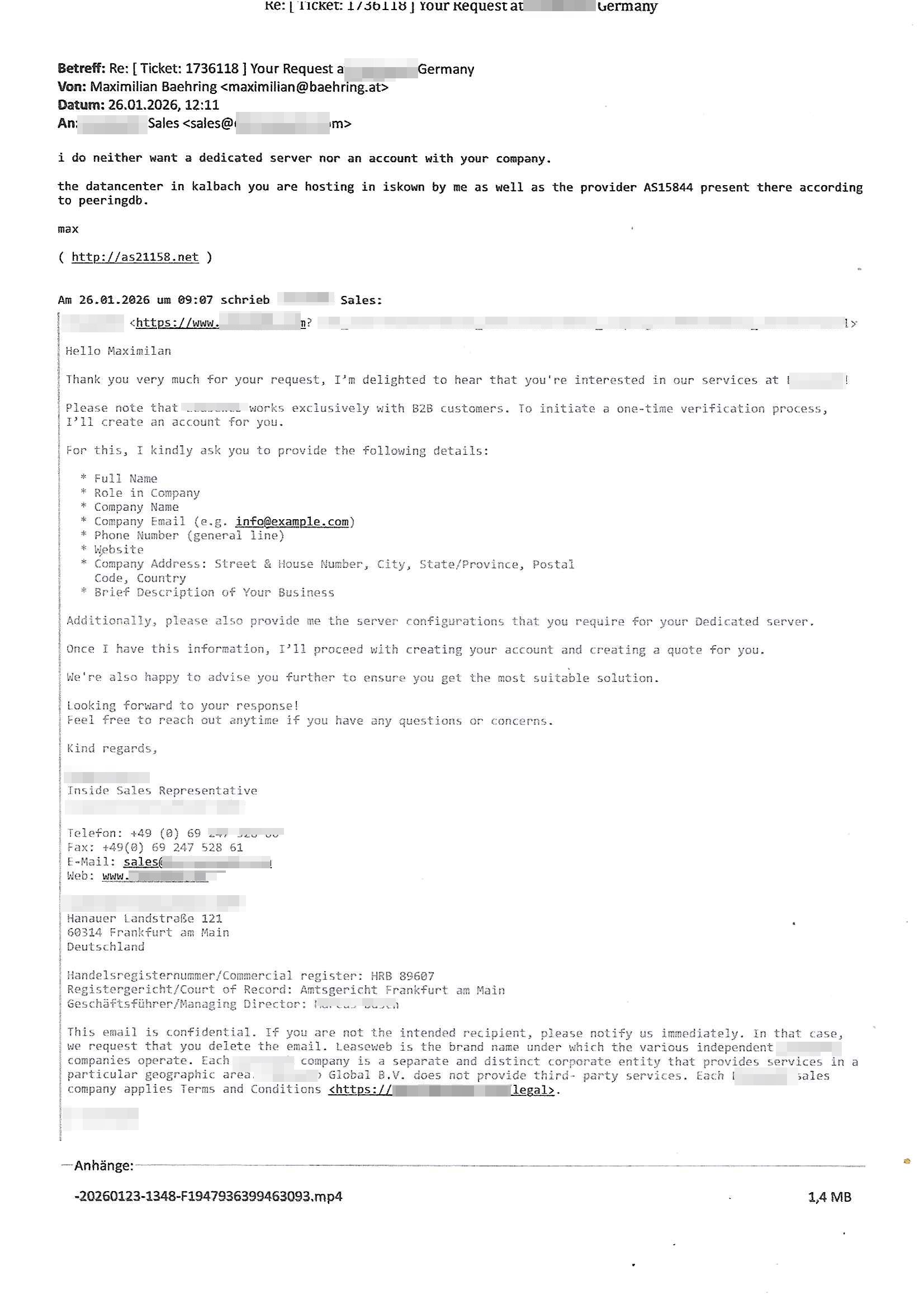 Letztmalig am 18. Januar 2026 hatte ich mit ihrem Hause Kontakt, von 08:54 Uhr an diesem tage daiert mein Telefax an ihre Frau Behrami +49/(0)69/567006-99-892 der 18. Janaur 2026 war ein Sonntag an dem die Postfilialen geschlossen waren. Als Einschreiben (Einwurf) ging der vorab per faxe gesendete Brief somit erst am 19. Januar 2026 an sie herus die Nummer der Sendung ist RT 2557 6110 9DE.