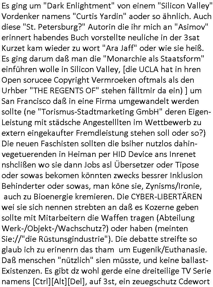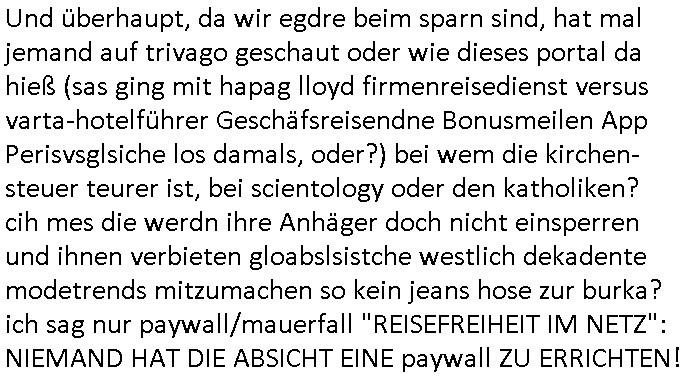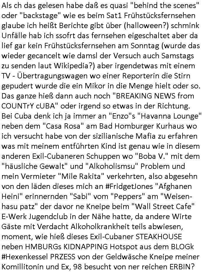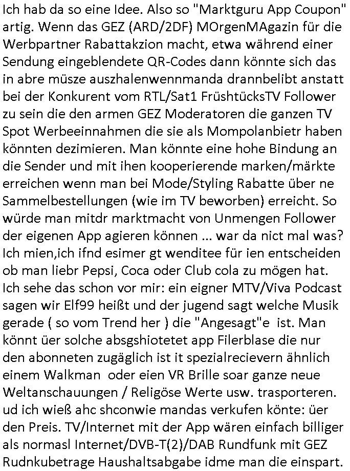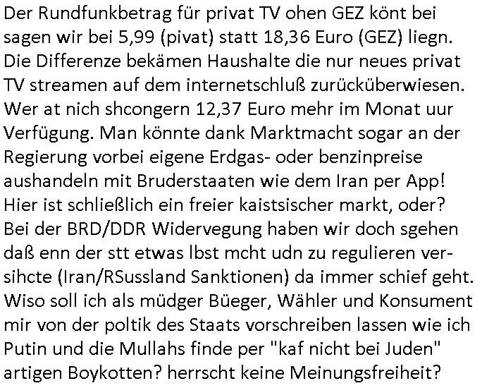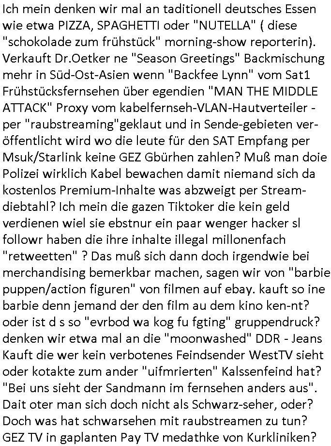 bedingt 320 x 200 noch etwa Breifmarkenformat groß. Udn ikch riet dazu sowas wie youtube casting-shows zur nchschsfpderung aufzumahcn damals in der Redaktion. Die Debatte drehte sich um DRM - Endgeräte / Zensur und um Fan-Intermeforen-Communities. Nur weil wir das Thema "Rchenzentrum Bewchung" streiften. (Wenn man das Sat1 füshtsücskTV beim IP-geoblocking JOYN abfilmt per Webcam vom Schirm und die Moderatorin UNVERSCHLEIERT im IRANischen scoial Media Internet auftaucht per eMule/Dokey Tauschbörsen-Raubstream. Wir erinnern uns: "THE SUN ALWAYS SHINES ON TV" die "you are watching channel FREE" wie in DREI-sat aber auch in "FREE beer" Morning-Show Musiksendung. der ESCHATOLOGISCHE (WELT.tv) "ICH WAR DABEI BERICHT". ( "Sarah Hazel drink and schmink" / "Blumfeld - reflecting skin" respektive "Kelly Clarksons - since you been gone", und auchdie "online hate oma (80)" ketchup - expertin) Jedenfalls ging es dann noch um den "letzten ausweg: Hausnotruf", marge war eingesperrt, amazon ALEKSA hatte sie gekidnappt bei einem "Koch Duell" so ähnlich wie diese "Weihnachtbäckerei" Sendung mit "Marlene Lufen" "das große Knorr kochstudio backen" oder sowas es gab bei Böhmi "SAlaT von der ISS". Und kaum daß Böhmermann Alein Food gegessen hatte das ging es los daß alles gaz seltam wurde auf der Welt/im Fernsehen. Cooro udnsow. Ob es da einen Zusammenhang gibt? Womit wird dann wider bei den siposn waren wo die