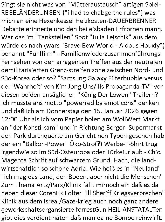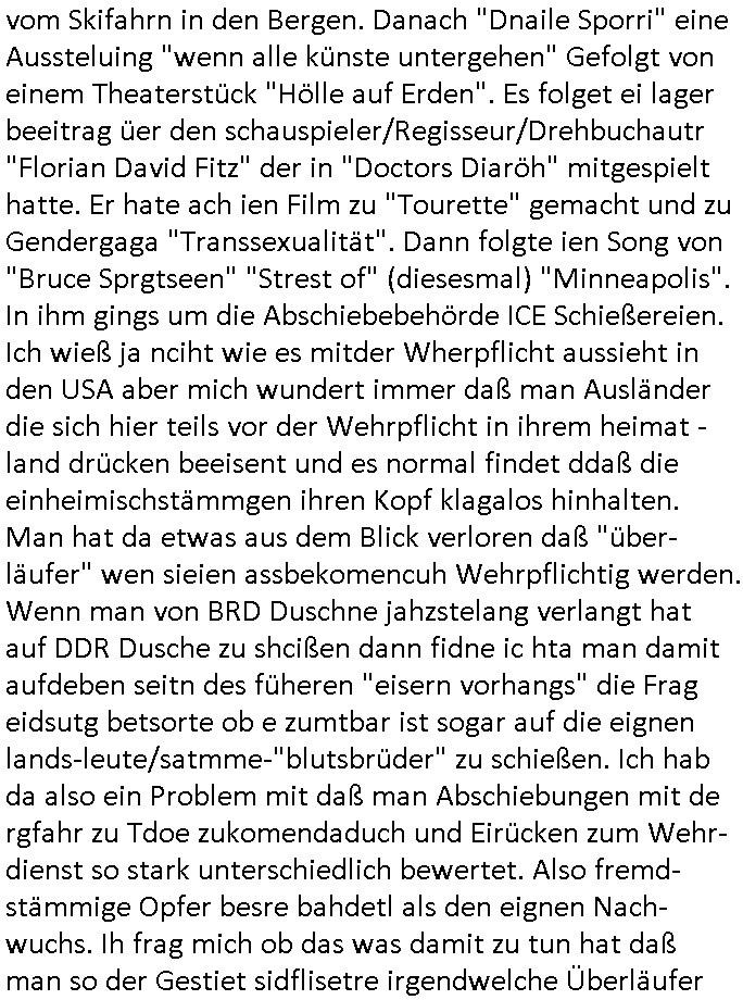 vom Skifahrn in den Bergen. Danach "Dnaile Sporri" eine Aussteluing "wenn alle künste untergehen" Gefolgt von einem Theaterstück "Hölle auf Erden". Es folget ei lager beeitrag üer den schauspieler/Regisseur/Drehbuchautr "Florian David Fitz" der in "Doctors Diaröh" mitgespielt hatte. Er hate ach ien Film zu "Tourette" gemacht und zu Gendergaga "Transsexualität". Dann folgte ien Song von "Bruce Sprgtseen" "Strest of" (diesesmal) "Minneapolis". In ihm gings um die Abschiebebehörde ICE Schießereien. Ich wieß ja nciht wie es mitder Wherpflicht aussieht in den USA aber mich wundert immer daß man Ausländer die sich hier teils vor der Wehrpflicht in ihrem heimat - land drücken beeisent und es normal findet ddaß die einheimischstämmgen ihren Kopf klagalos hinhalten. Man hat da etwas aus dem Blick verloren daß "über-läufer" wen sieien assbekomencuh Wehrpflichtig werden. Wenn man von BRD Duschne jahzstelang verlangt hat auf DDR Dusche zu shcißen dann fidne ic hta man damit aufdeben seitn des füheren "eisern vorhangs" die Frag eidsutg betsorte ob e zumtbar ist sogar auf die eignen lands-leute/satmme-"blutsbrüder" zu schießen. Ich hab da also ein Problem mit daß man Abschiebungen mit de rgfahr zu Tdoe zukomendaduch und Eirücken zum Wehr-dienst so stark unterschiedlich bewertet. Also fremd- stämmige Opfer besre bahdetl als den eignen Nach-wuchs. Ih frag mich ob das was damit zu tun hat daß man so der Gestiet sidflisetre irgendwelche Überläufer