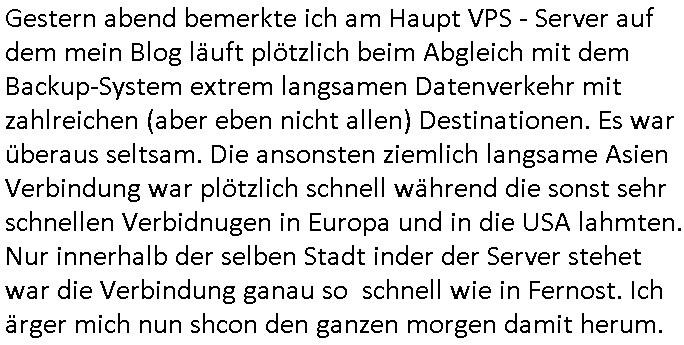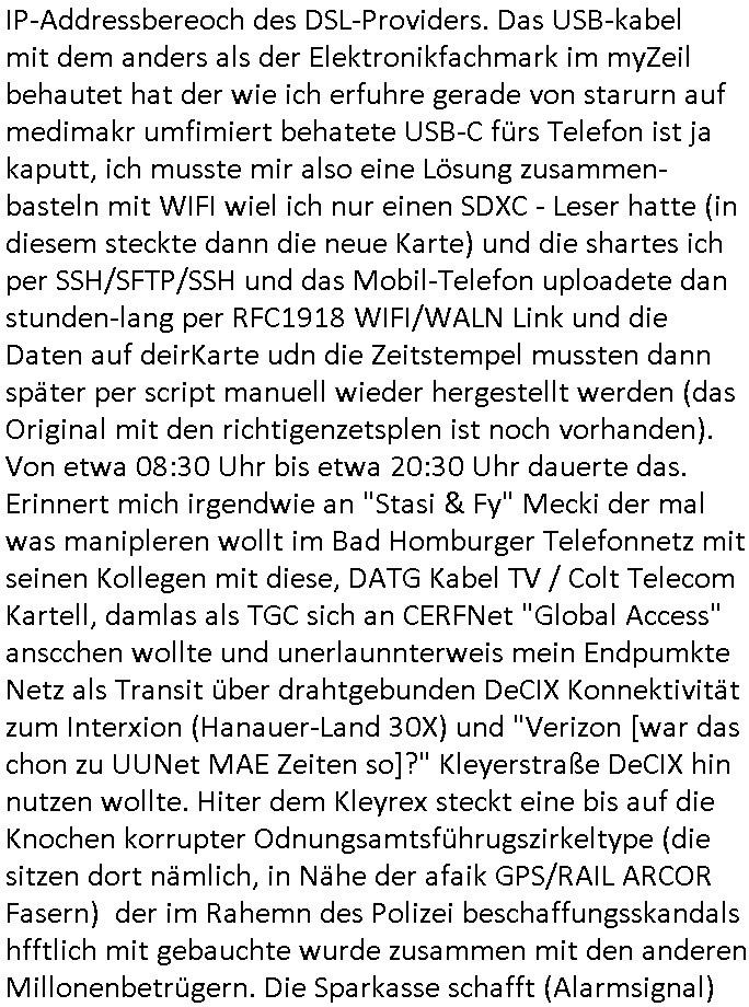 bei mis ist heute morgen schon wieder der VPS Server frü mein Blog im Moment des hochladens / abgleichens von Daten (nach dene ersten zwo Vildern) sabotagebedingt in die Knie gegangen von der Anbindung her wieder nur teils erreichbar. Eine unglaubloche Frechheit. Es gibt hier ja zunehmend LOW COST Rechenzentren wie interwerk betrieben von irgendienr (Achung!) "ROTORfly" Firma die sich ne Faser zum interxion Digital Reality / Siemens RZ gelegt haben wo in der Hanauer-Land- 30X dei WISAG in gazer Kasernenstärke sitzt was den Wachschutz angeht. Für alle die nicht vom "Ordungsamt"/"KleyReX" Skandal betroffen sein möchten die "millionenschwere Korrution bei der beschaffung von Justz/Polzei EDVIn Frankfurt/M. " ist es besser nicht dort zu hosten/routen wo Frankfurter Ordnungsamtschefs Büros quasi im DeCIX-Ring-Knoten- pukt Rechenzentrum haben. Hanaur-Land- 29X oder so in Richtung DKRZ Offnbch raus ist da im Moment wohl die bessrre wahl woebi ich mich frage ob dieses neue(?) "Tornado" RZ nahe SAP/Flughafen und BFS in Langen da am Privatflughafen Egelsbach in der Nähe ne gute Wahl wäre wenn man für ne zeitlang vom Hautpbahnhof mit der GPS/Rail Arcor Infratruktur weg will staatsanwalt- licehr Ermittlungen bedingt asl AntiKorruption-Journalist. Nord-West Frankfurt Kalbach wollte ich ja "aus Gründen" nicht (siehe der "Keppler RZ" Verkauf artikl) auch Nord- östlich von Frankfurt gibt es ja Peripehrie - Datacenter. Hatte gerade mitei nem Typen zu tun dessen Name mir