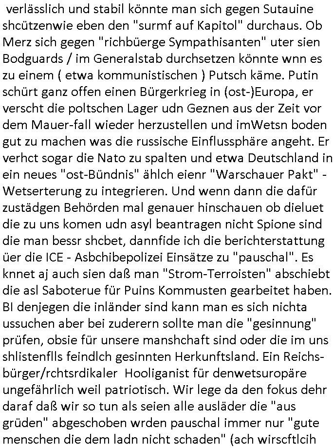 verlässlich und stabil könnte man sich gegen Sutauine shcützenwie eben den "surmf auf Kapitol" durchaus. Ob Merz sich gegen "richbüerge Sympathisanten" uter sien Bodguards / im Generalstab durchsetzen könnte wnn es zu einem ( etwa kommunistischen ) Putsch käme. Putin schürt ganz offen einen Bürgerkrieg in (ost-)Europa, er verscht die poltschen Lager udn Geznen aus der Zeit vor dem Mauer-fall wieder herzustellen und imWetsn boden gut zu machen was die russische Einflussphäre angeht. Er verhct sogar die Nato zu spalten und etwa Deutschland in ein neues "ost-Bündnis" ählch eienr "Warschauer Pakt" - Wetserterung zu integrieren. Und wenn dann die dafür zustädgen Behörden mal genauer hinschauen ob dieluet die zu uns komen udn asyl beantragen nicht Spione sind die man bessr shcbet, dannfide ich die berichterstattung üer die ICE - Asbchibepolizei Einsätze zu "pauschal". Es knnet aj auch sien daß man "Strom-Terroisten" abschiebt die asl Saboterue für Puins Kommusten gearbeitet haben. BI denjegen die inländer sind kann man es sich nichta ussuchen aber bei zuderern sollte man die "gesinnung" prüfen, obsie für unsere manshchaft sind oder die im uns shlistenflls feindlch gesinnten Herkunftsland. Ein Reichs-bürger/rchtsrdikaler Hooliganist für denwetsuropäre ungefährlich weil patriotisch. Wir lege da den fokus dehr daraf daß wir so tun als seien alle ausläder die "aus grüden" abgeschoben wrden pauschal immer nur "gute menschen die dem ladn nicht schaden" (ach wirscftlcih