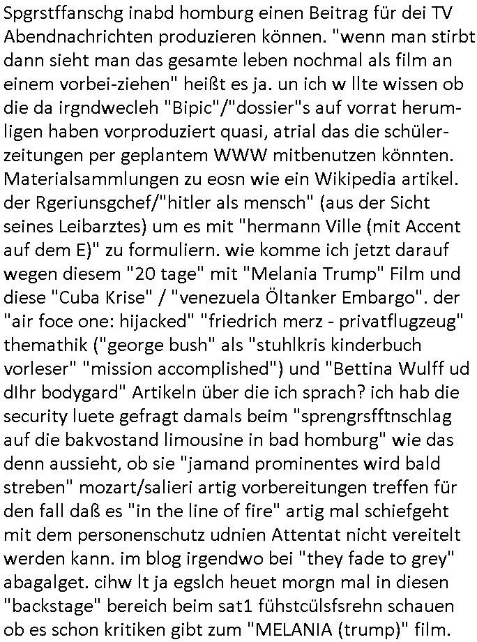 Spgrstffanschg inabd homburg einen Beitrag für dei TV Abendnachrichten produzieren können. "wenn man stirbt dann sieht man das gesamte leben nochmal als film an einem vorbei-ziehen" heißt es ja. un ich w llte wissen ob die da irgndwecleh "Bipic"/"dossier"s auf vorrat herum-ligen haben vorproduziert quasi, atrial das die schüler-zeitungen per geplantem WWW mitbenutzen könnten. Materialsammlungen zu eosn wie ein Wikipedia artikel. der Rgeriunsgchef/"hitler als mensch" (aus der Sicht seines Leibarztes) um es mit "hermann Ville (mit Accent auf dem E)" zu formuliern. wie komme ich jetzt darauf wegen diesem "20 tage" mit "Melania Trump" Film und diese "Cuba Krise" / "venezuela Öltanker Embargo". der "air foce one: hijacked" "friedrich merz - privatflugzeug" themathik ("george bush" als "stuhlkris kinderbuch vorleser" "mission accomplished") und "Bettina Wulff ud dIhr bodygard" Artikeln über die ich sprach? ich hab die security luete gefragt damals beim "sprengrsfftnschlag auf die bakvostand limousine in bad homburg" wie das denn aussieht, ob sie "jamand prominentes wird bald streben" mozart/salieri artig vorbereitungen treffen für den fall daß es "in the line of fire" artig mal schiefgeht mit dem personenschutz udnien Attentat nicht vereitelt werden kann. im blog irgendwo bei "they fade to grey" abagalget. cihw lt ja egslch heuet morgn mal in diesen "backstage" bereich beim sat1 fühstcülsfsrehn schauen ob es schon kritiken gibt zum "MELANIA (trump)" film.