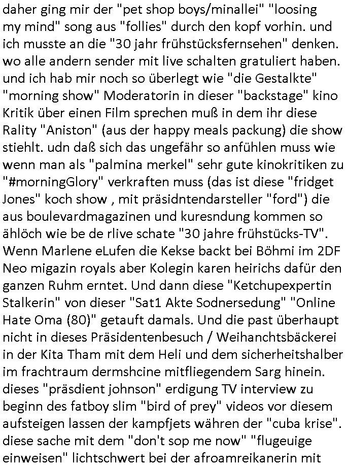 daher ging mir der "pet shop boys/minallei" "loosing my mind" song aus "follies" durch den kopf vorhin. und ich musste an die "30 jahr frühstücksfernsehen" denken. wo alle andern sender mit live schalten gratuliert haben. und ich hab mir noch so überlegt wie "die Gestalkte" "morning show" Moderatorin in dieser "backstage" kino Kritik über einen Film sprechen muß in dem ihr diese Rality "Aniston" (aus der happy meals packung) die show stiehlt. udn daß sich das ungefähr so anfühlen muss wie wenn man als "palmina merkel" sehr gute kinokritiken zu "#morningGlory" verkraften muss (das ist diese "fridget Jones" koch show , mit präsidntendarsteller "ford") die aus boulevardmagazinen und kuresndung kommen so ählöch wie be de rlive schate "30 jahre frühstücks-TV". Wenn Marlene eLufen die Kekse backt bei Böhmi im 2DF Neo migazin royals aber Kolegin karen heirichs dafür den ganzen Ruhm erntet. Und dann diese "Ketchupexpertin Stalkerin" von dieser "Sat1 Akte Sodnersedung" "Online Hate Oma (80)" getauft damals. Und die past überhaupt nicht in dieses Präsidentenbesuch / Weihanchtsbäckerei in der Kita Tham mit dem Heli und dem sicherheitshalber im frachtraum dermshcine mitfliegendem Sarg hinein. dieses "präsdient johnson" erdigung TV interview zu beginn des fatboy slim "bird of prey" videos vor diesem aufsteigen lassen der kampfjets währen der "cuba krise". diese sache mit dem "don't sop me now" "flugeuige einweisen" lichtschwert bei der afroamreikanerin mit